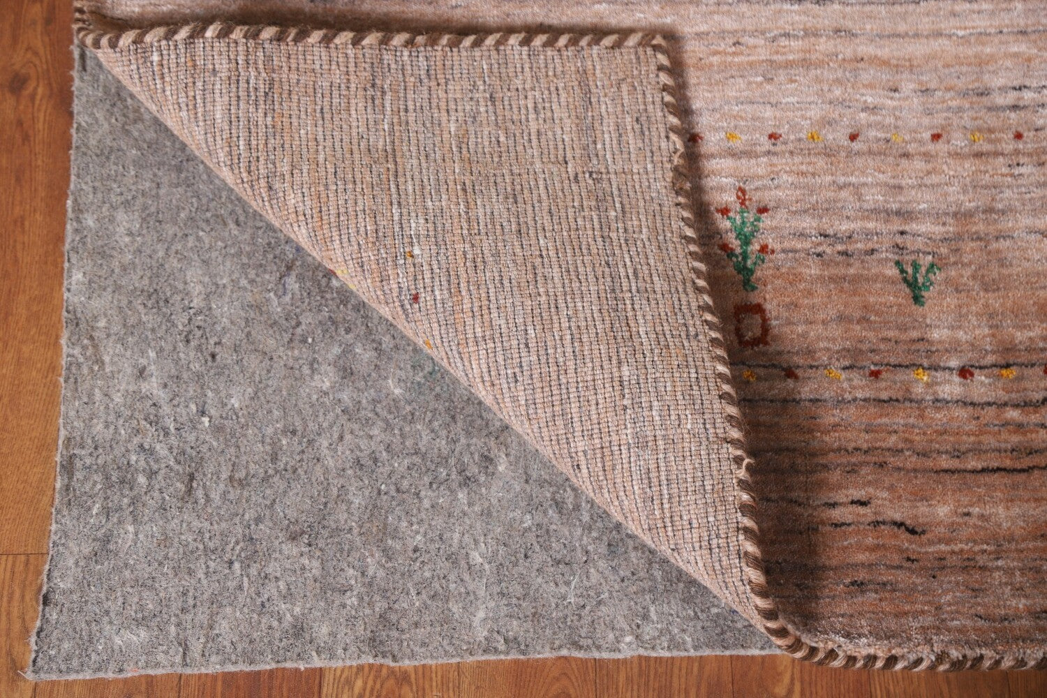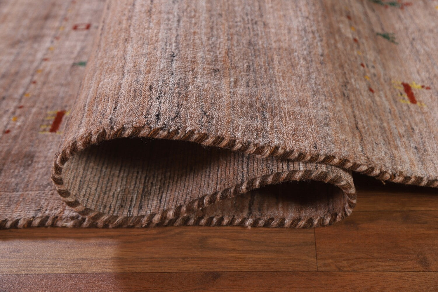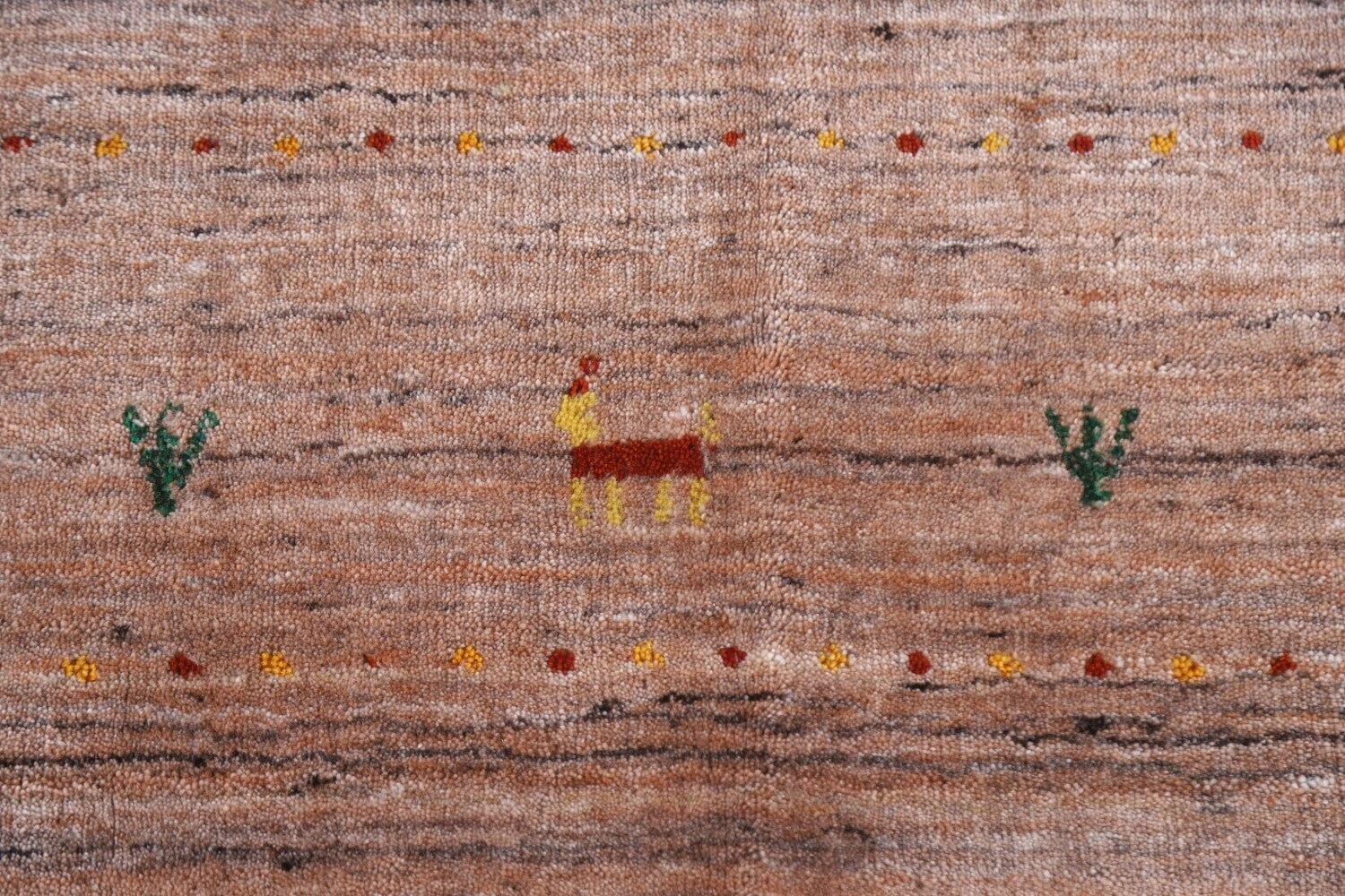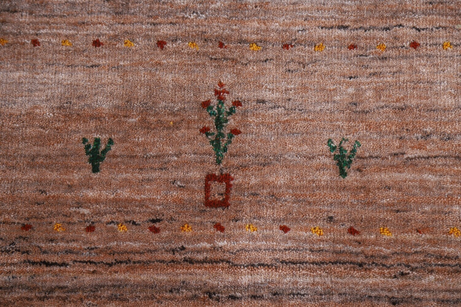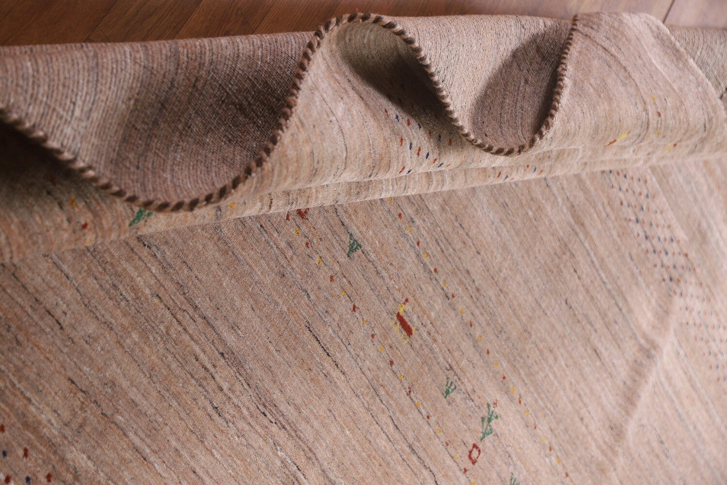 A Beautiful Genuine India Gabbeh rug is Hand Knotted by skillful weavers in India with 100% Wool Material. This rug is in New, First Quality condition. dimensions are 9' 9'' X 7' 11'' in foot and 297 X 241 in centimeter. the primary color is Peach.