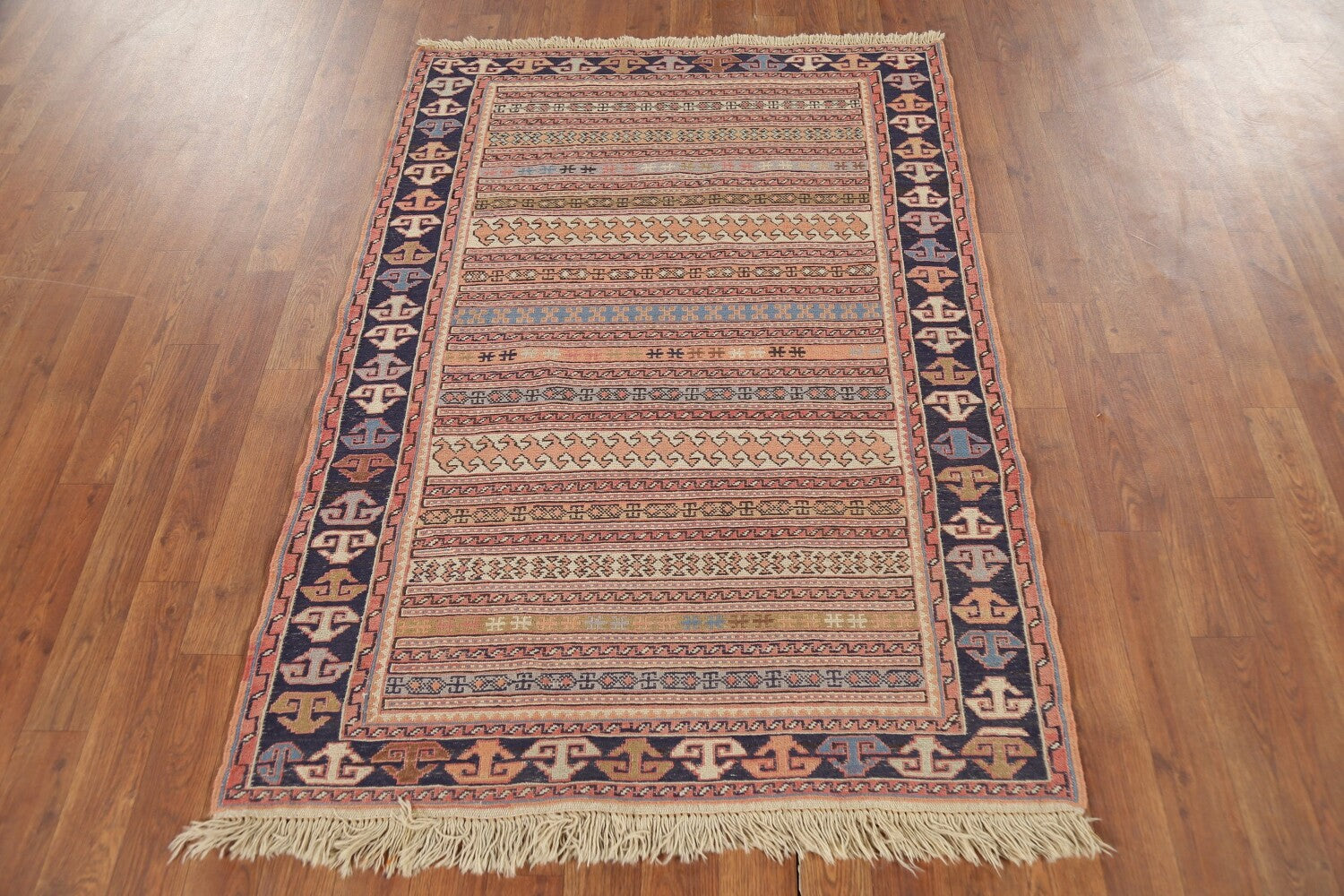 A Beautiful Genuine Persia ( Persia ) Kilim rug is Hand Woven by skillful weavers in Persia ( Persia ) with 100% Wool Material. This rug is in Excellent condition. dimensions are 4' 8'' X 3' 3'' in foot and 142 X 99 in centimeter. the primary color is Multi-Colored.