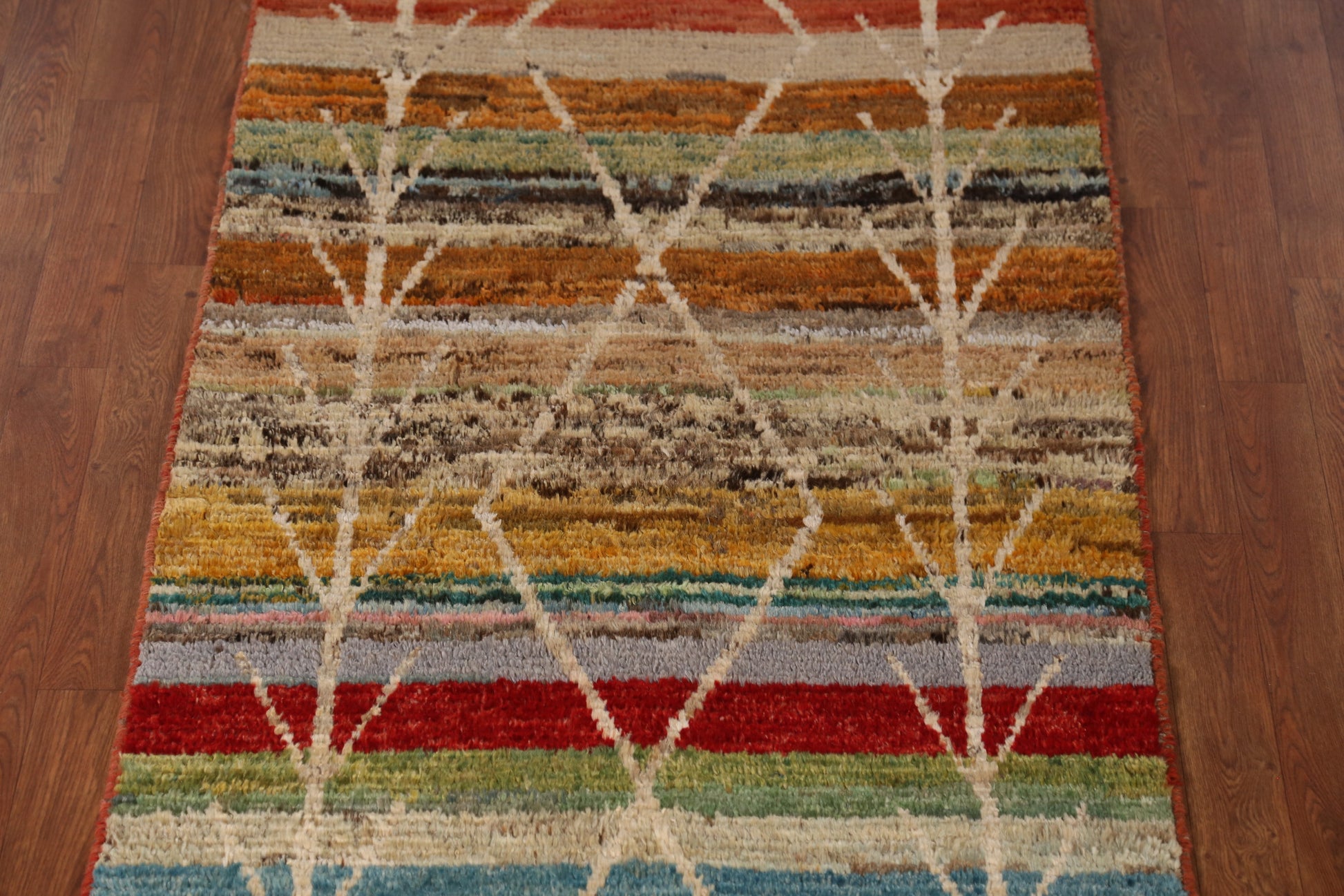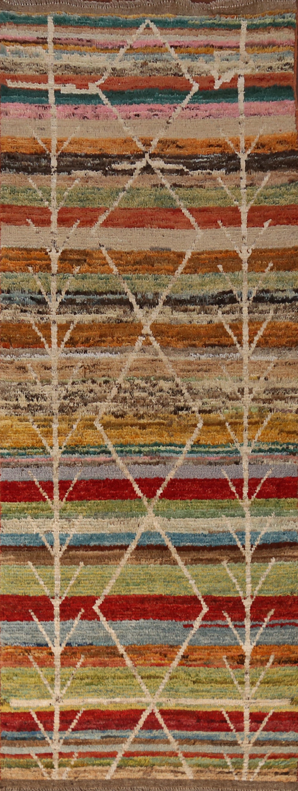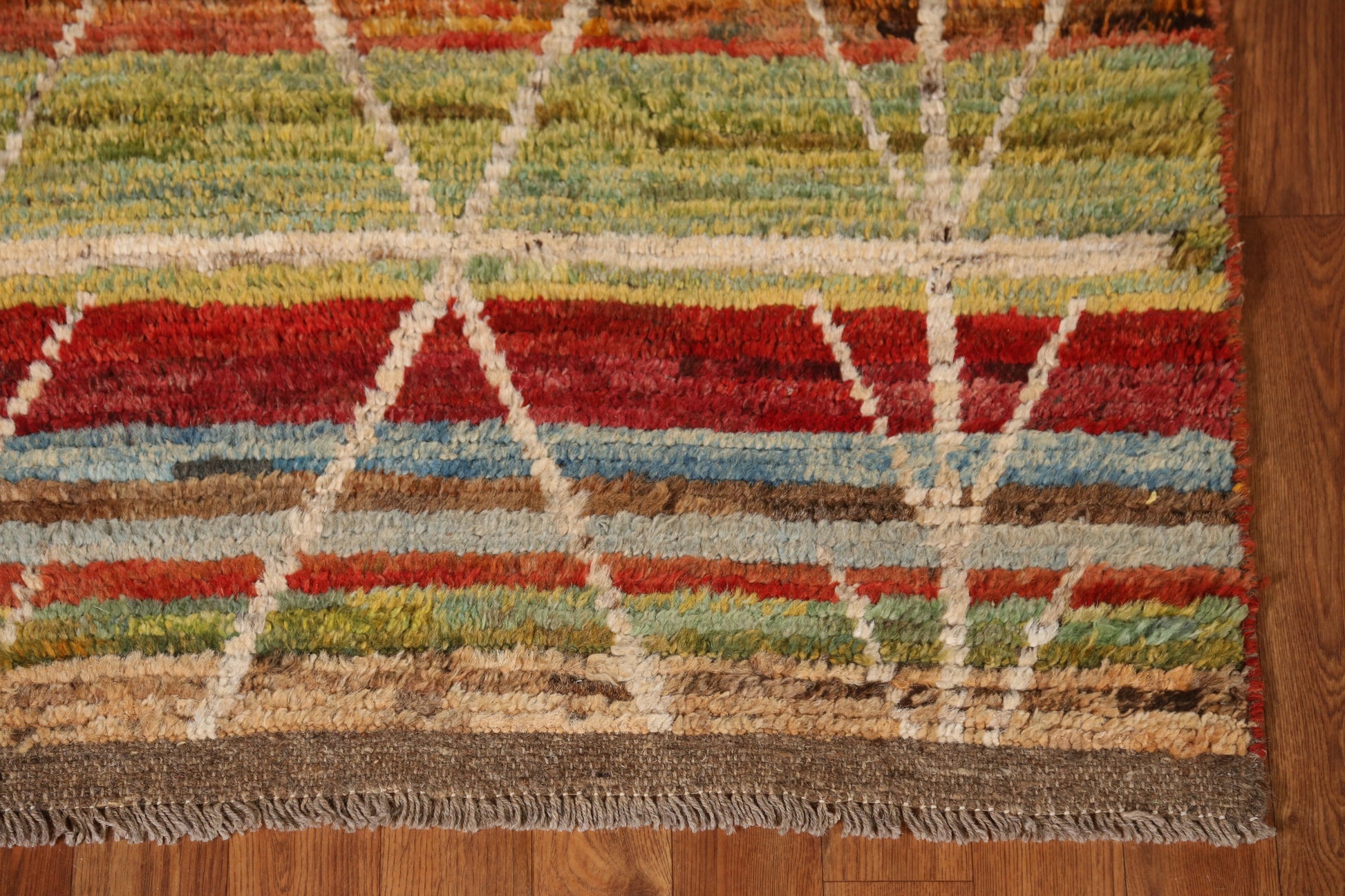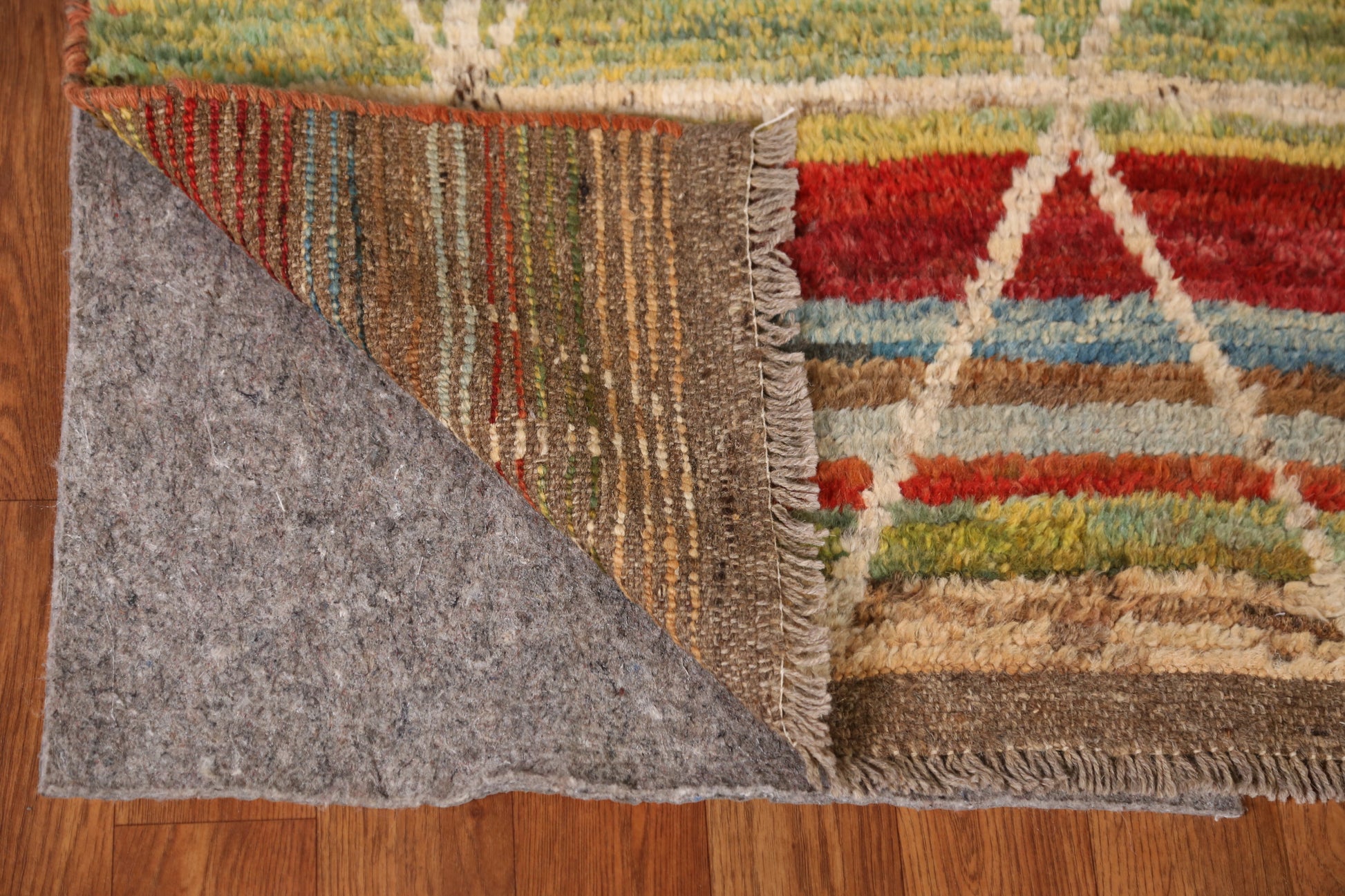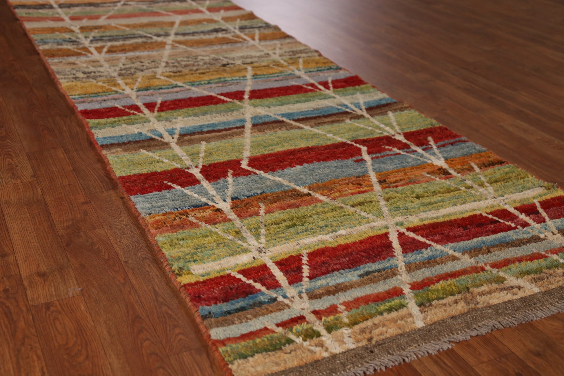 A Beautiful Genuine Pakistan Moroccan rug is Hand Knotted by skillful weavers in Pakistan with 100% Wool Material. This rug is in New, First Quality condition. dimensions are 9' 7'' X 3' 1'' in foot and 292 X 94 in centimeter. the primary color is Multi-Colored.