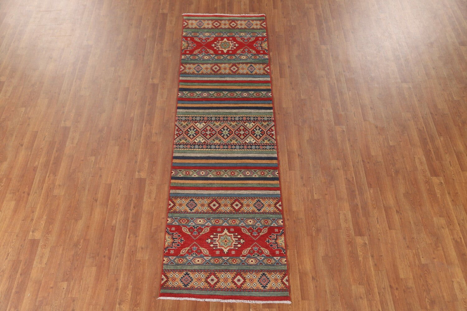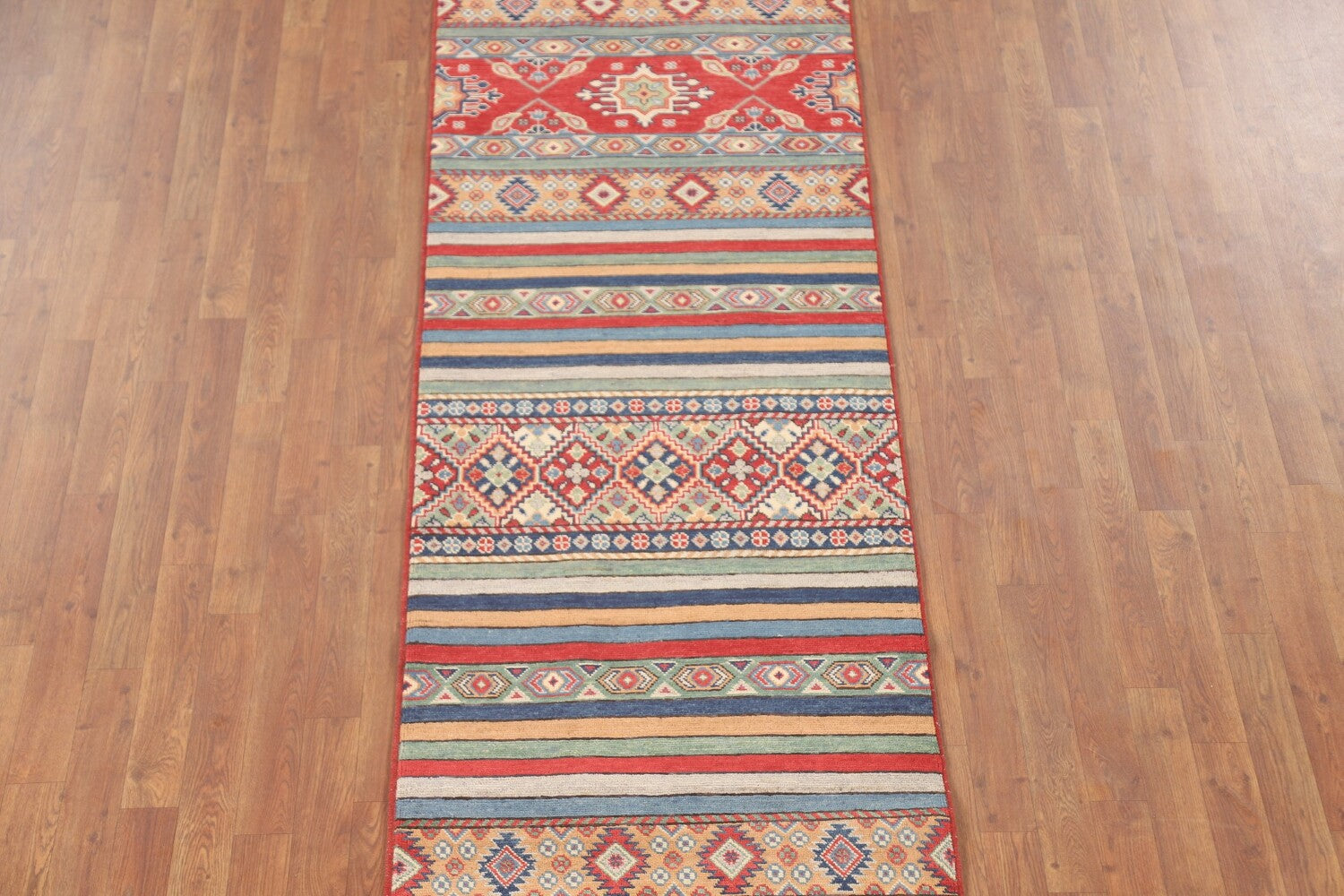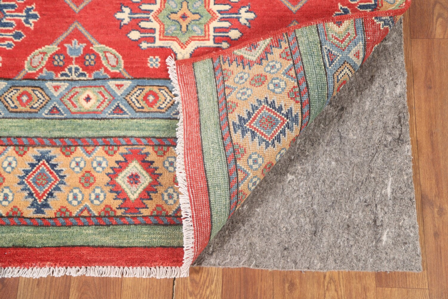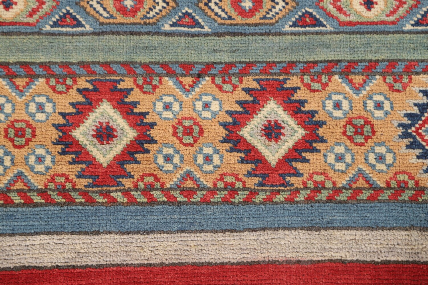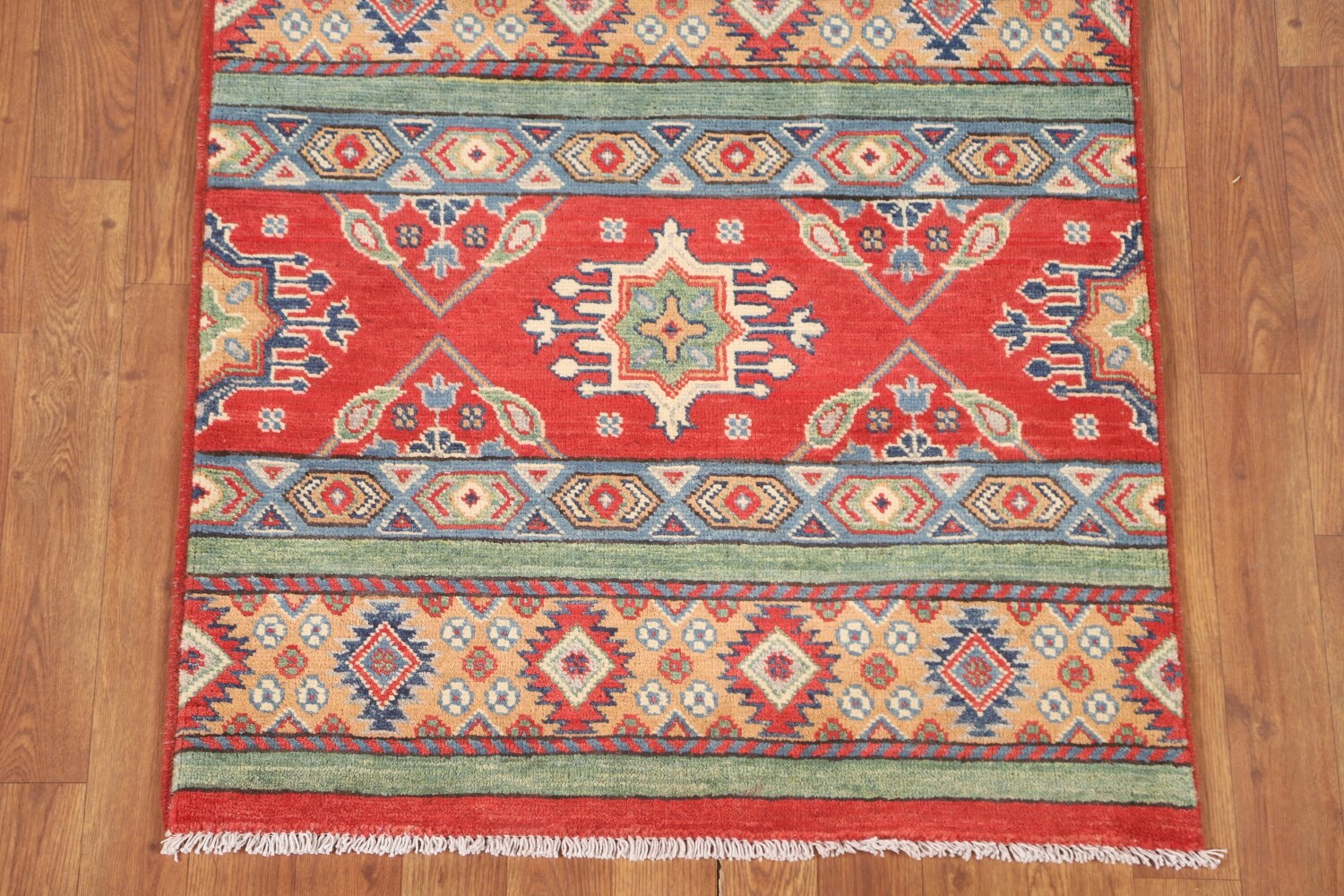 A Beautiful Genuine Pakistan Kazak rug is Hand Knotted by skillful weavers in Pakistan with 100% Wool Material. This rug is in New, First Quality condition. dimensions are 9' 5'' X 2' 8'' in foot and 287 X 81 in centimeter. the primary color is Multi-Colored.