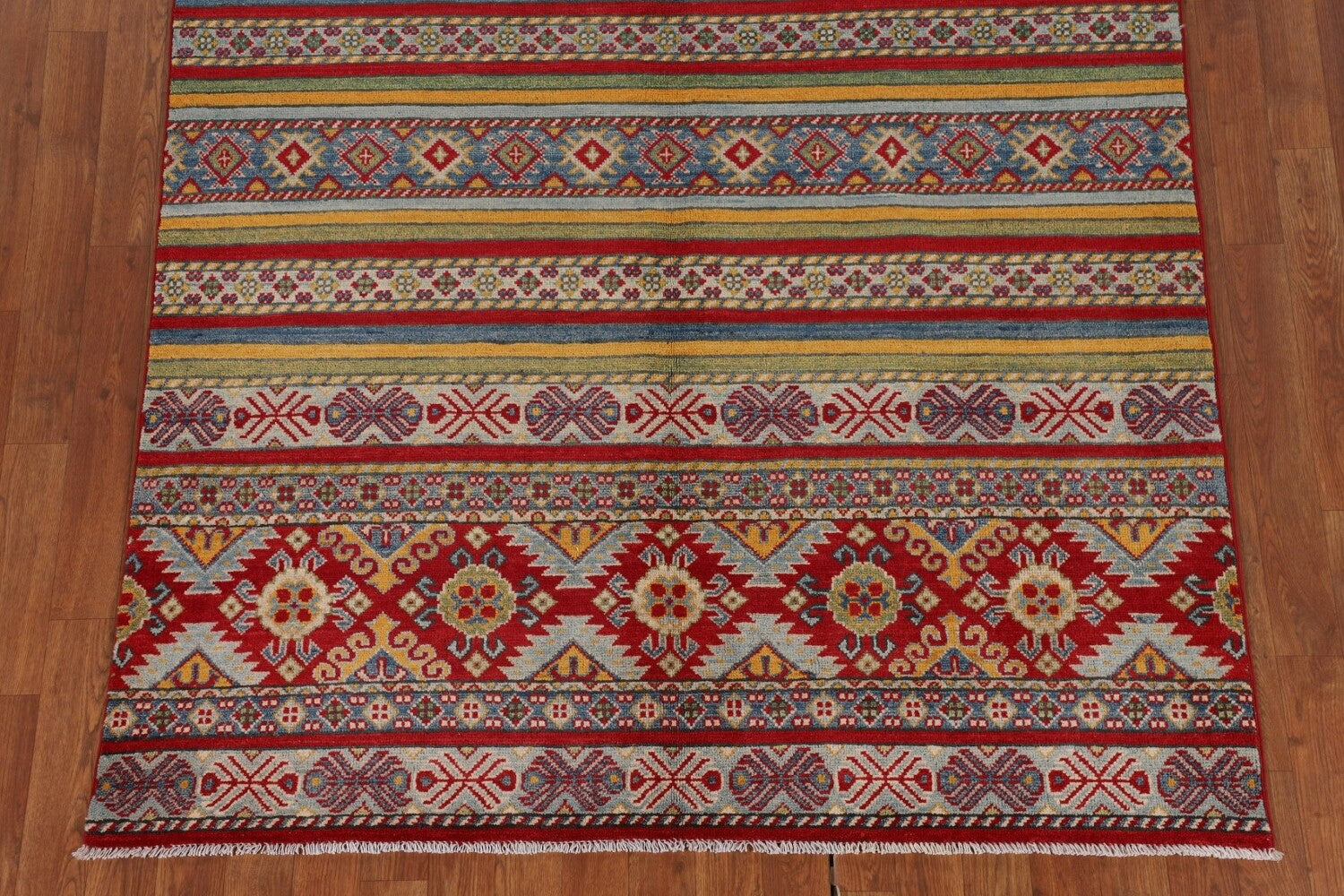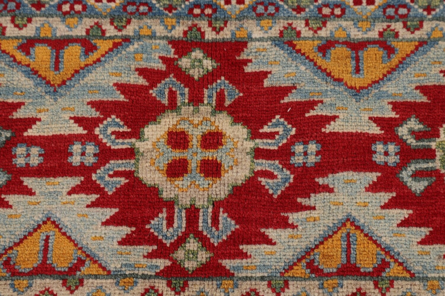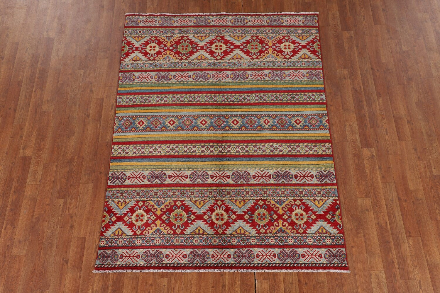 A Beautiful Genuine Pakistan Kazak rug is Hand Knotted by skillful weavers in Pakistan with 100% Wool Material. This rug is in New, First Quality condition. dimensions are 6' 6'' X 4' 10'' in foot and 198 X 147 in centimeter. the primary color is Multi-Colored.