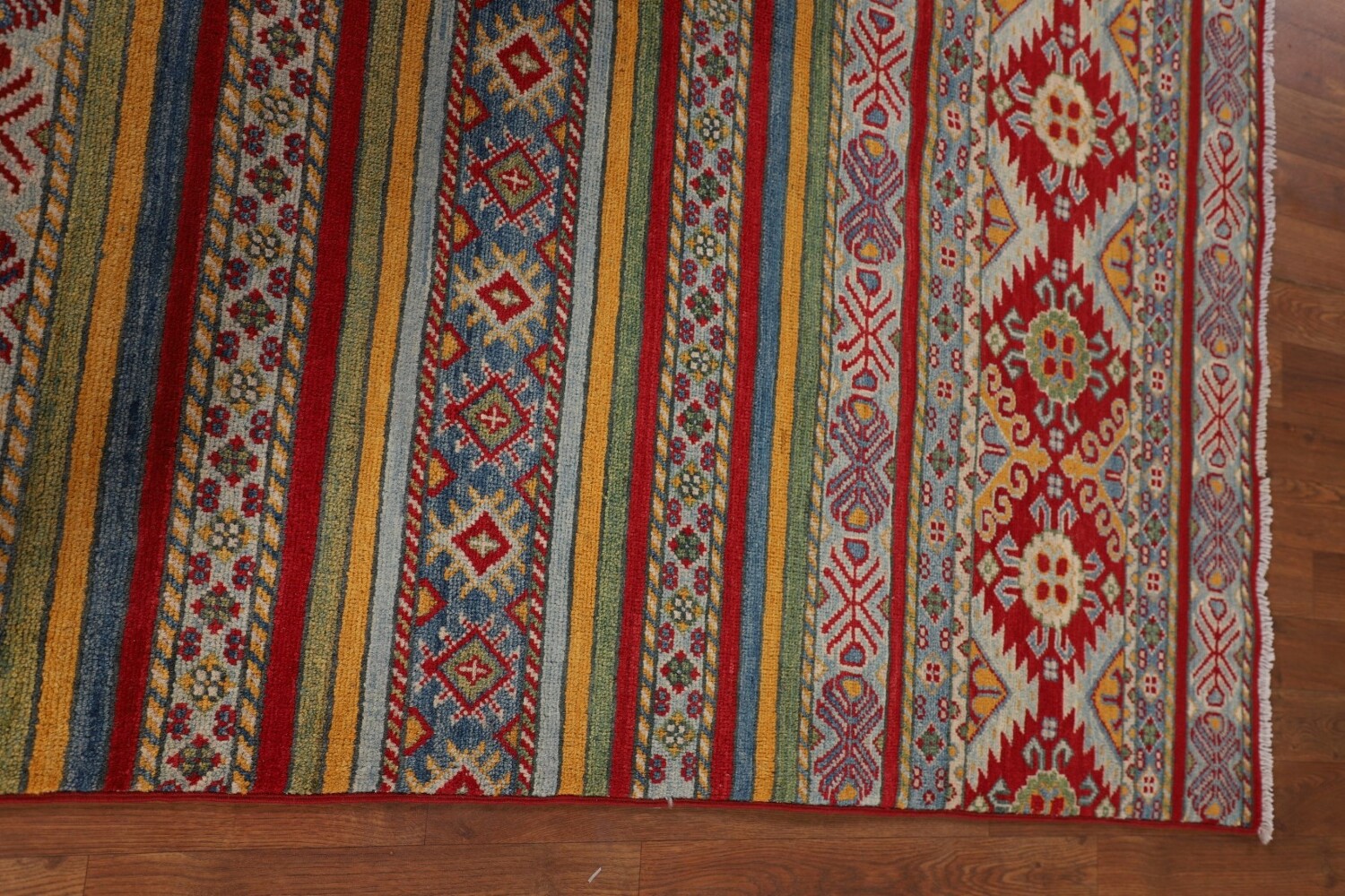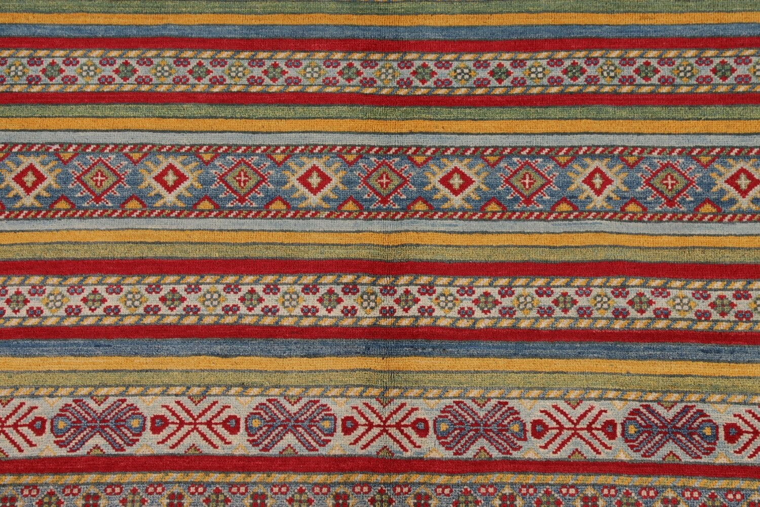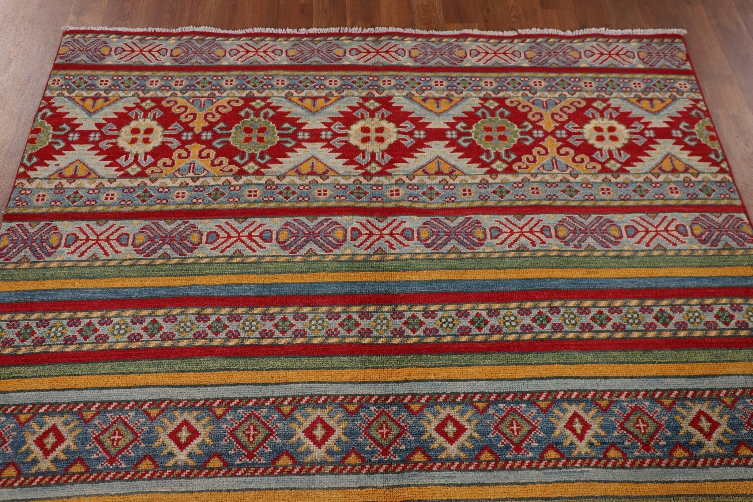 A Beautiful Genuine Pakistan Kazak rug is Hand Knotted by skillful weavers in Pakistan with 100% Wool Material. This rug is in New, First Quality condition. dimensions are 6' 6'' X 4' 10'' in foot and 198 X 147 in centimeter. the primary color is Multi-Colored.