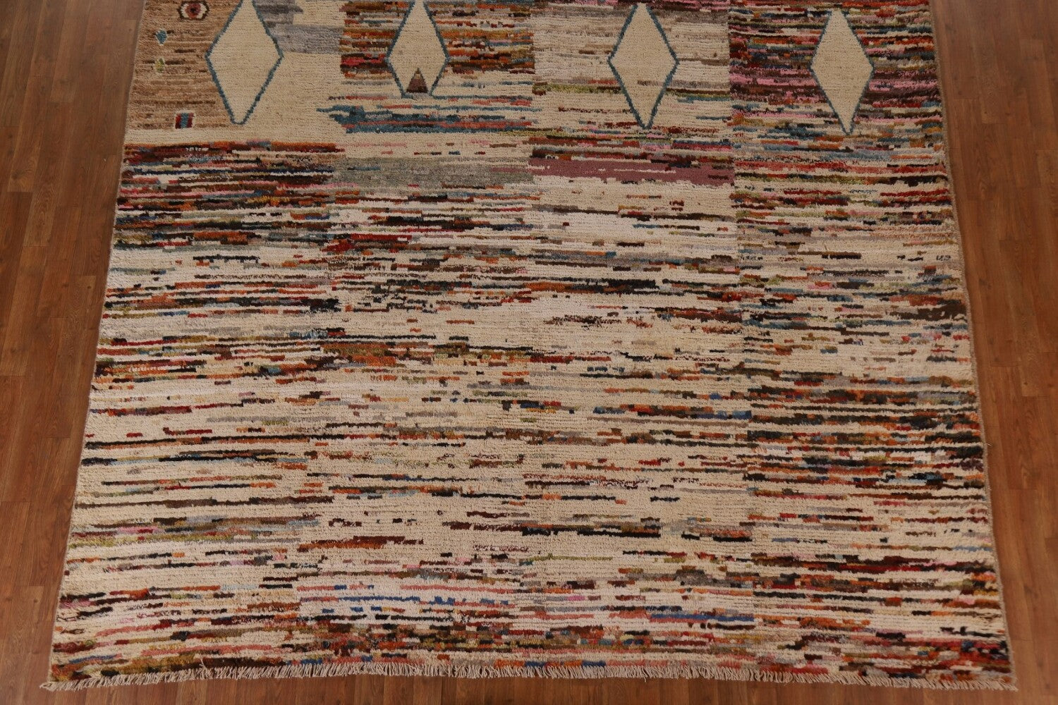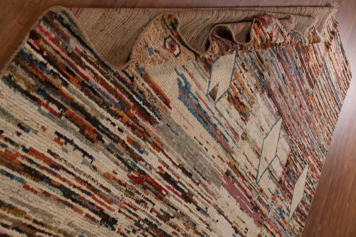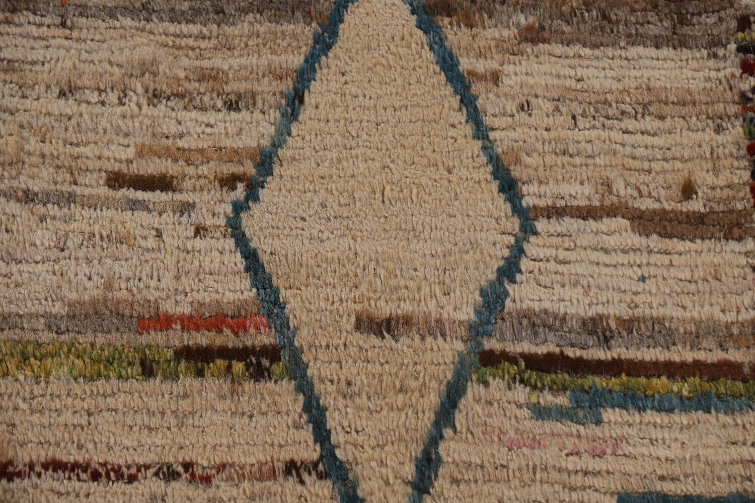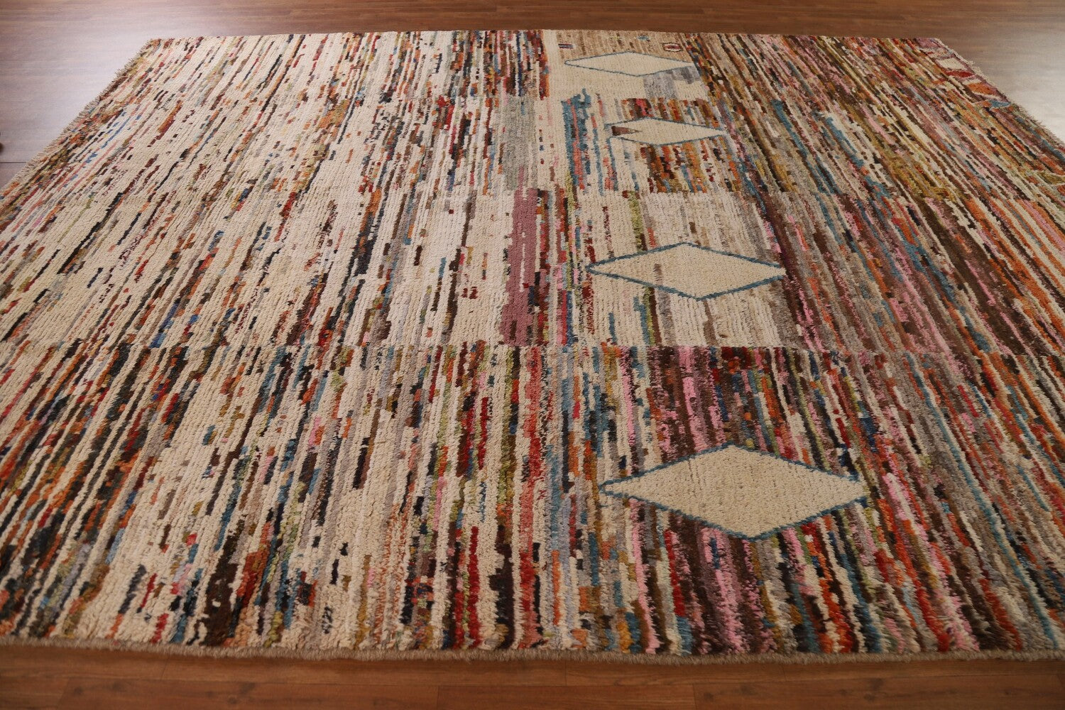 A Beautiful Genuine Pakistan Moroccan rug is Hand Knotted by skillful weavers in Pakistan with 100% Wool Material. This rug is in condition. dimensions are 11' 8'' X 9' 1'' in foot and 356 X 277 in centimeter. the primary color is Beige & Ivories.