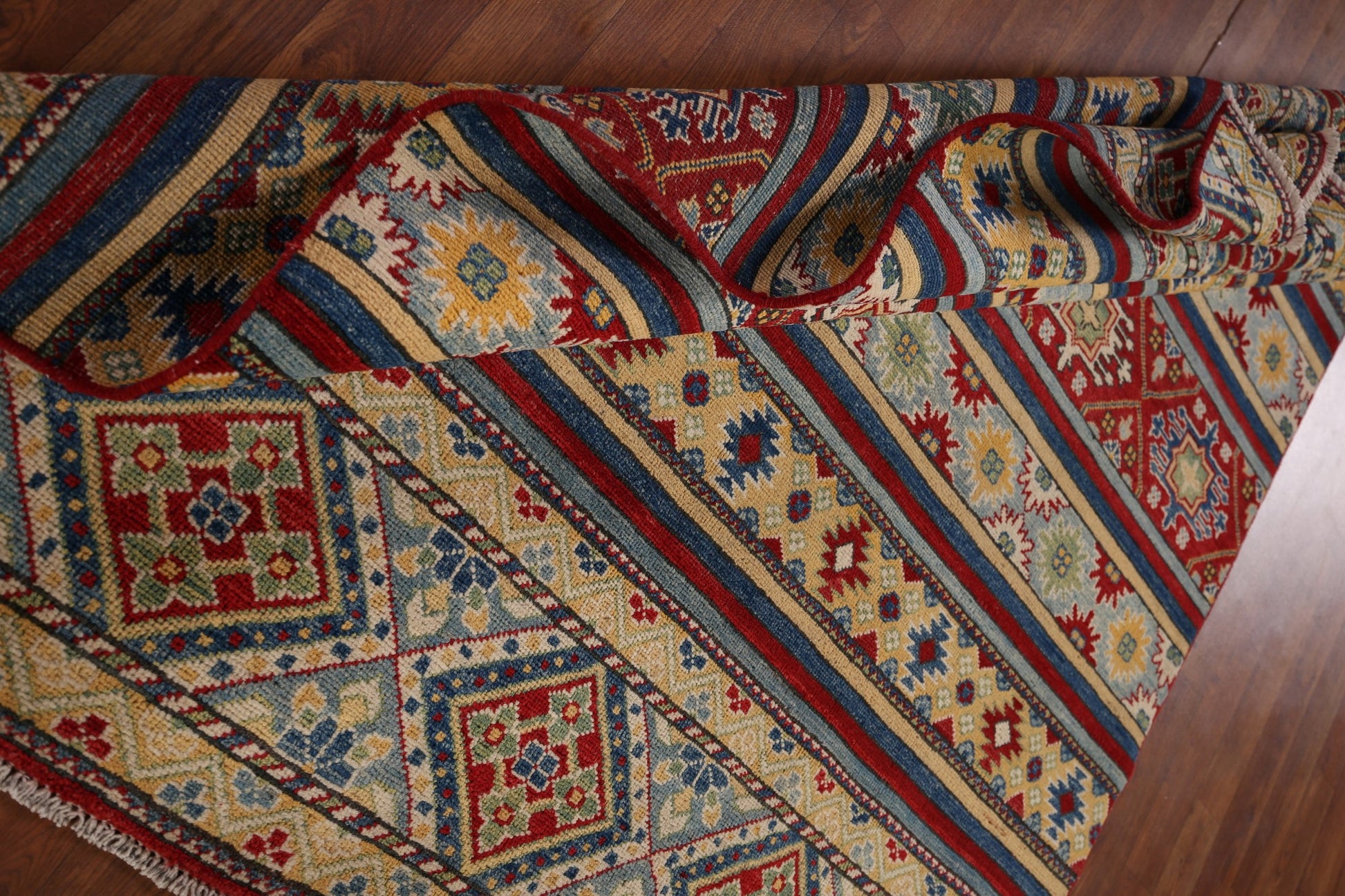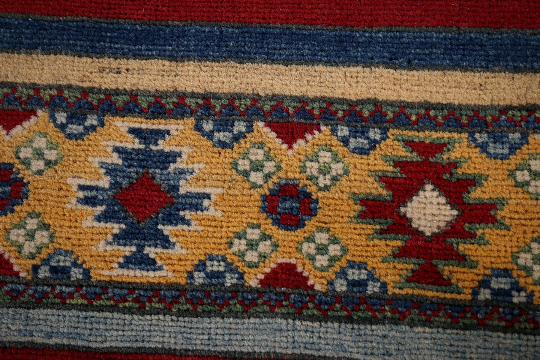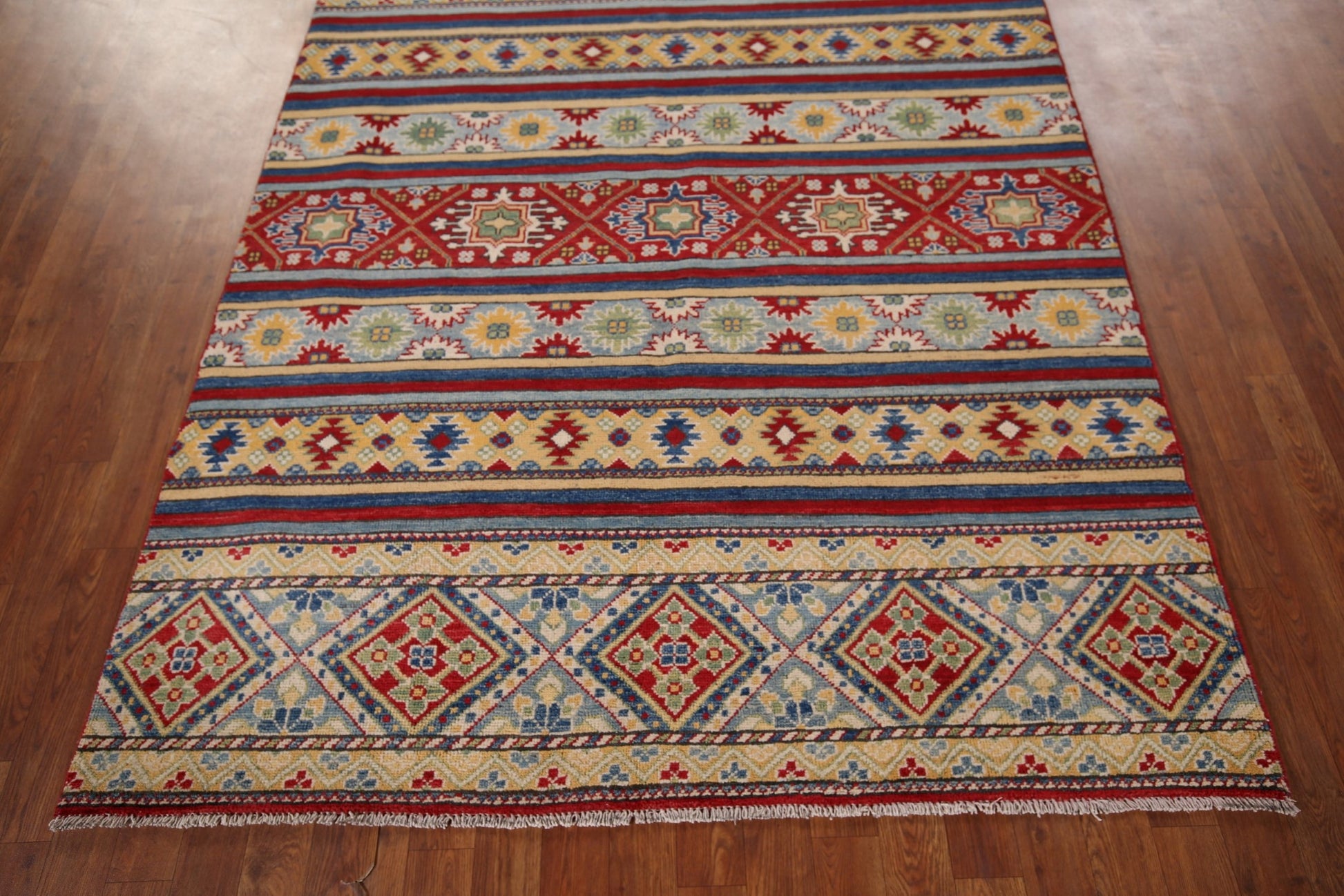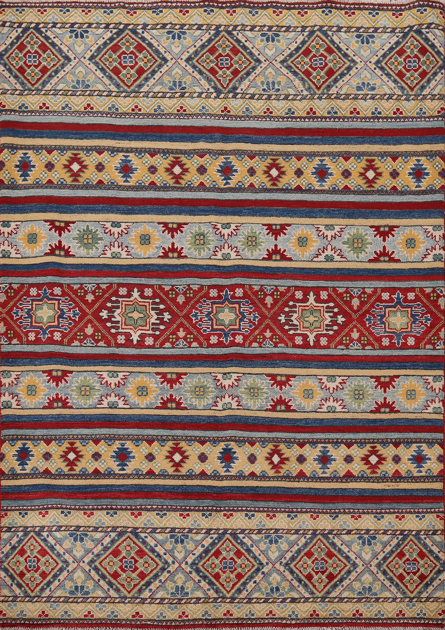 A Beautiful Genuine Pakistan Kazak rug is Hand Knotted by skillful weavers in Pakistan with 100% Wool Material. This rug is in New, First Quality condition. dimensions are 6' 8'' X 5' 2'' in foot and 203 X 157 in centimeter. the primary color is Multi-Colored.