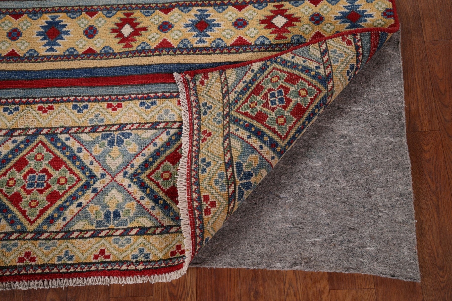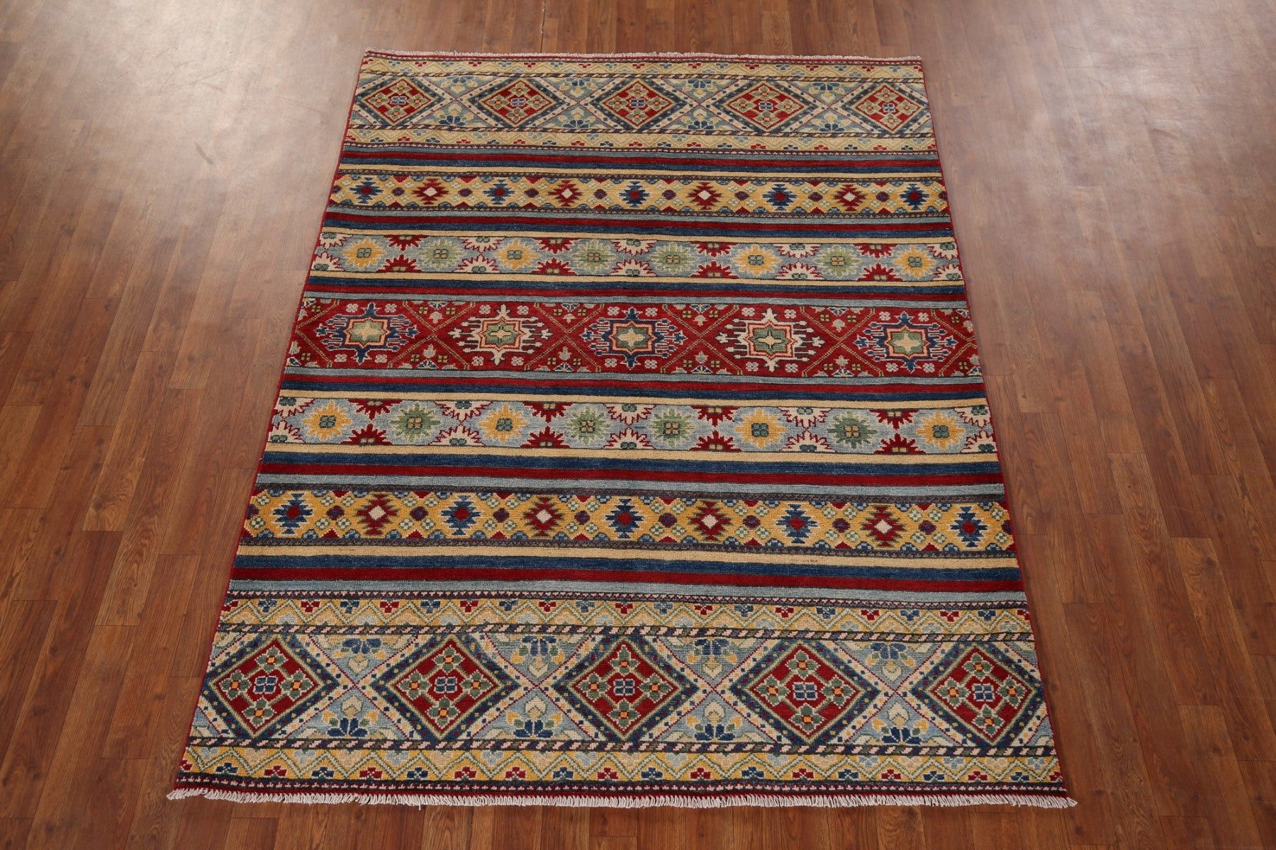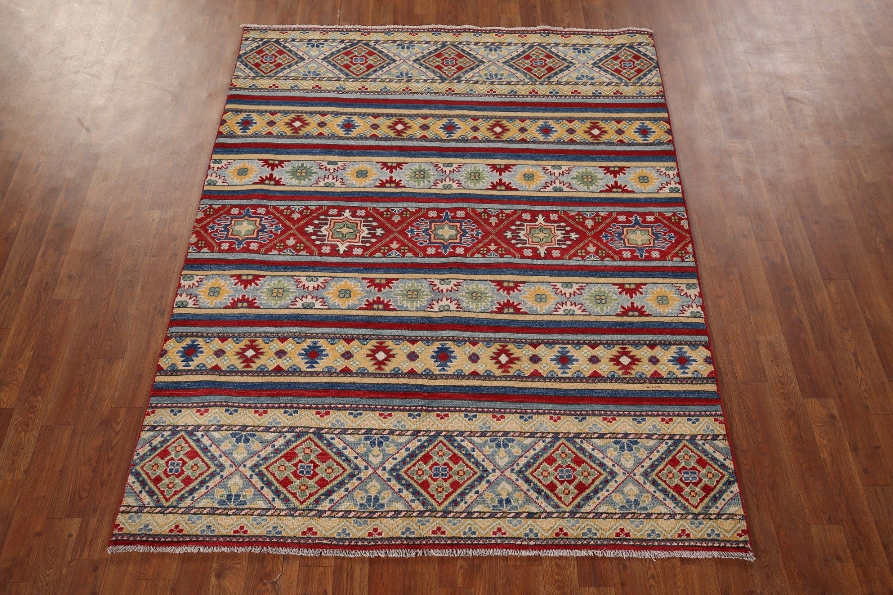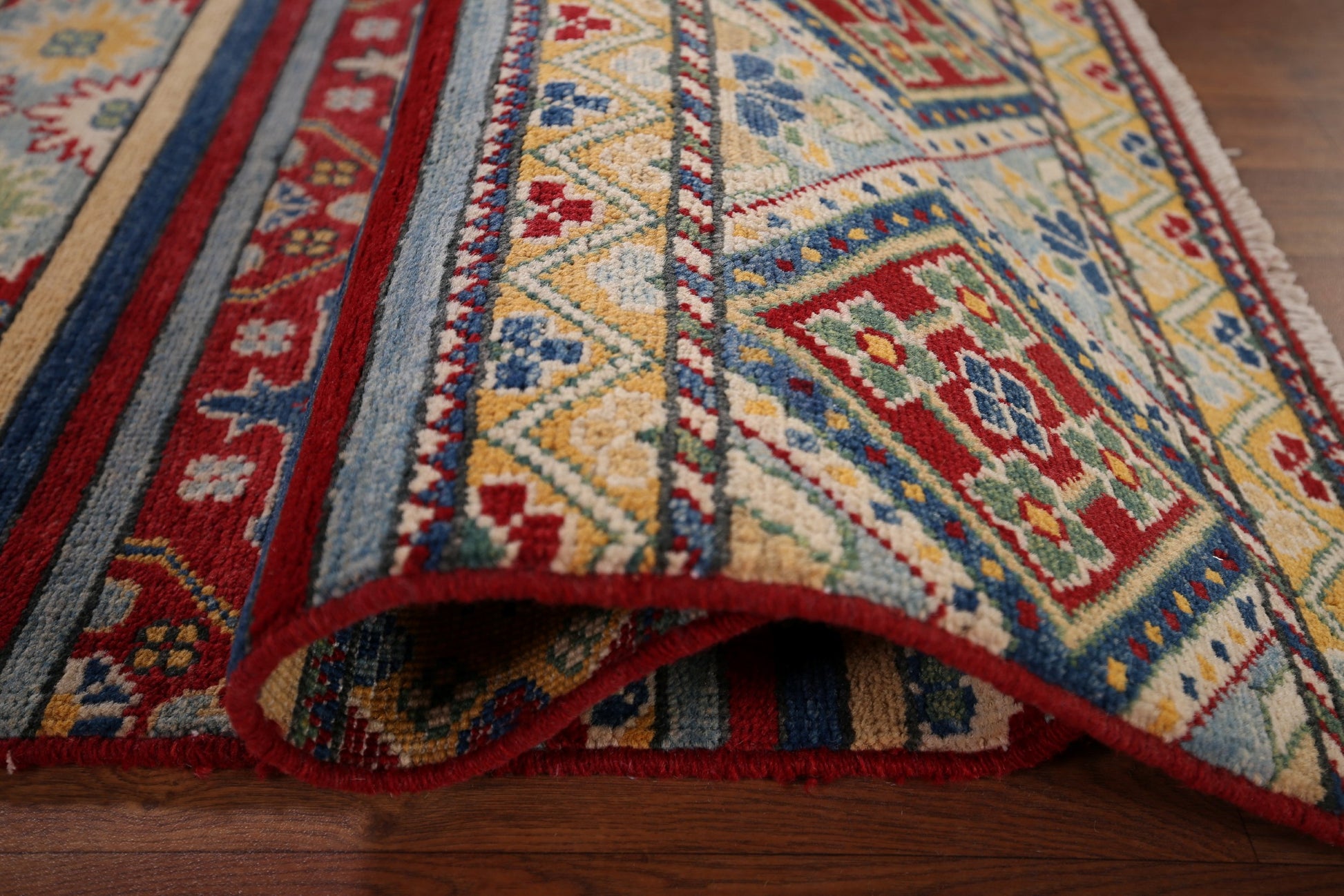 A Beautiful Genuine Pakistan Kazak rug is Hand Knotted by skillful weavers in Pakistan with 100% Wool Material. This rug is in New, First Quality condition. dimensions are 6' 8'' X 5' 2'' in foot and 203 X 157 in centimeter. the primary color is Multi-Colored.
