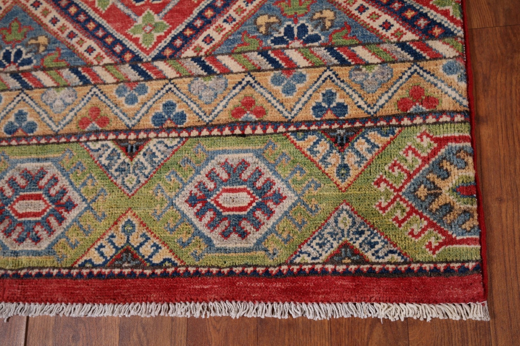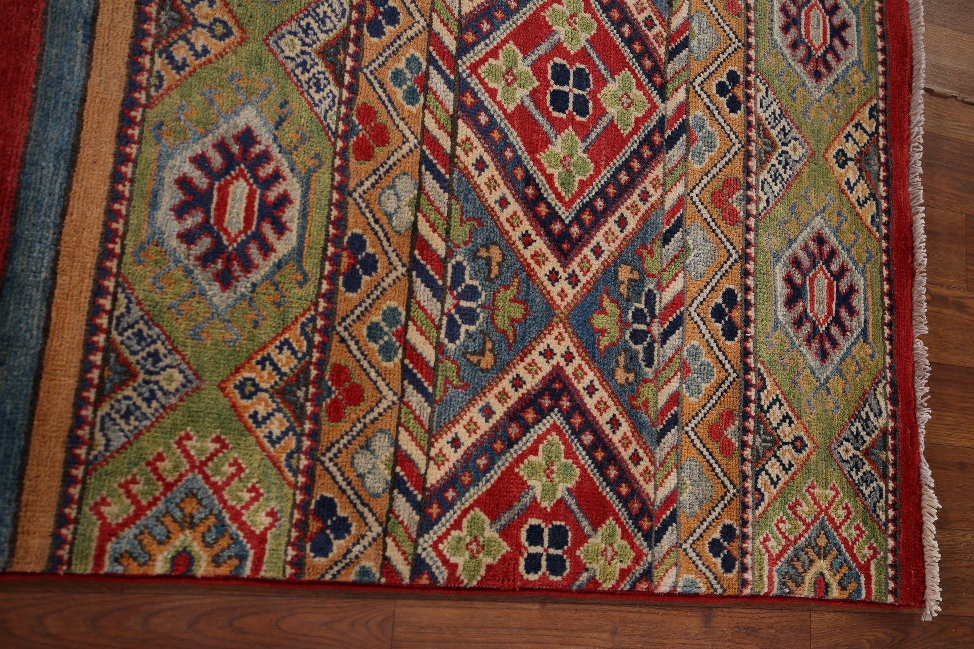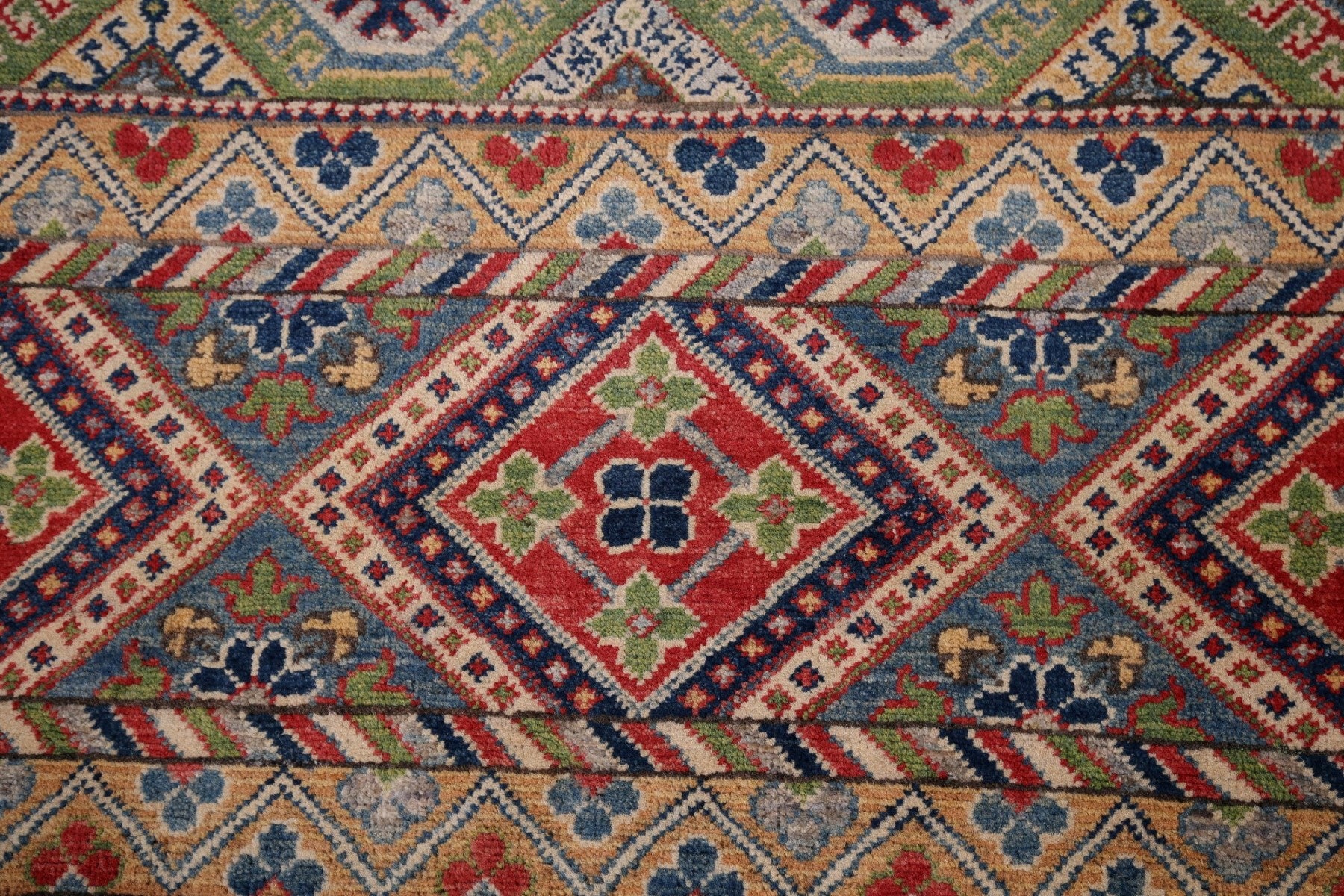 A Beautiful Genuine Pakistan Kazak rug is Hand Knotted by skillful weavers in Pakistan with 100% Wool Material. This rug is in New, First Quality condition. dimensions are 9' 5'' X 2' 8'' in foot and 287 X 81 in centimeter. the primary color is Multi-Colored.