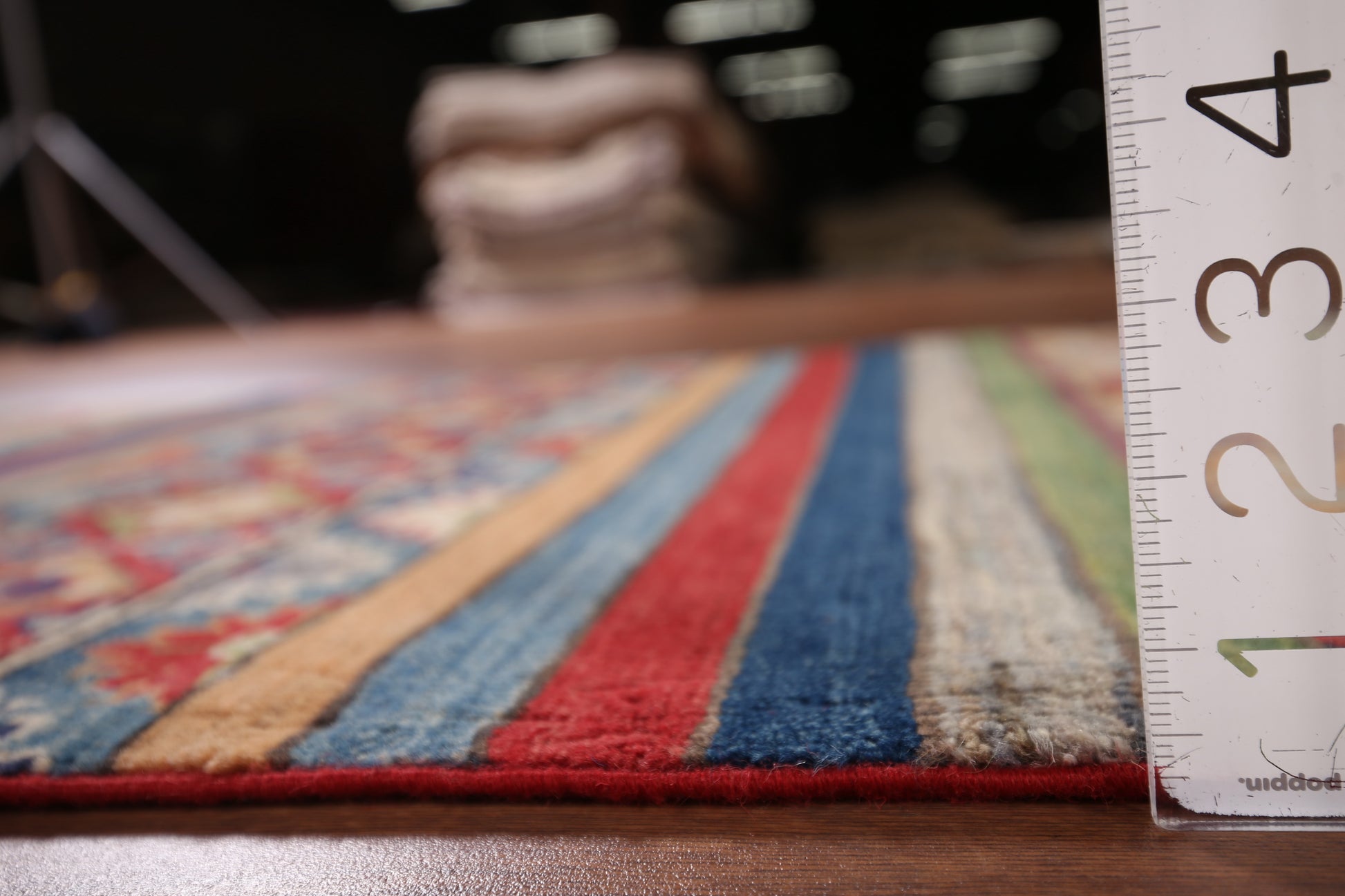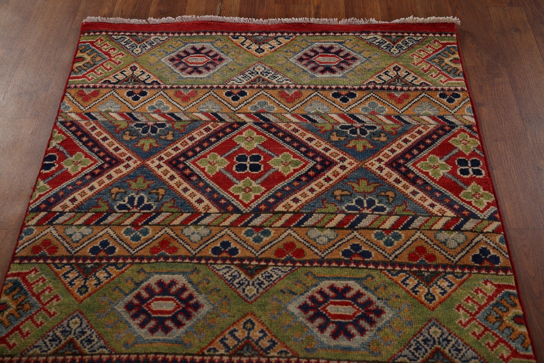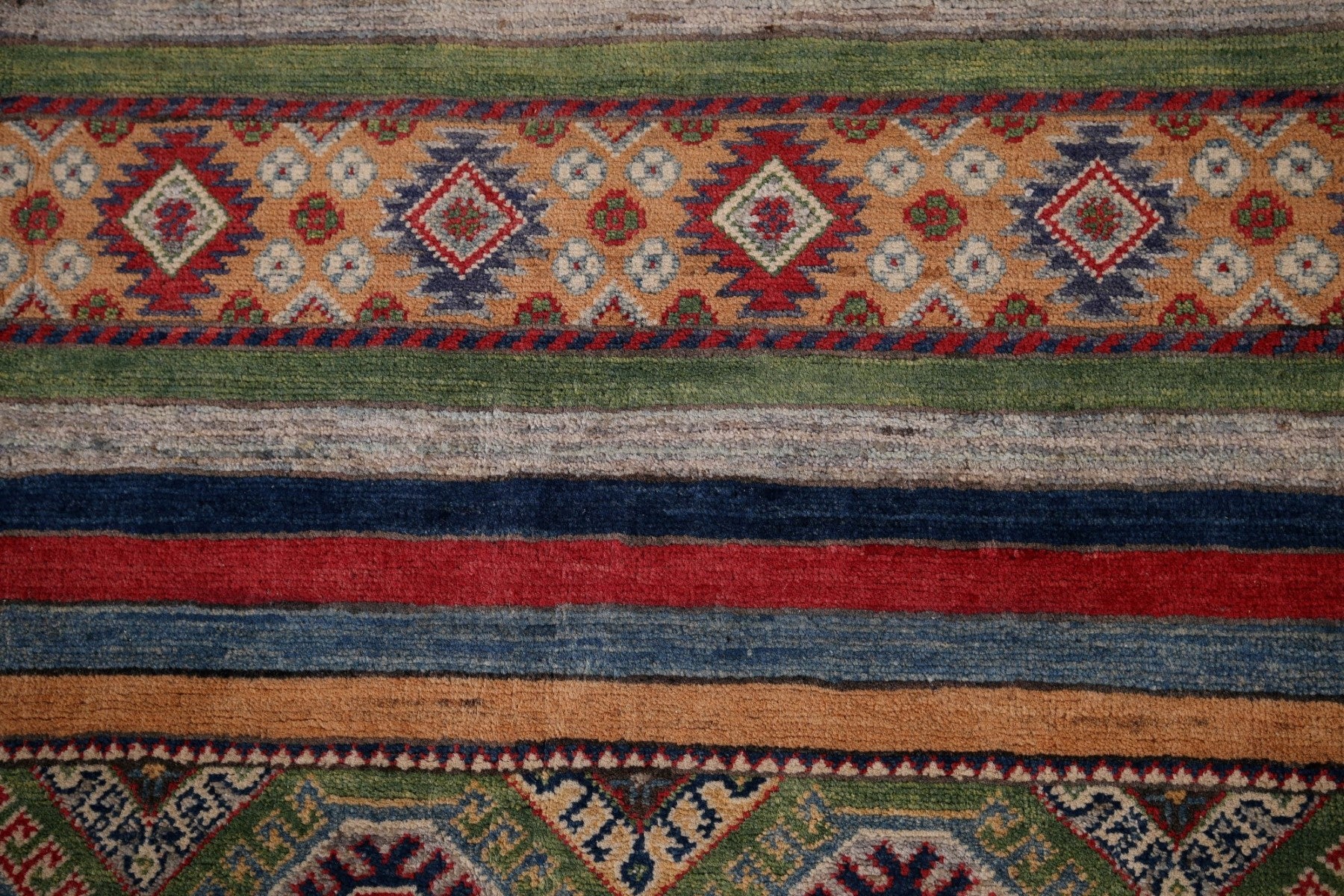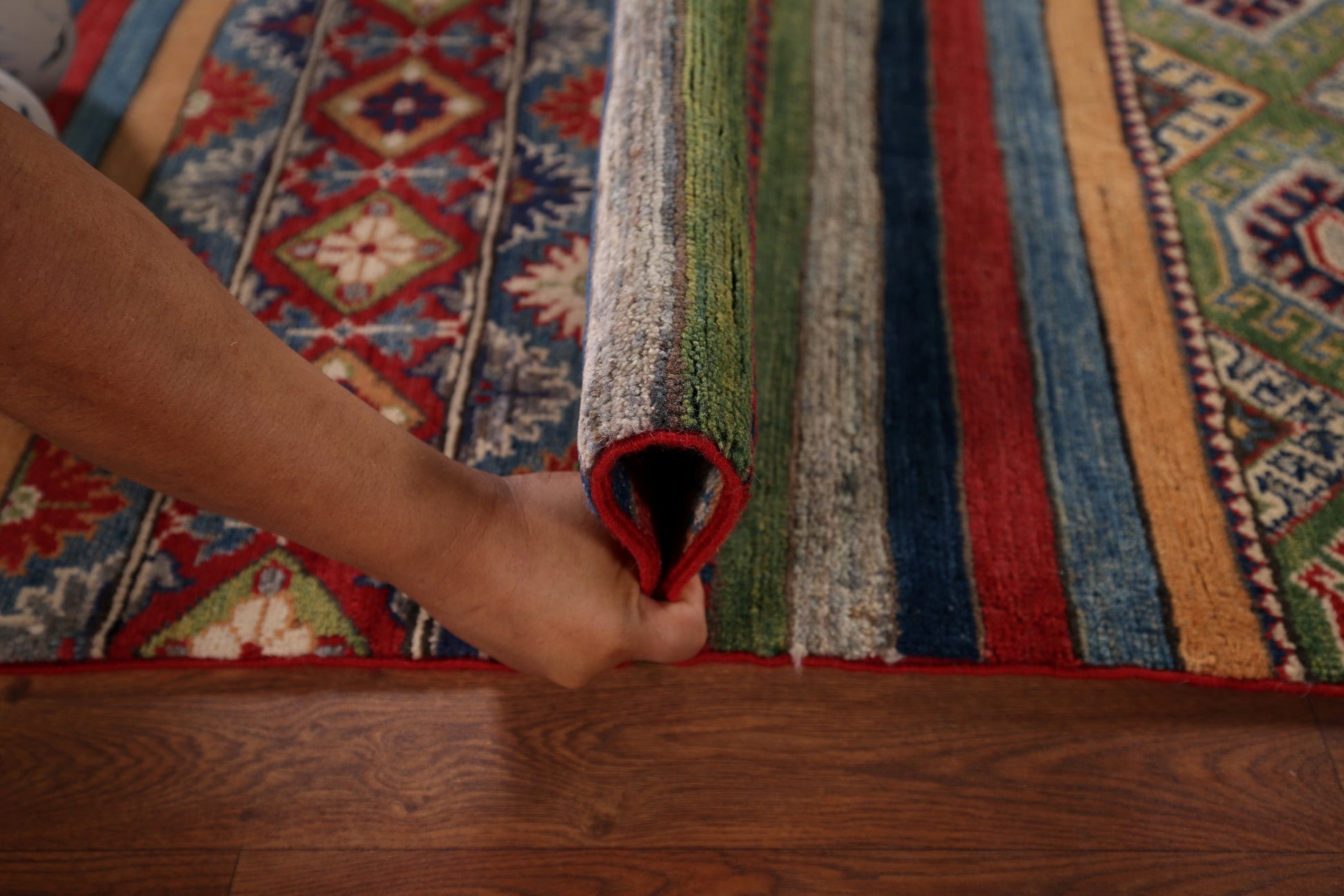 A Beautiful Genuine Pakistan Kazak rug is Hand Knotted by skillful weavers in Pakistan with 100% Wool Material. This rug is in New, First Quality condition. dimensions are 9' 5'' X 2' 8'' in foot and 287 X 81 in centimeter. the primary color is Multi-Colored.