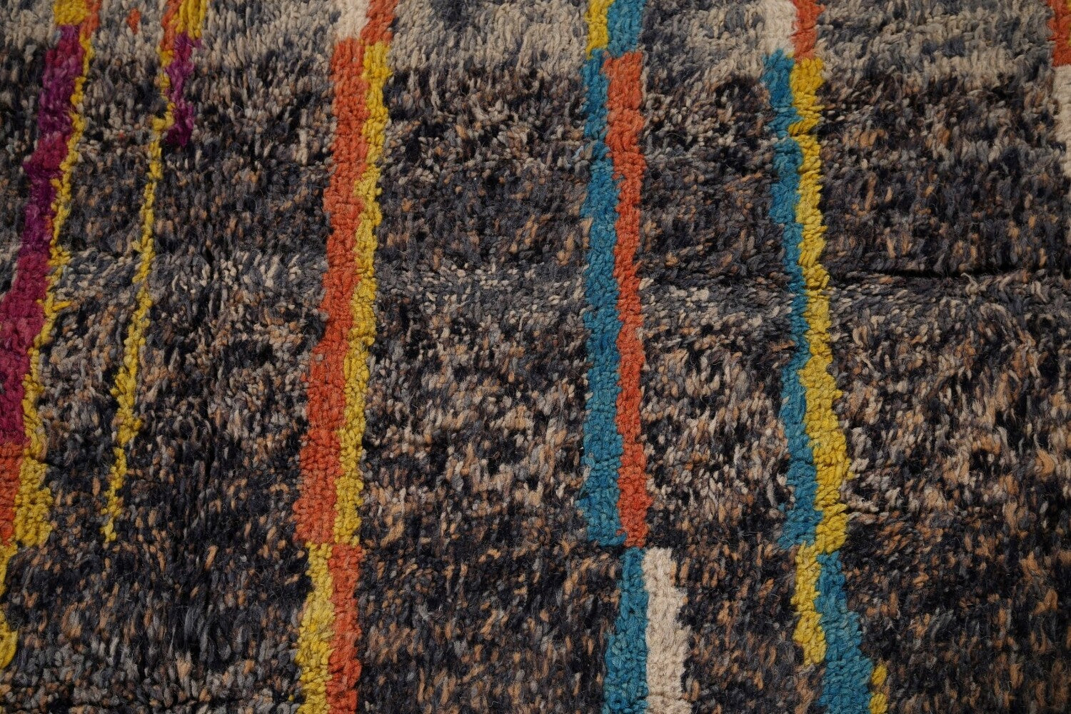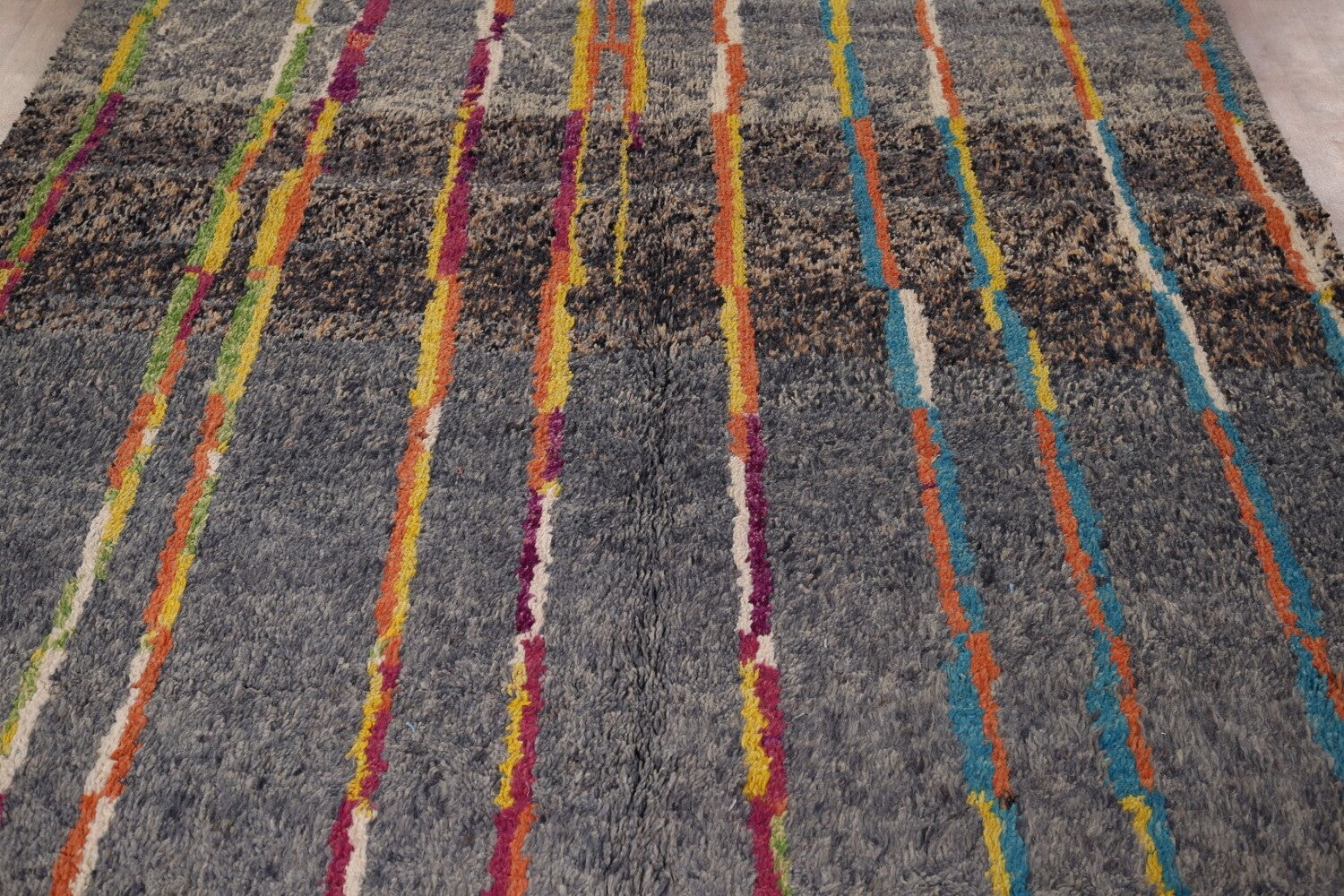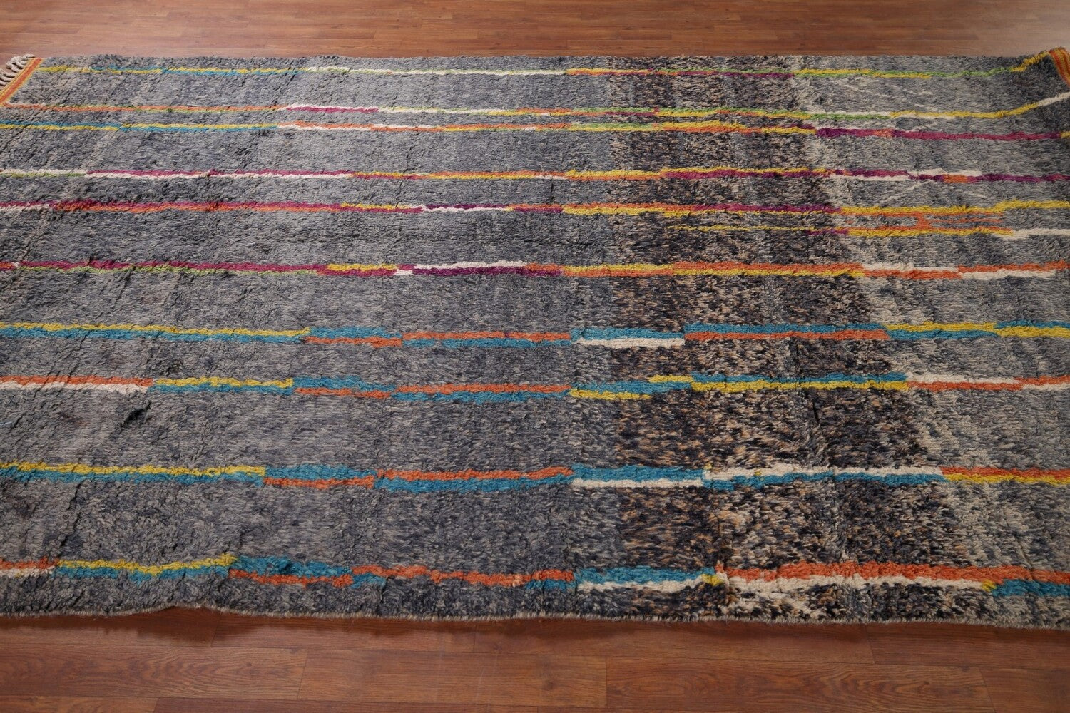 A Beautiful Genuine Pakistan Moroccan rug is Hand Knotted by skillful weavers in Pakistan with 100% Wool Material. This rug is in condition. dimensions are 10' 5'' X 6' 9'' in foot and 318 X 206 in centimeter. the primary color is Greys & Charcoal.