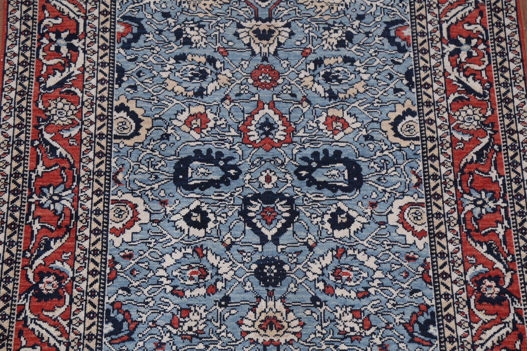 A Beautiful Genuine Turkey Sultanabad (Ziegler) rug is Hand Knotted by skillful weavers in Turkey with 100% Wool Material. This rug is in New, First Quality condition. dimensions are 5' 10'' X 3' 11'' in foot and 178 X 119 in centimeter. the primary color is Navy Blue & Blues.
