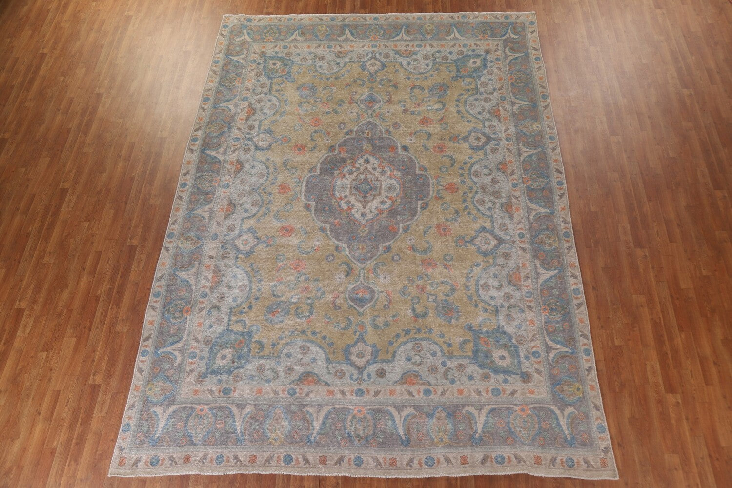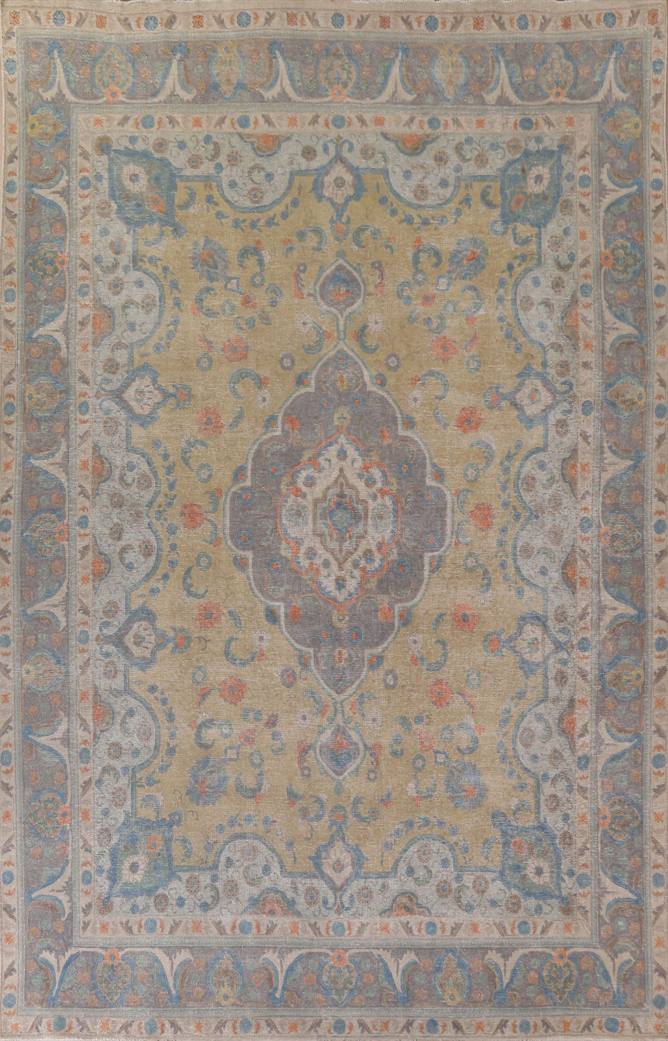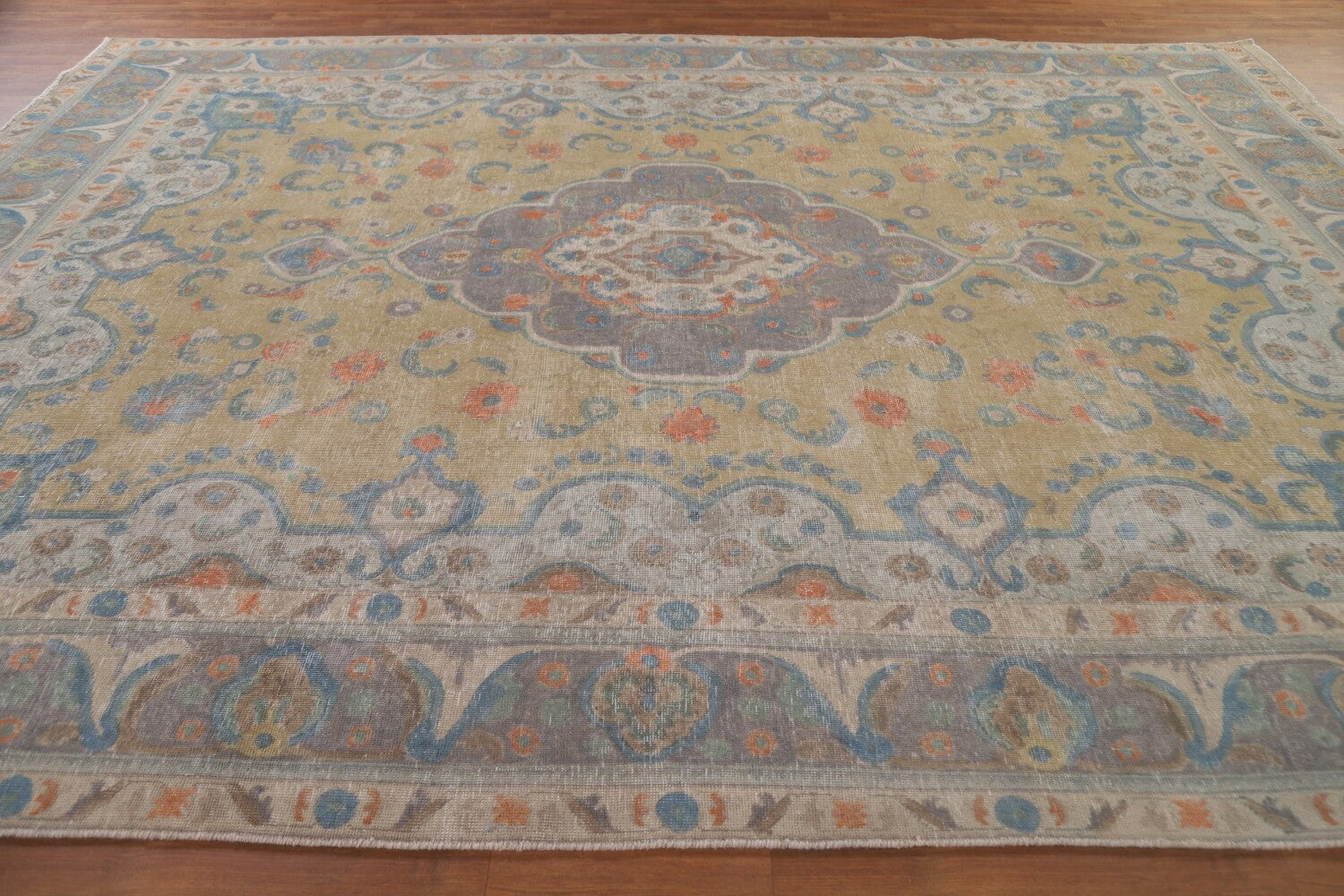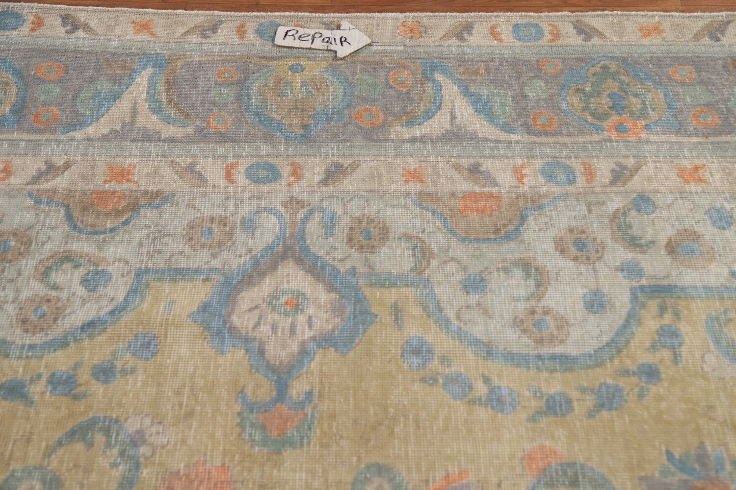 A Beautiful Genuine Persia ( Persia ) Tabriz rug is Hand Knotted by skillful weavers in Persia ( Persia ) with 100% Wool Material. This rug is in Very Good ( Evenly Low Pile-Repair) condition. dimensions are 12' 11'' X 9' 6'' in foot and 394 X 290 in centimeter. the primary color is Yellow & Gold.