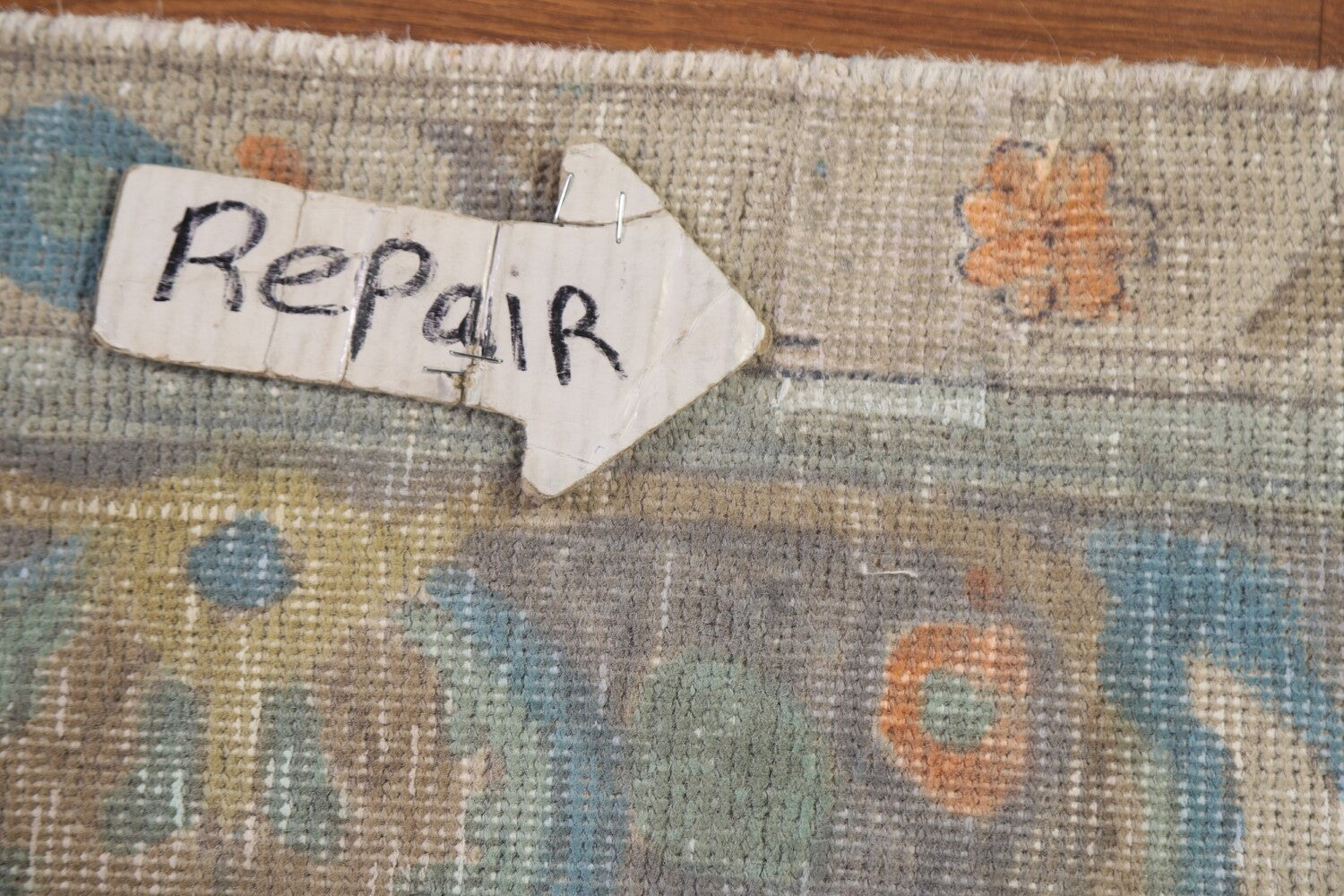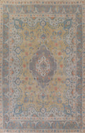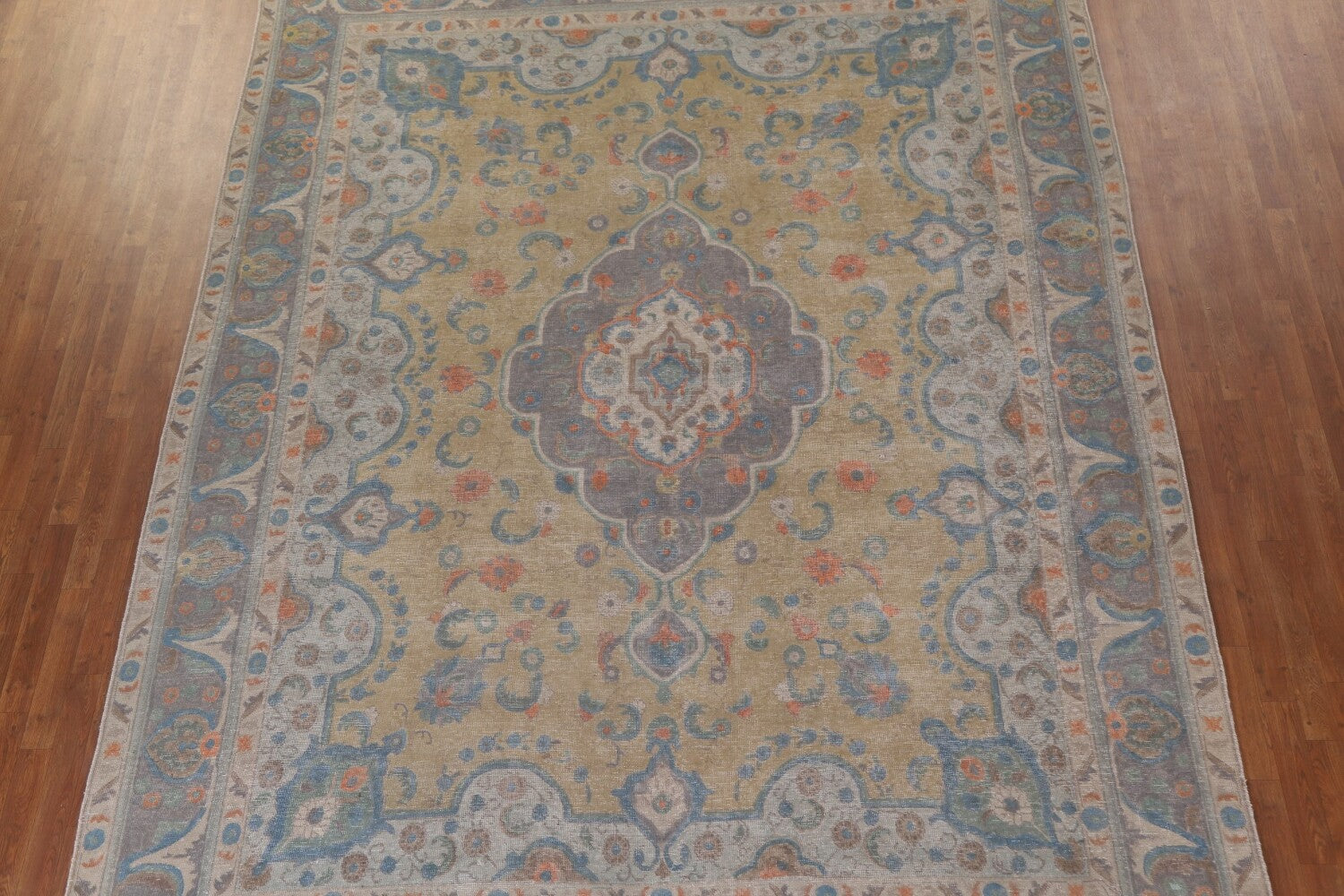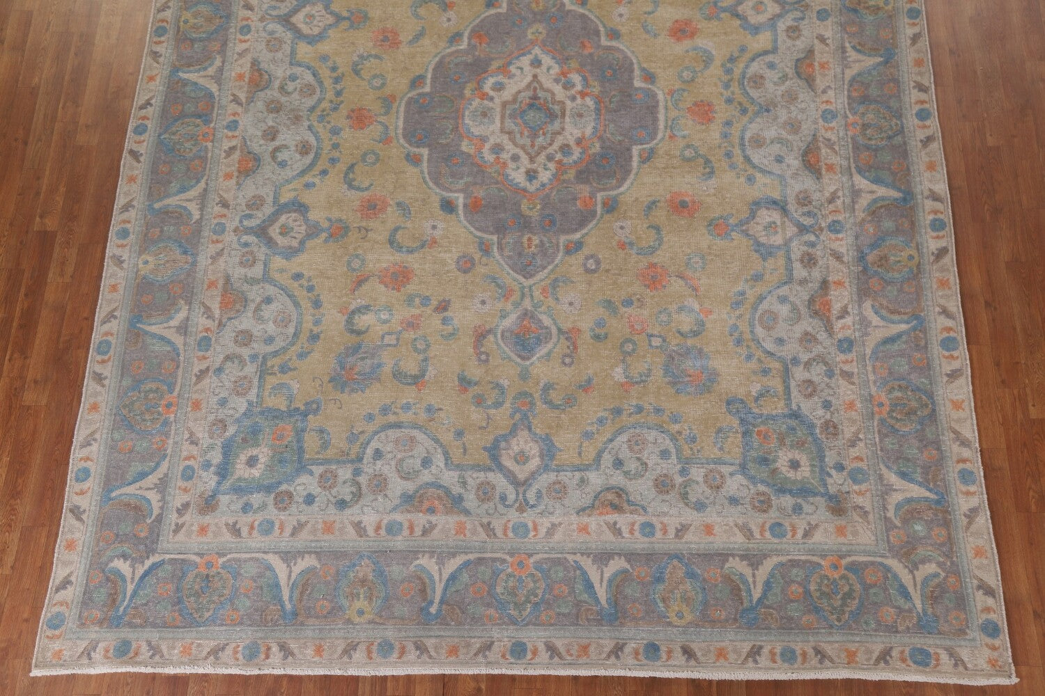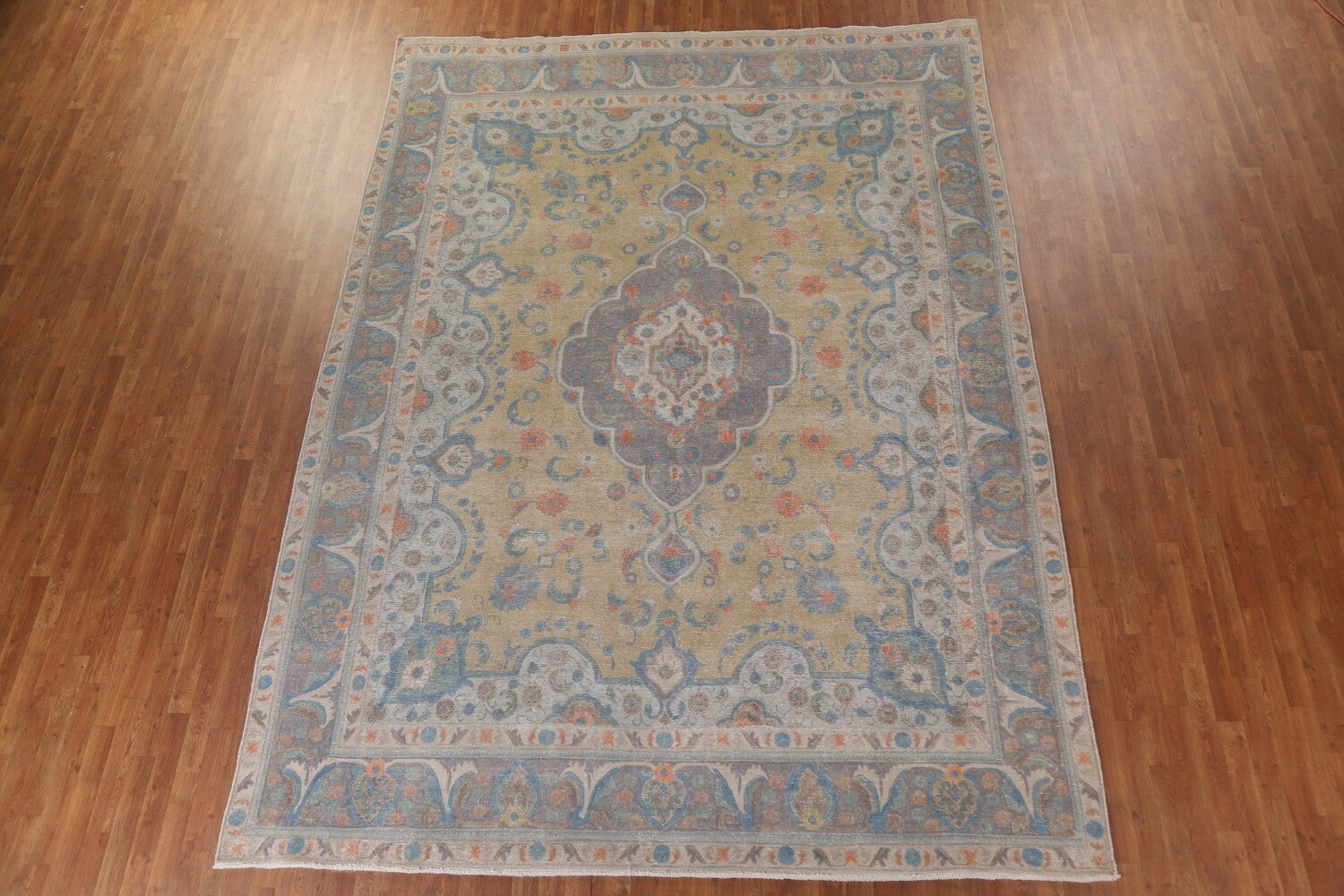 A Beautiful Genuine Persia ( Persia ) Tabriz rug is Hand Knotted by skillful weavers in Persia ( Persia ) with 100% Wool Material. This rug is in Very Good ( Evenly Low Pile-Repair) condition. dimensions are 12' 11'' X 9' 6'' in foot and 394 X 290 in centimeter. the primary color is Yellow & Gold.