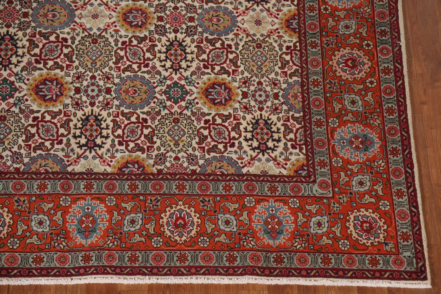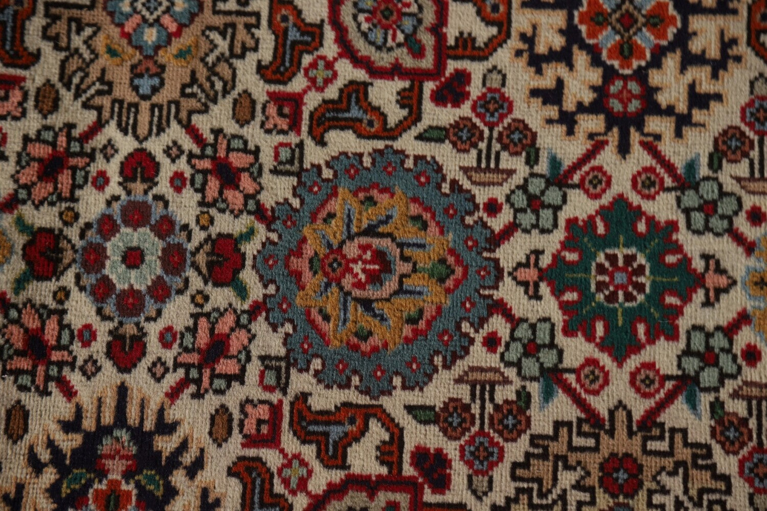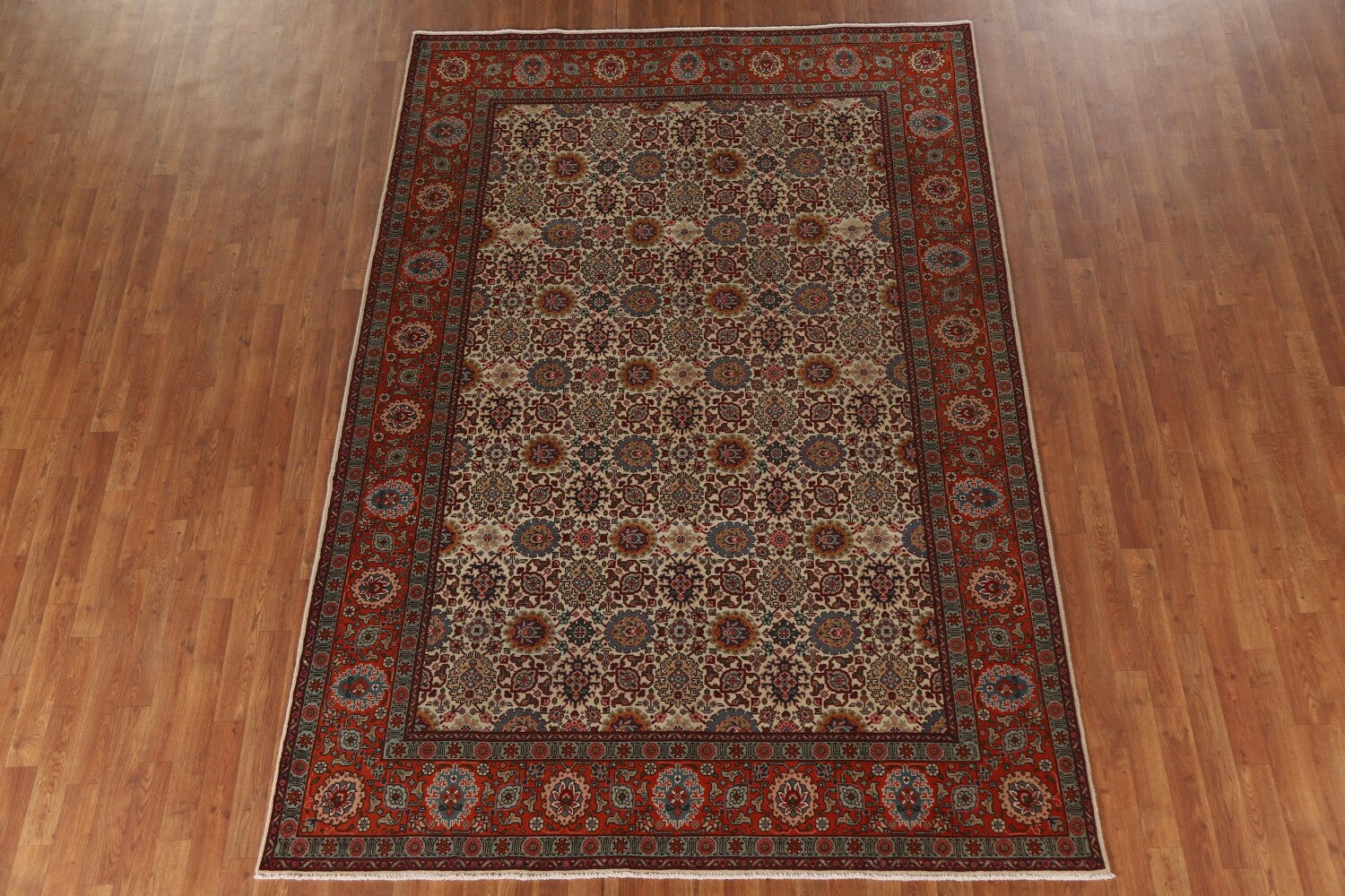A Beautiful Genuine Persia ( Persia ) Tabriz rug is Hand Knotted by skillful weavers in Persia ( Persia ) with 100% Wool Material. This rug is in Excellent condition. dimensions are 9' 7'' X 6' 6'' in foot and 292 X 198 in centimeter. the primary color is Beige & Ivories.