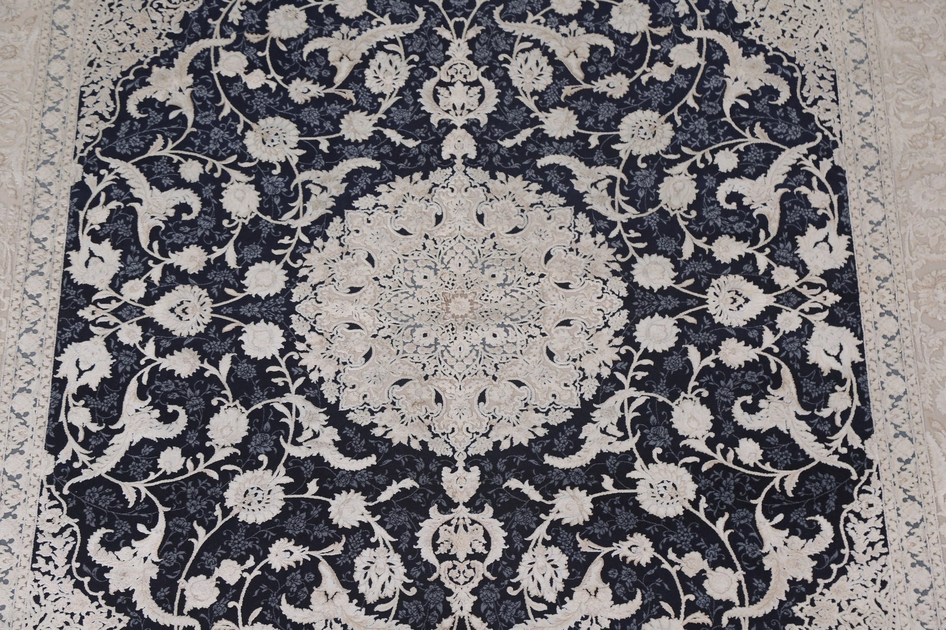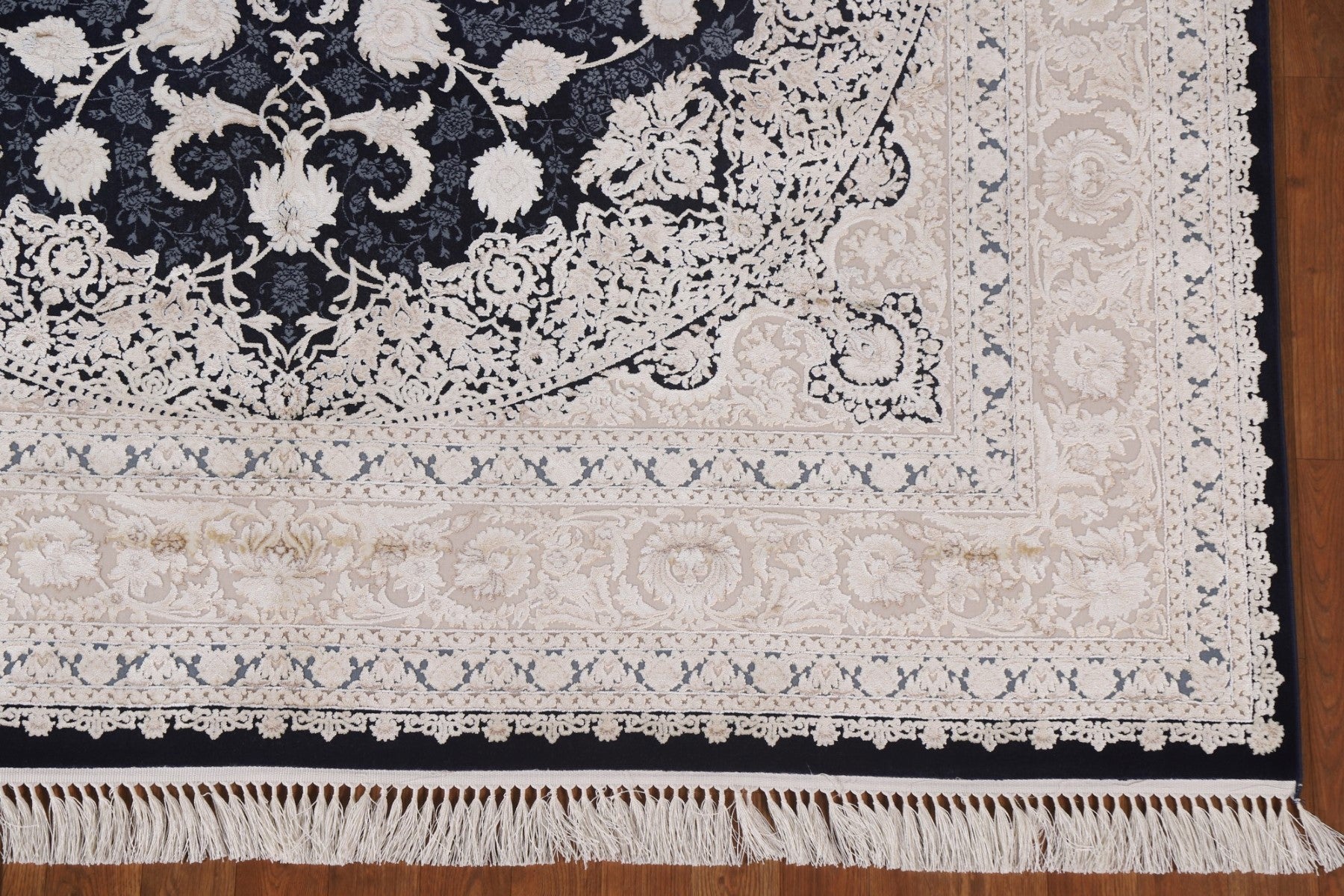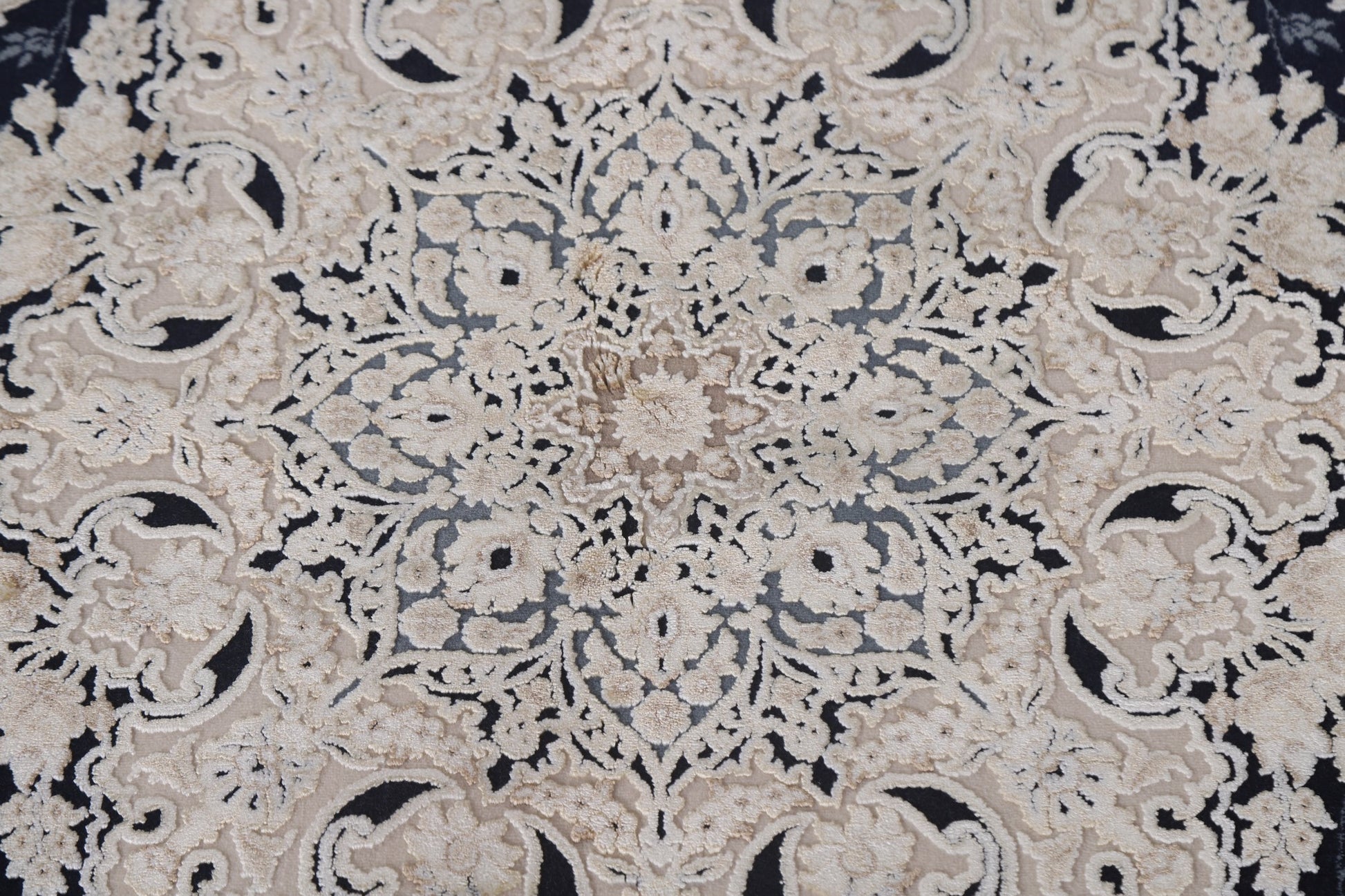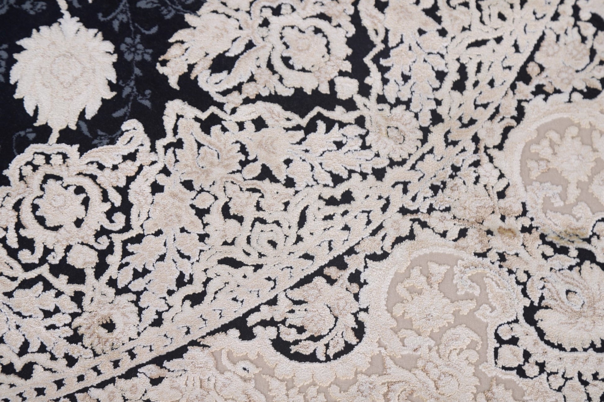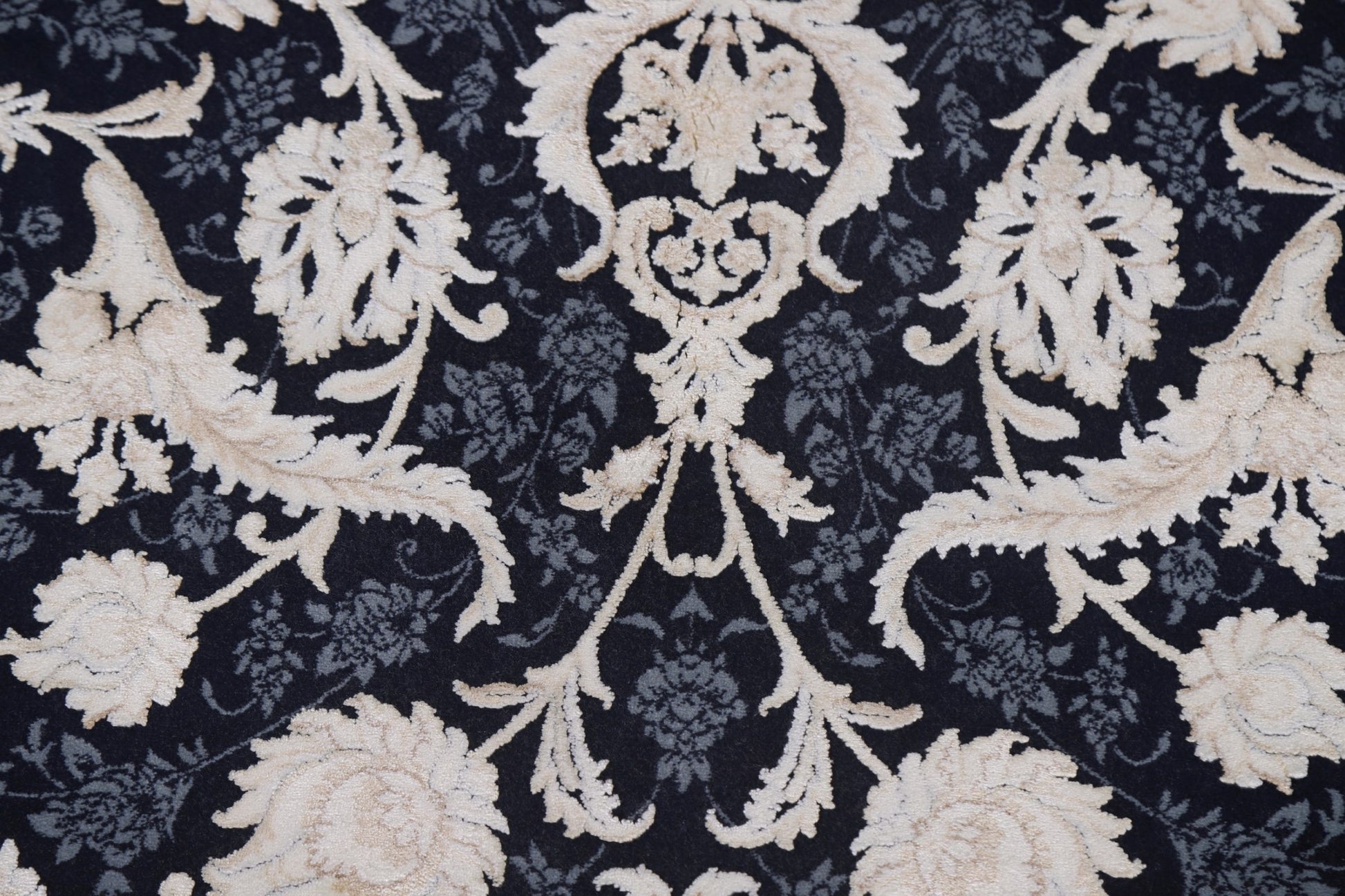 A Beautiful Genuine Turkey Tabriz rug is Machine Made by skillful weavers in Turkey with 90% Silk - 10% Polyester Material. This rug is in condition. dimensions are 9' 7'' X 6' 5'' in foot and 292 X 196 in centimeter. the primary color is Navy Blue & Blues.