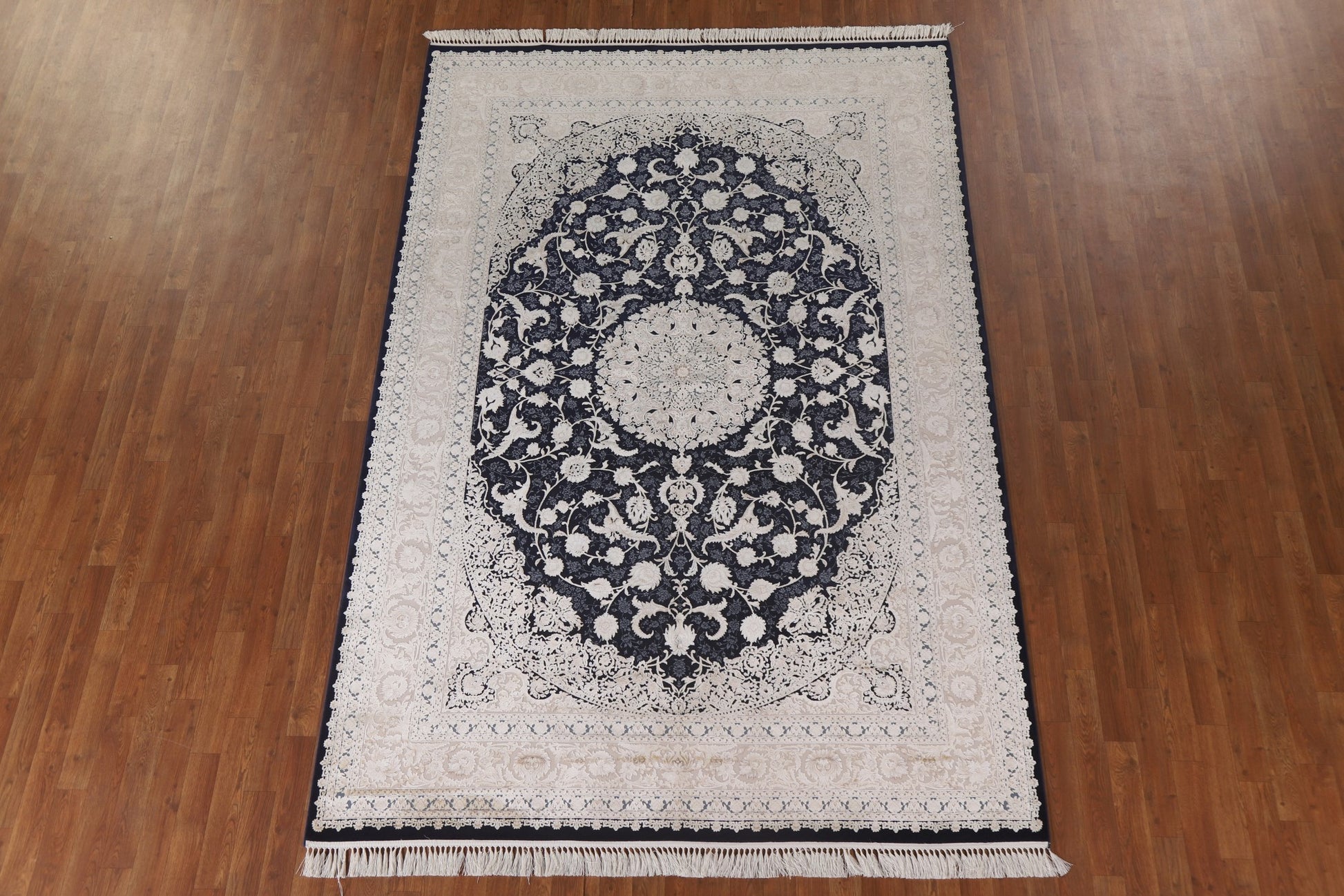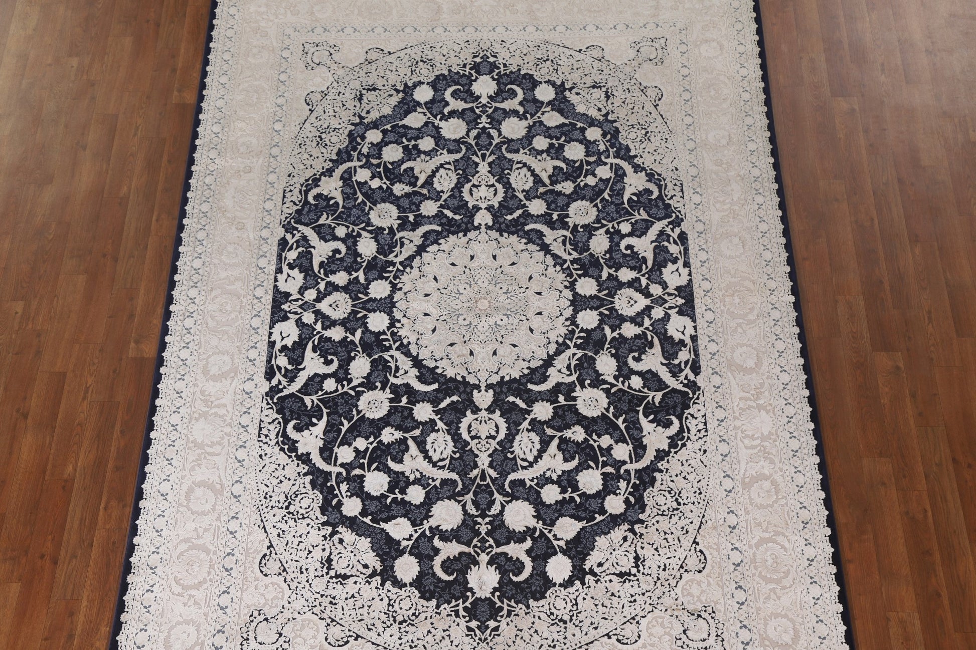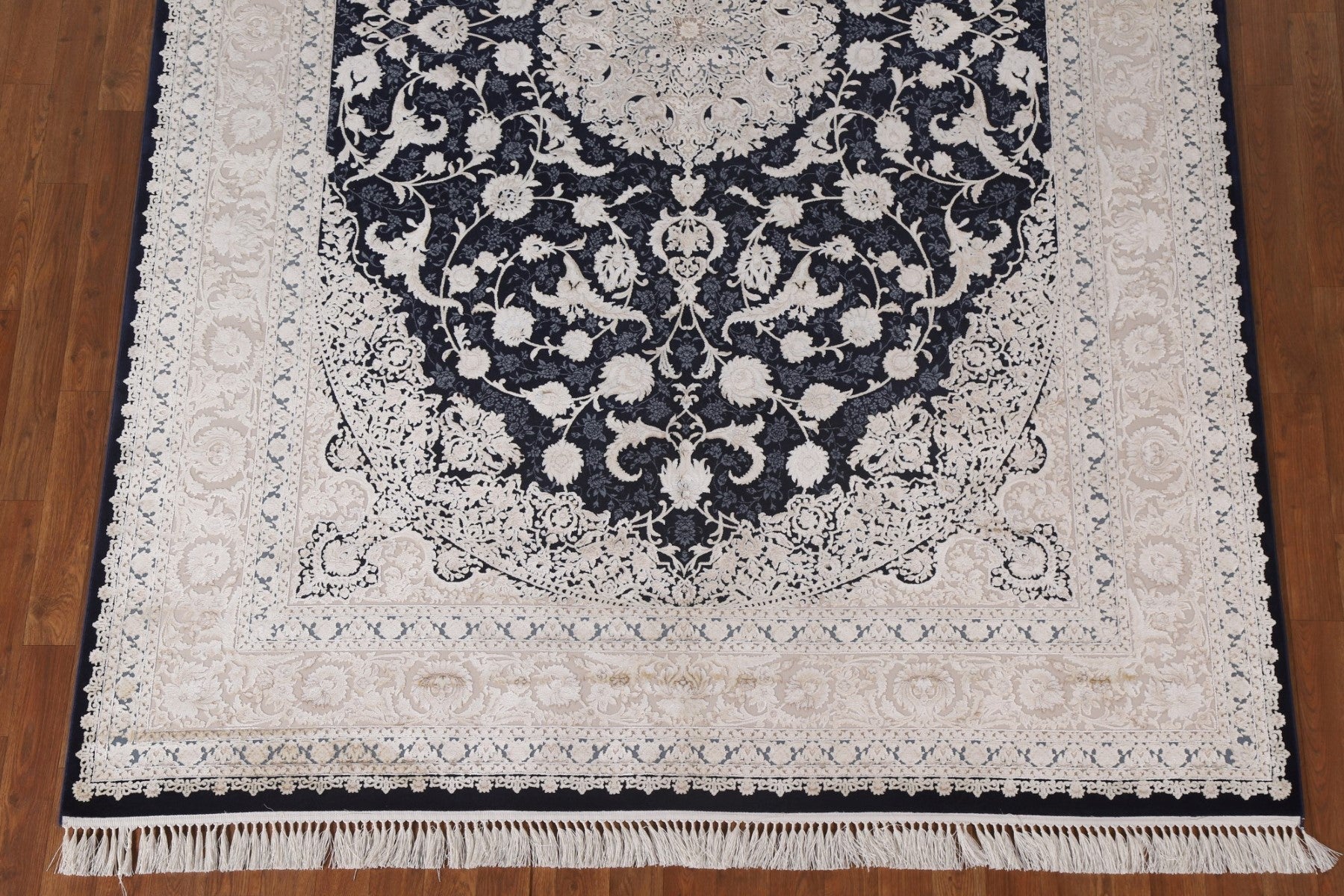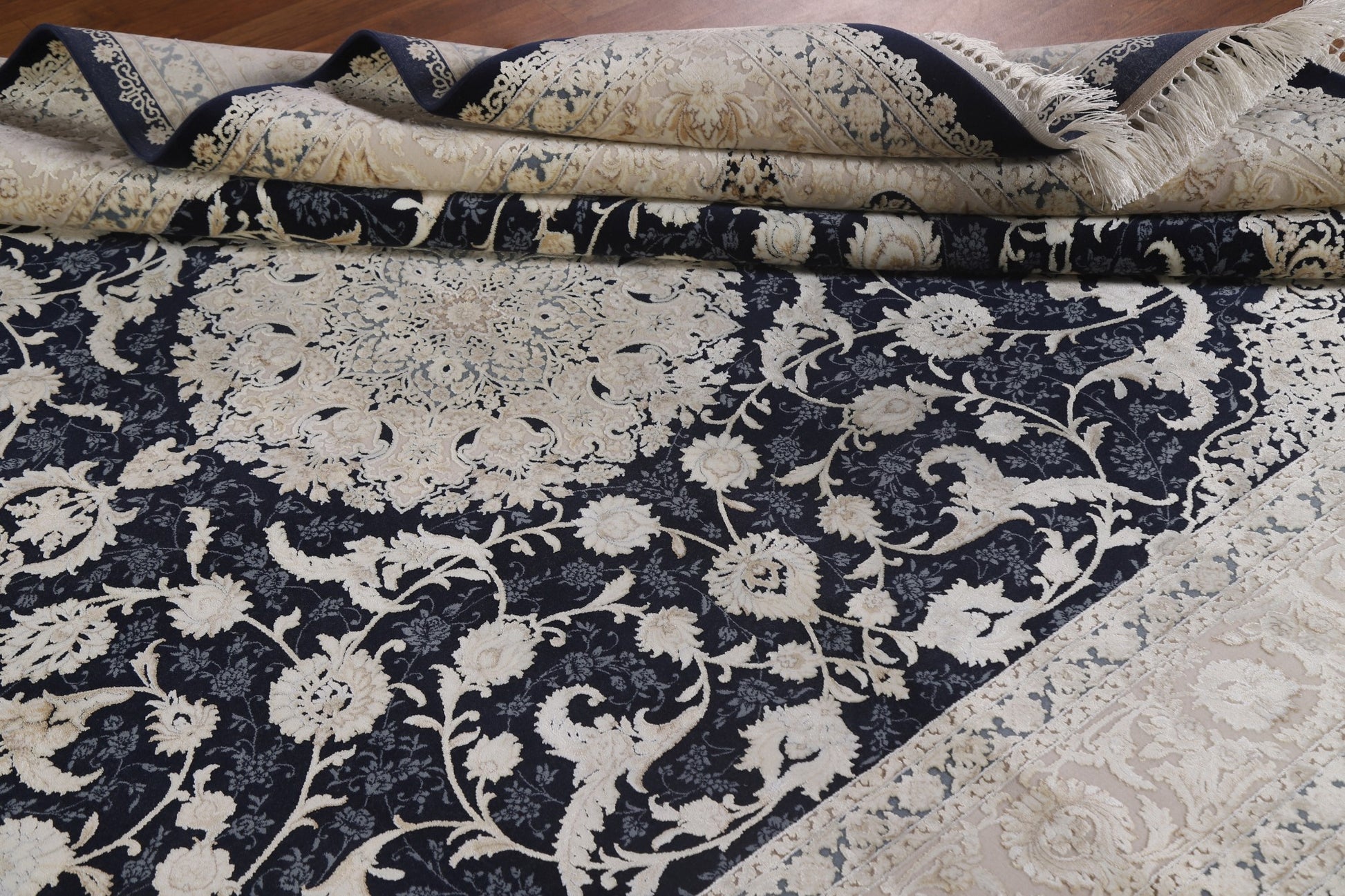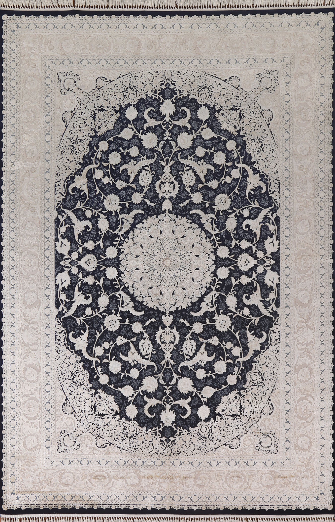 A Beautiful Genuine Turkey Tabriz rug is Machine Made by skillful weavers in Turkey with 90% Silk - 10% Polyester Material. This rug is in condition. dimensions are 9' 7'' X 6' 5'' in foot and 292 X 196 in centimeter. the primary color is Navy Blue & Blues.