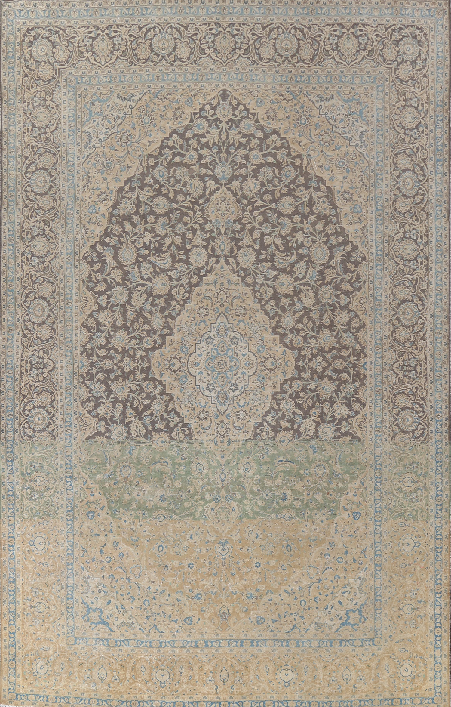 A Beautiful Genuine Persia ( Persia ) Kashan rug is Hand Knotted by skillful weavers in Persia ( Persia ) with 100% Wool Material. This rug is in Very Good (Evenly Low Pile-Abrash) condition. dimensions are 14' 3'' X 10' 0'' in foot and 434 X 305 in centimeter. the primary color is Brown.