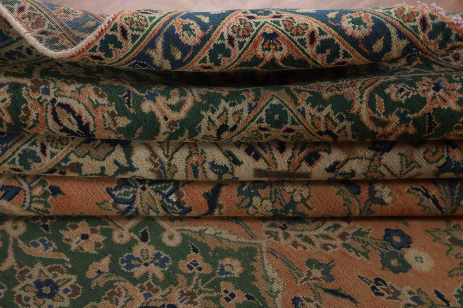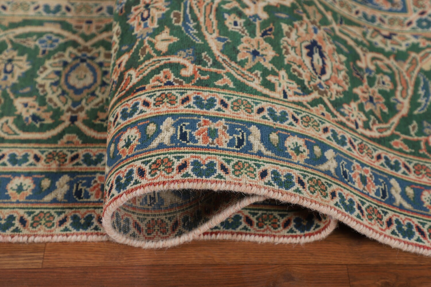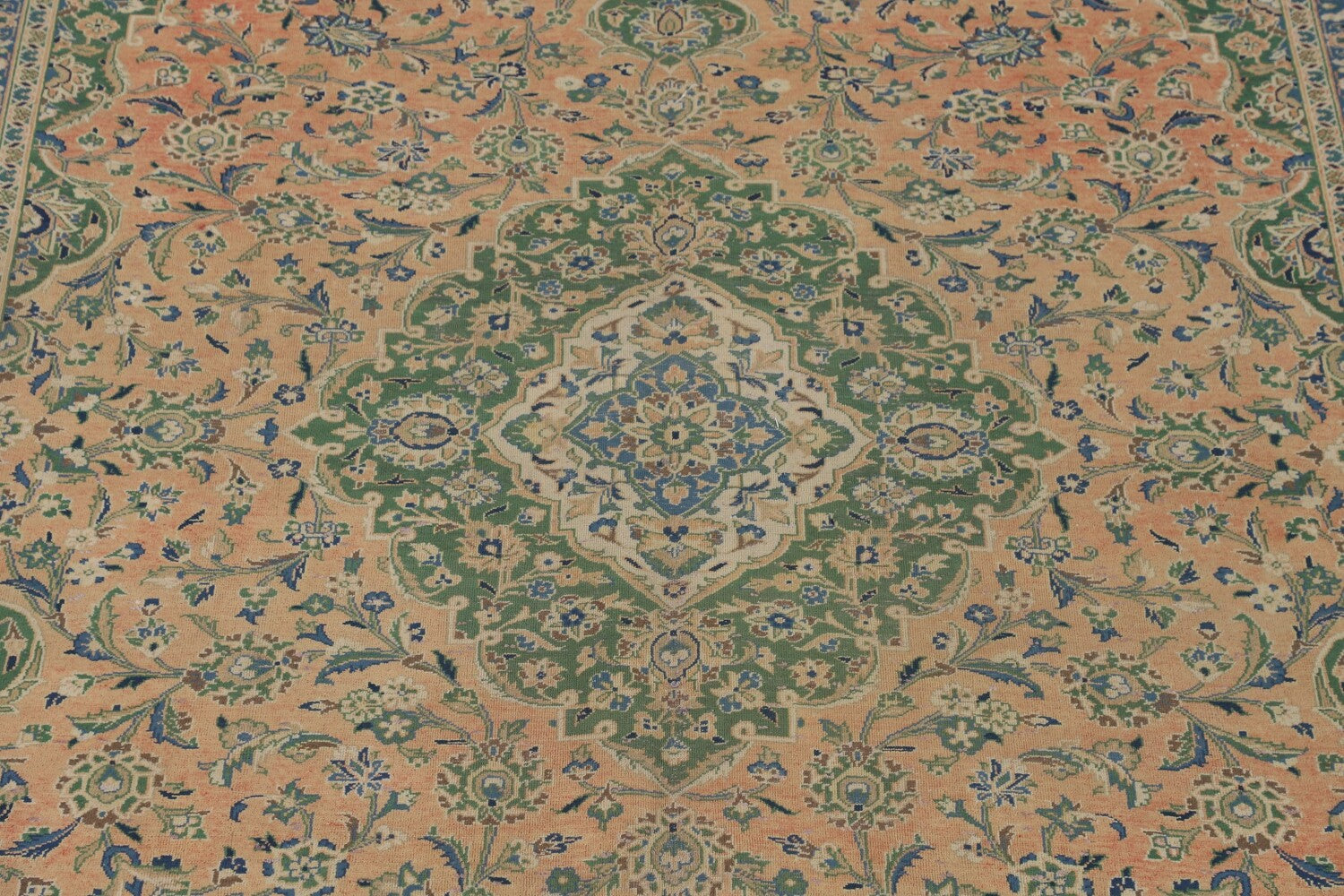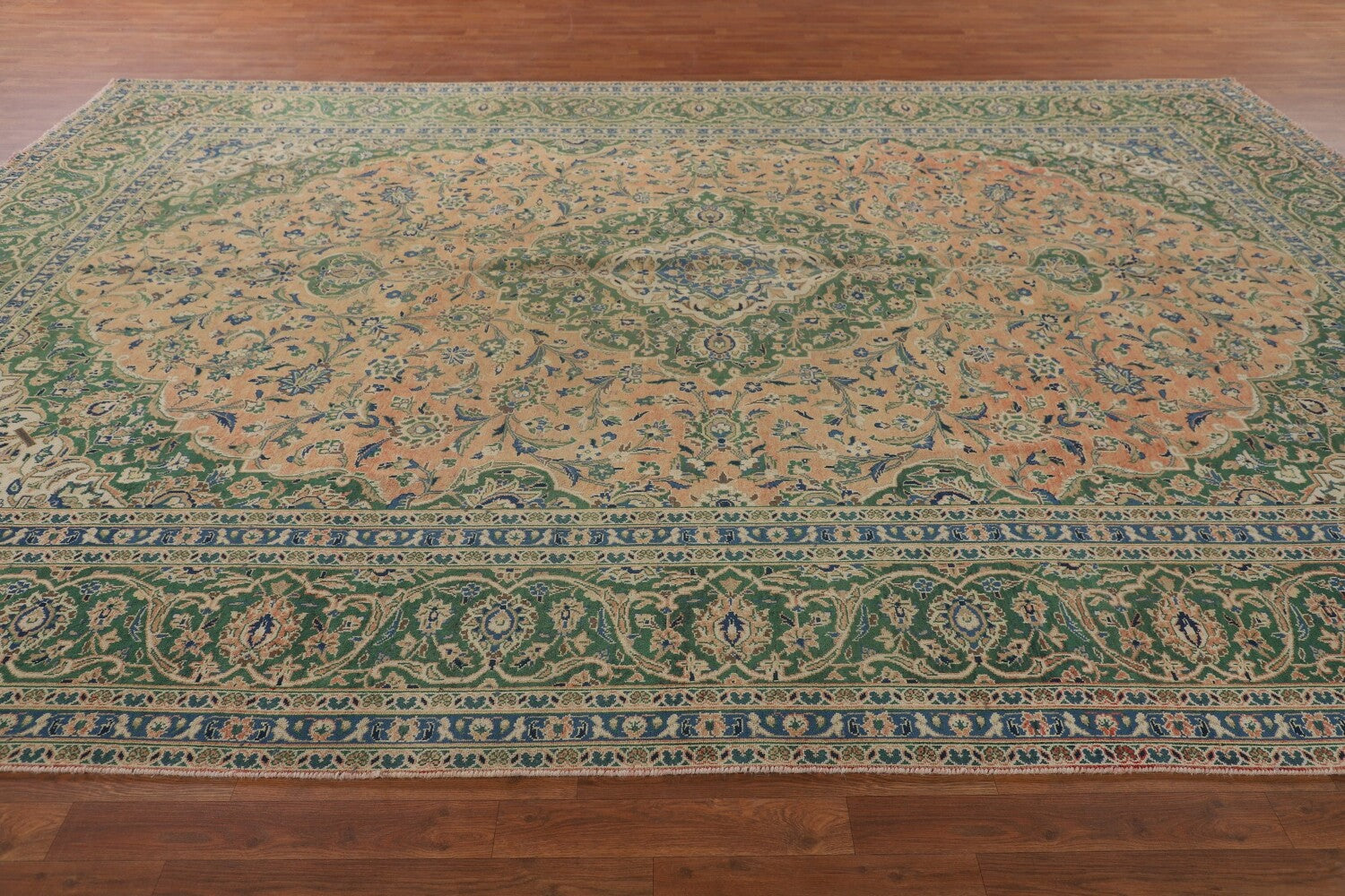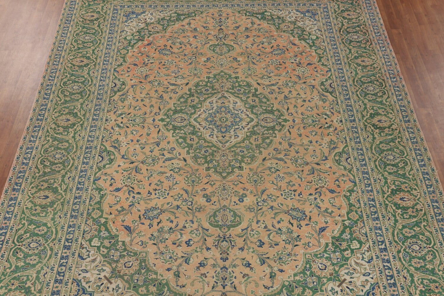 A Beautiful Genuine Persia ( Persia ) Kashan rug is Hand Knotted by skillful weavers in Persia ( Persia ) with 100% Wool Material. This rug is in Very Good (Evenly Low Pile) condition. dimensions are 13' 0'' X 9' 6'' in foot and 396 X 290 in centimeter. the primary color is Coral.