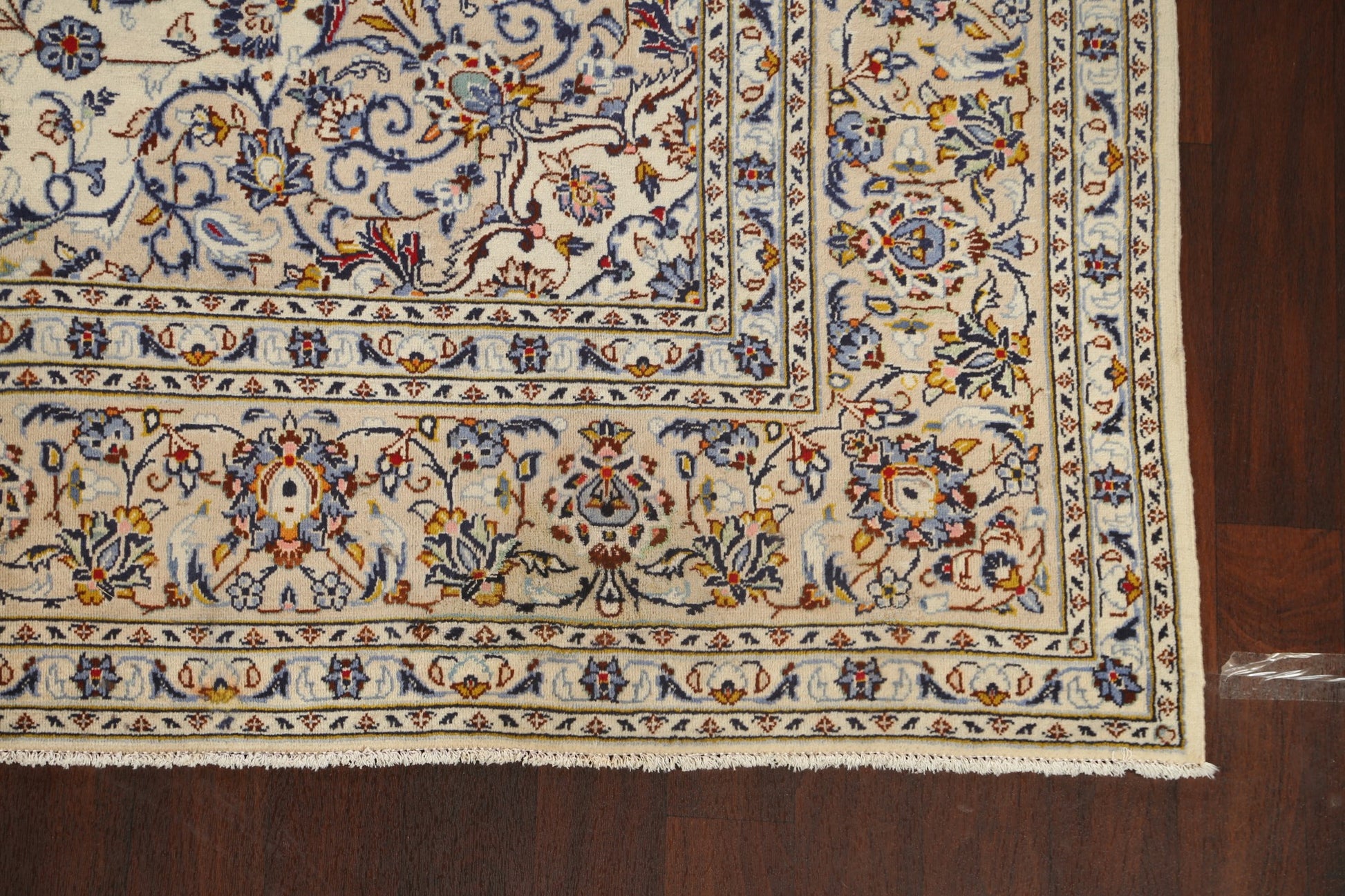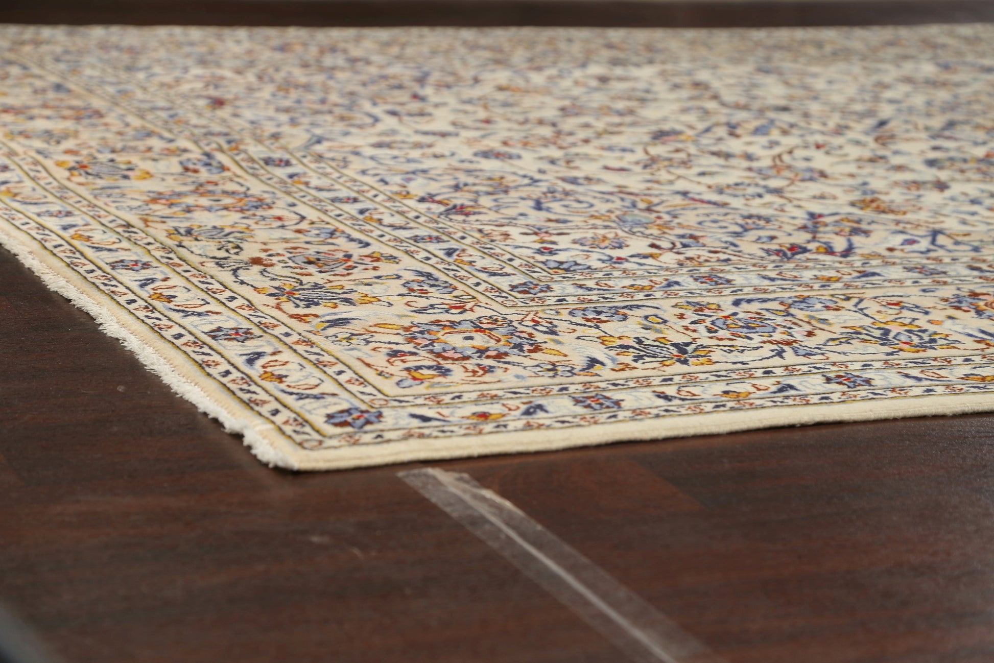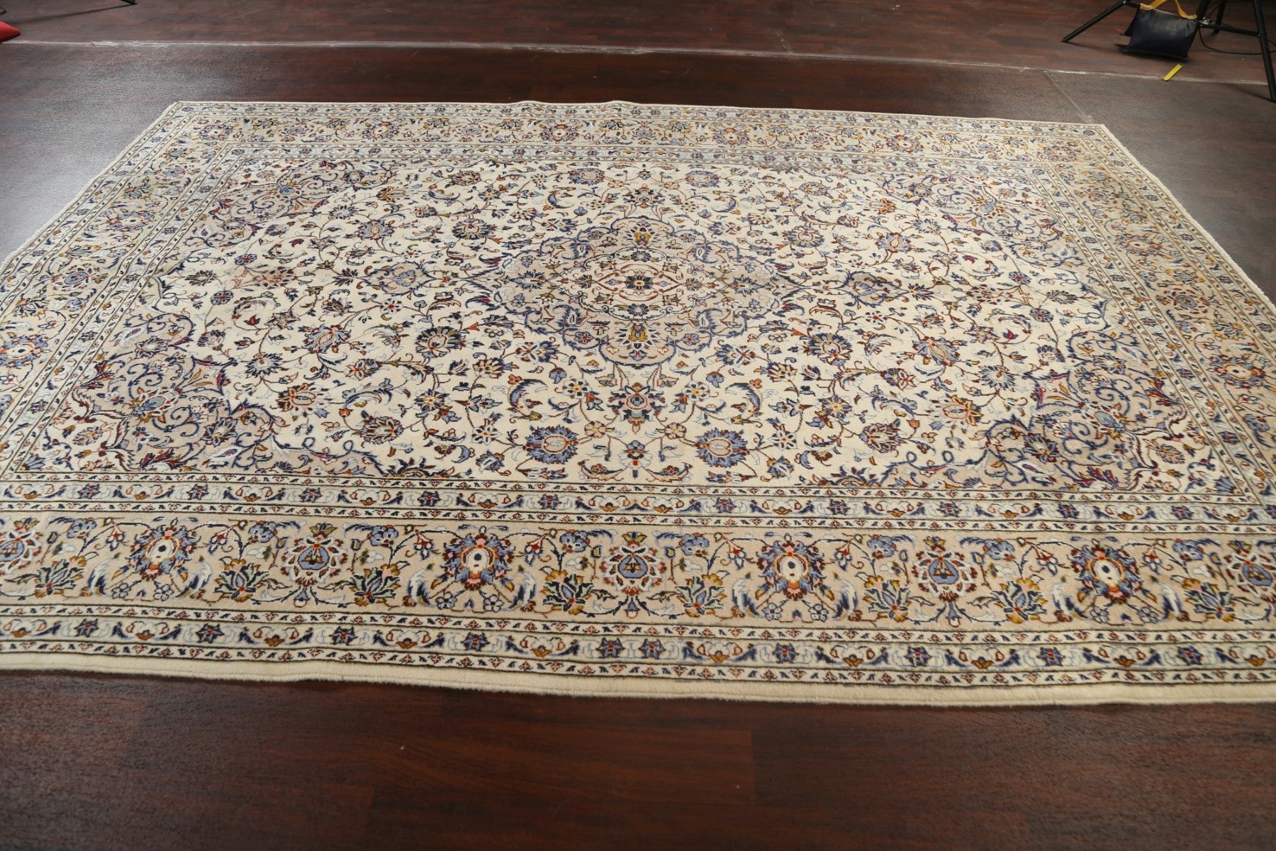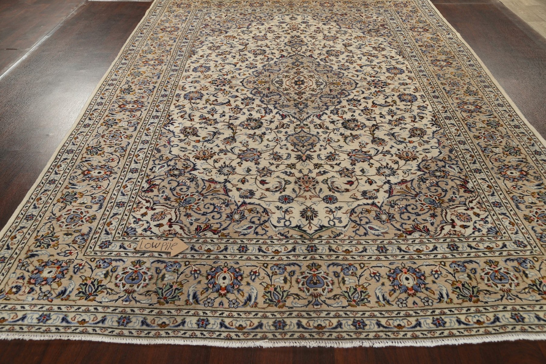 A Beautiful Genuine Persia ( Persia ) Kashan rug is Hand Knotted by skillful weavers in Persia ( Persia ) with 100% Wool Material. This rug is in Very Good ( Low Pile ) condition. dimensions are 11' 7'' X 7' 11'' in foot and 353 X 241 in centimeter. the primary color is Beige & Ivories.
