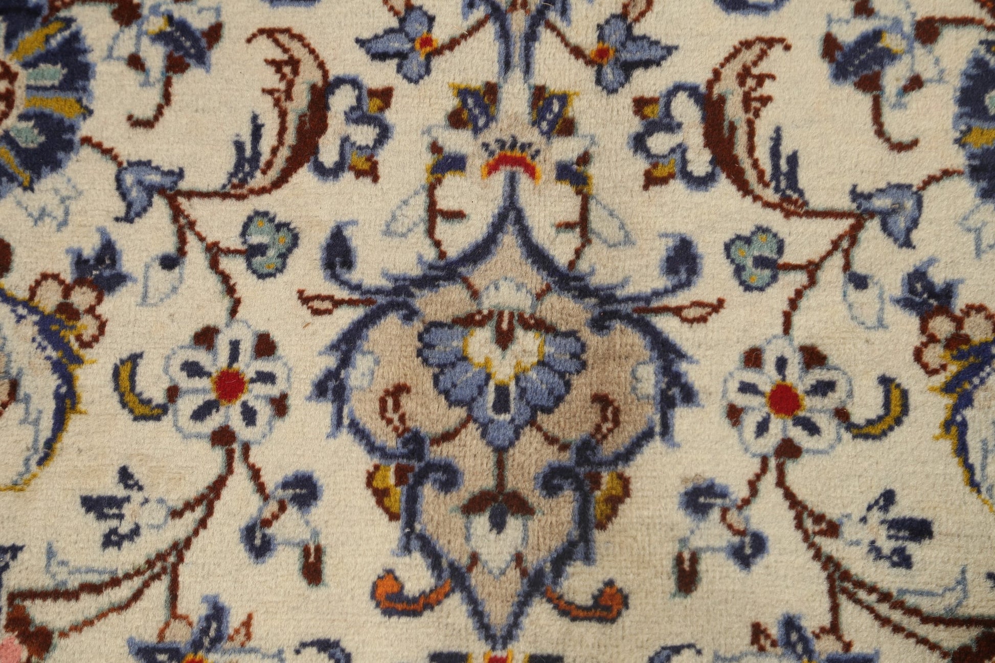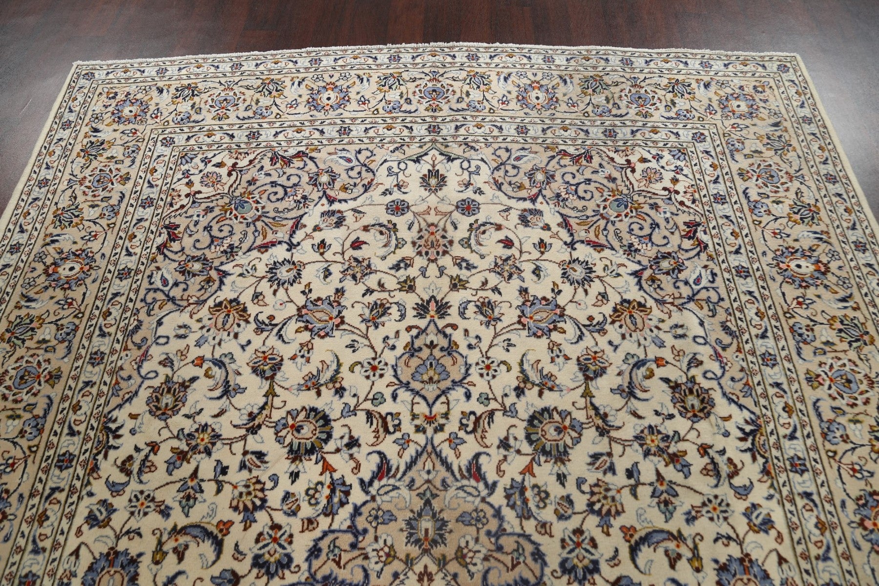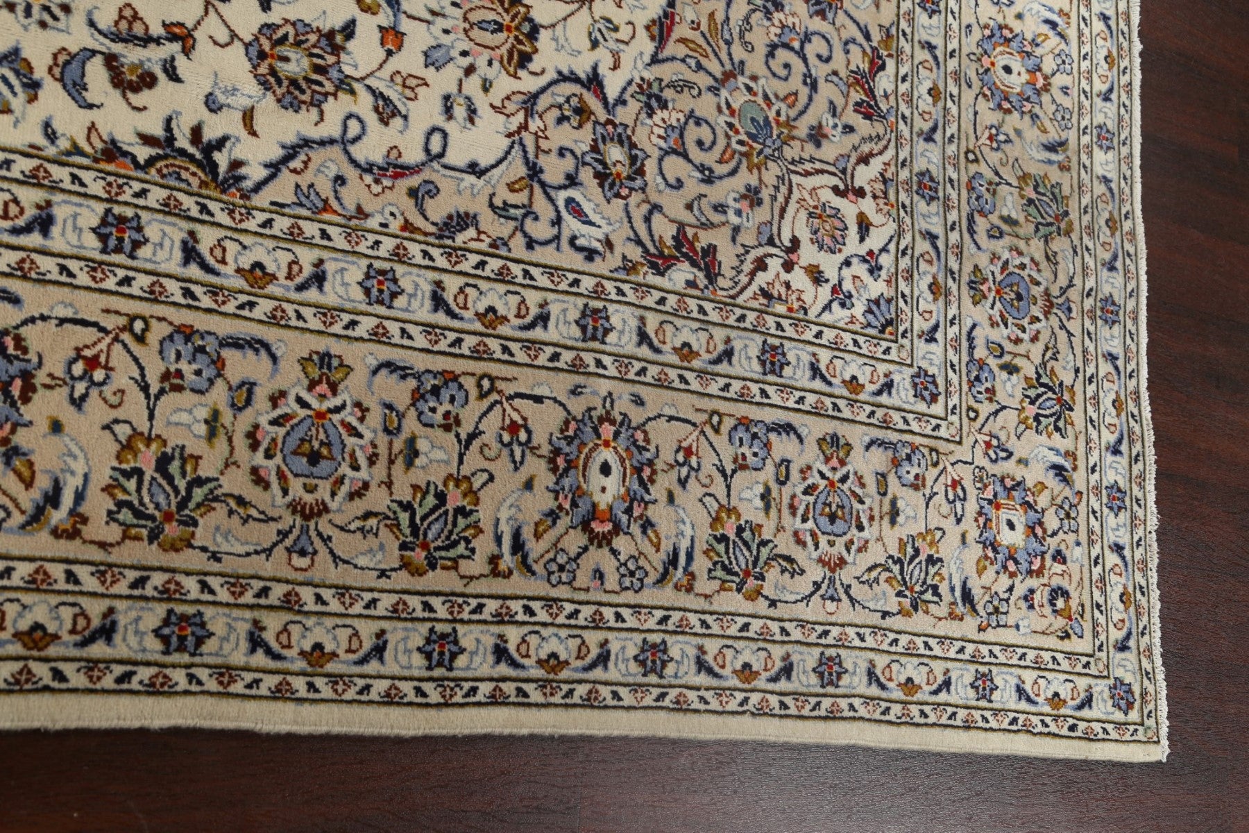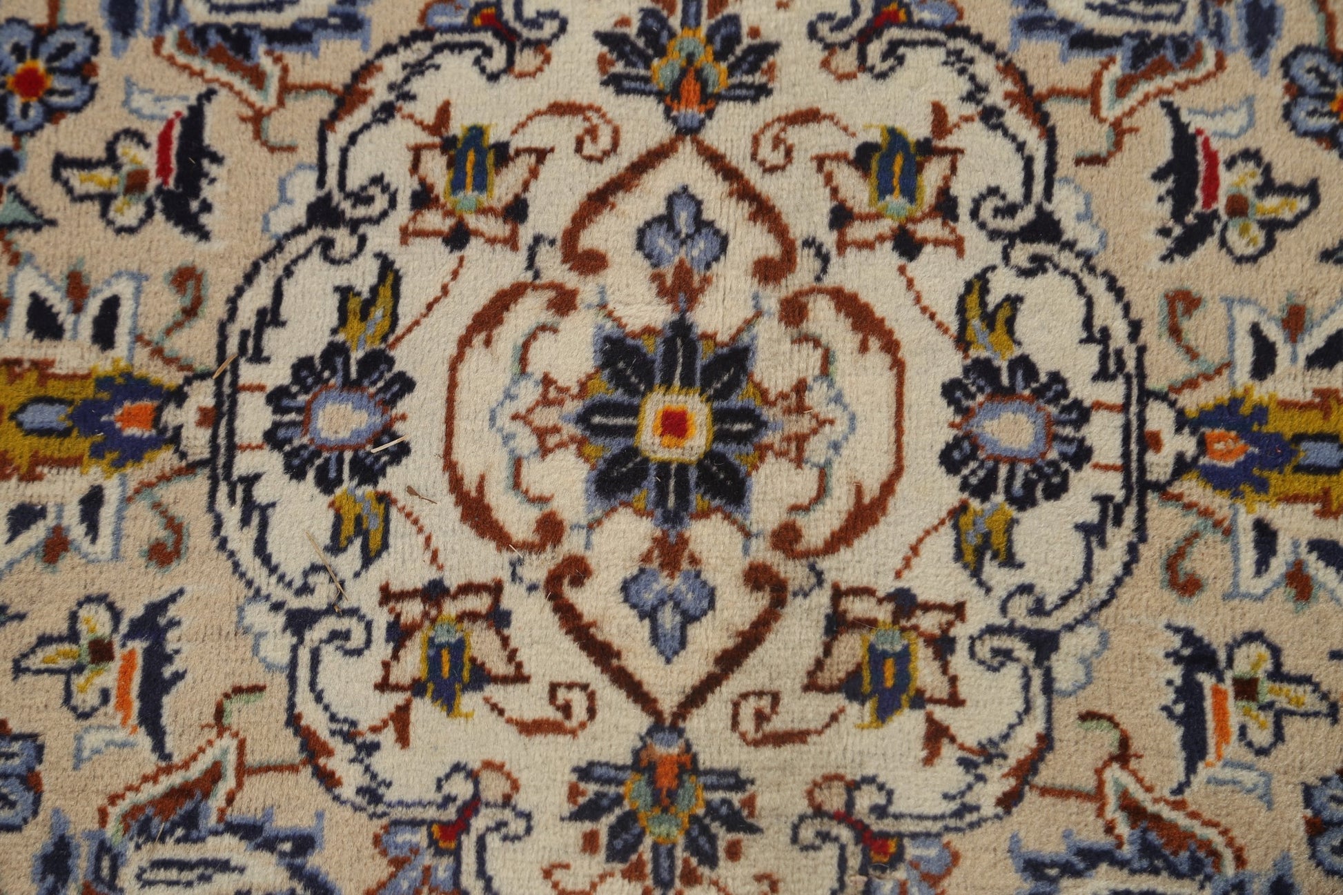 A Beautiful Genuine Persia ( Persia ) Kashan rug is Hand Knotted by skillful weavers in Persia ( Persia ) with 100% Wool Material. This rug is in Very Good ( Low Pile ) condition. dimensions are 11' 7'' X 7' 11'' in foot and 353 X 241 in centimeter. the primary color is Beige & Ivories.