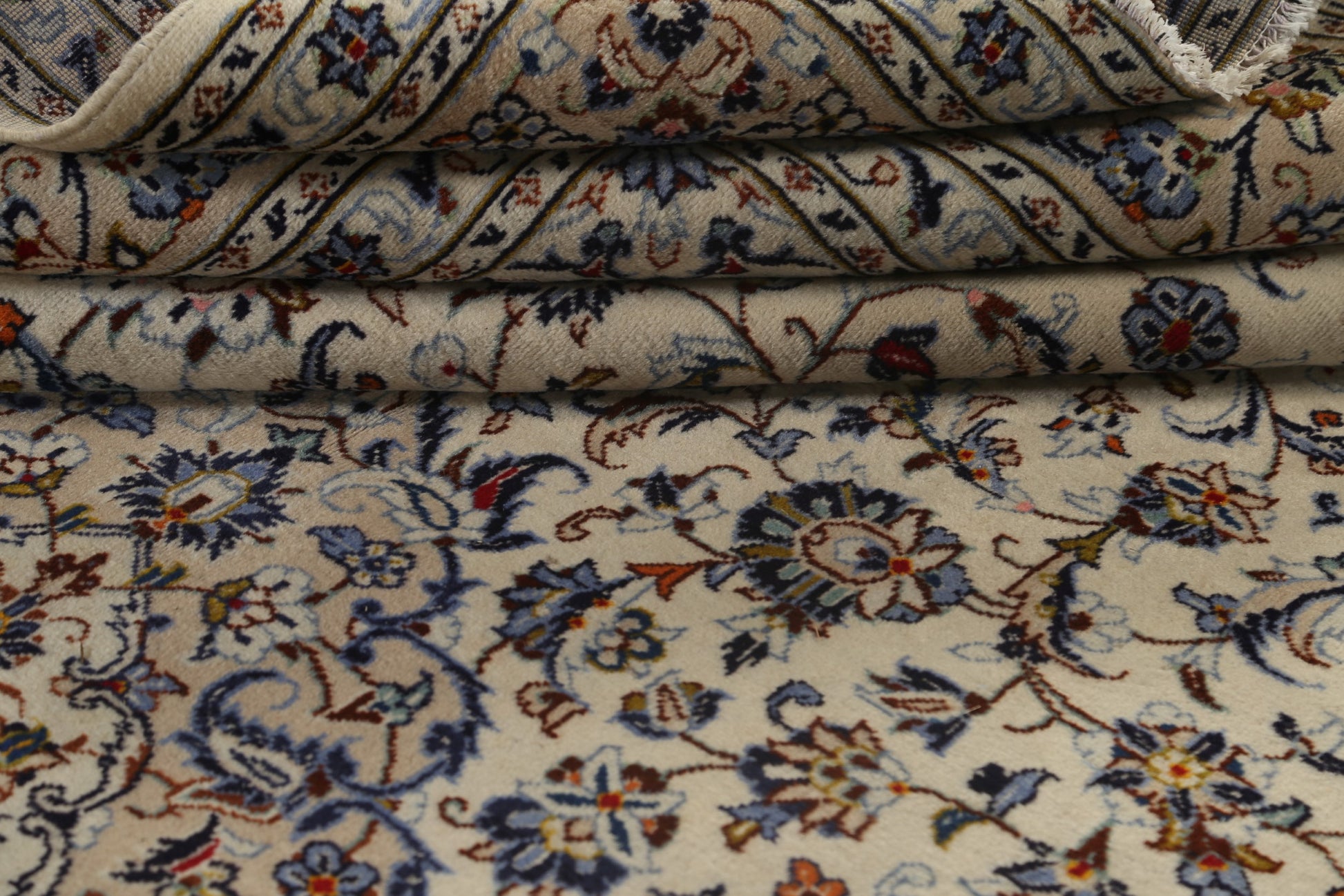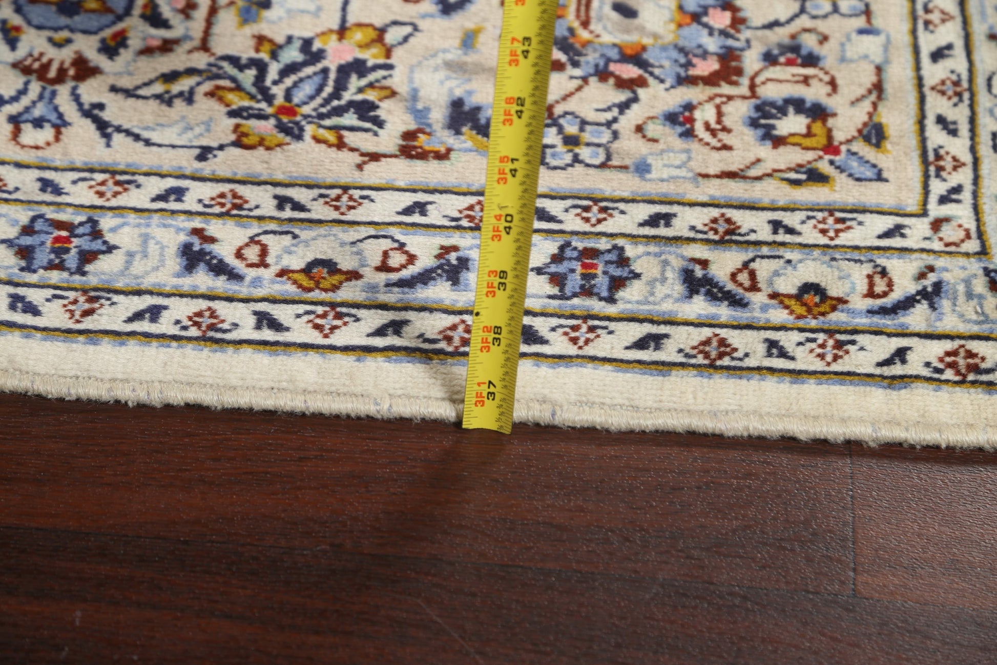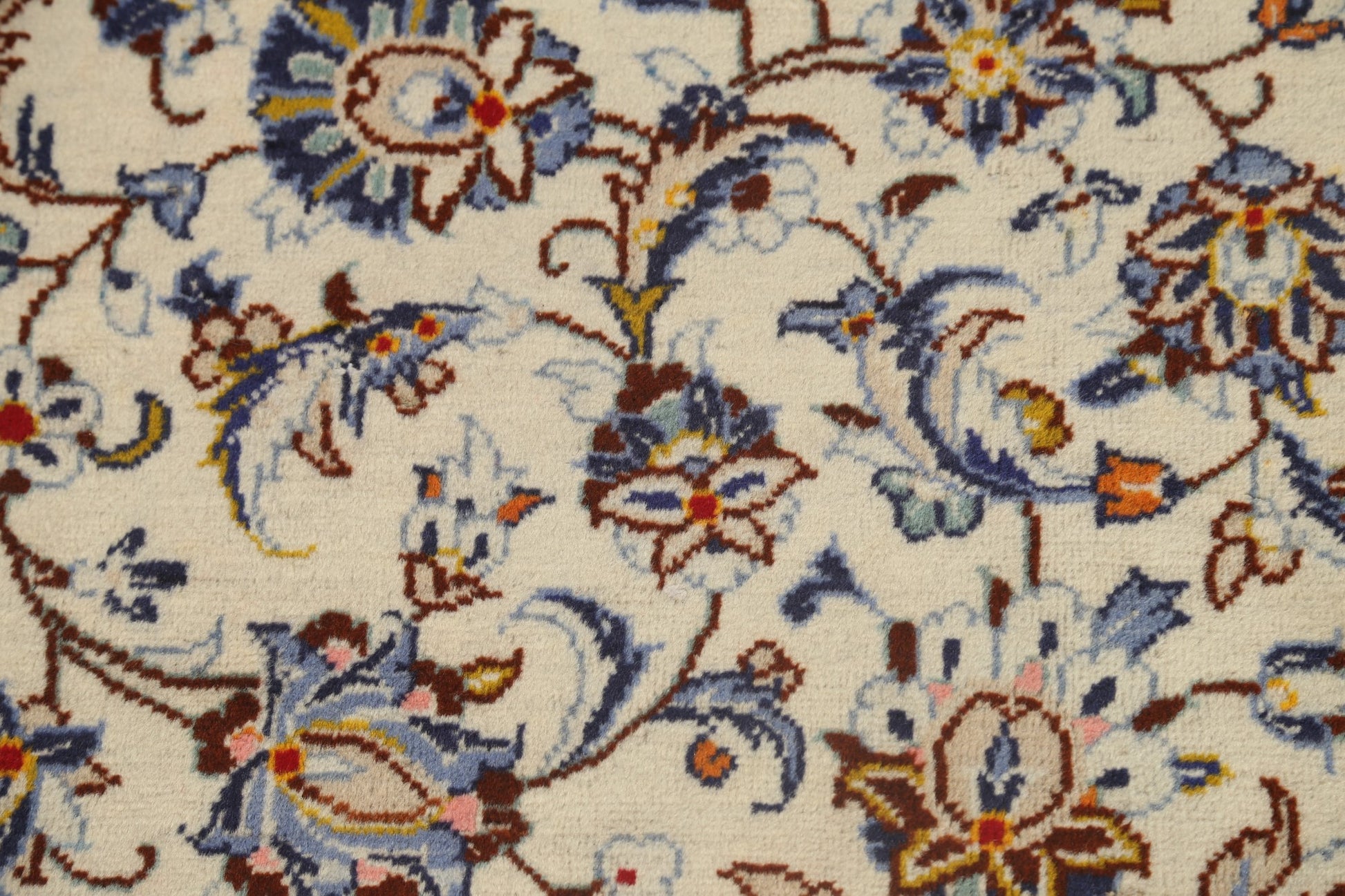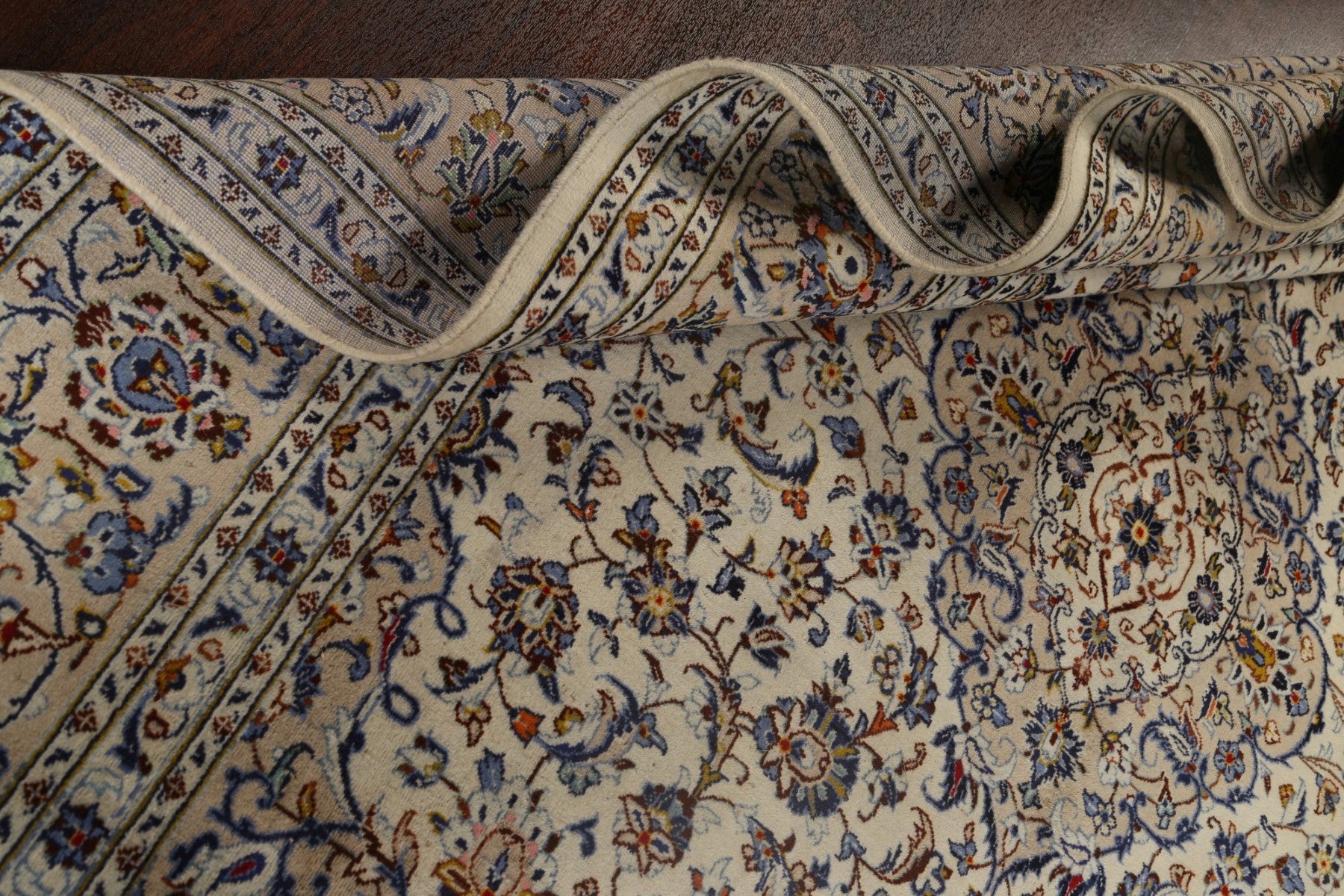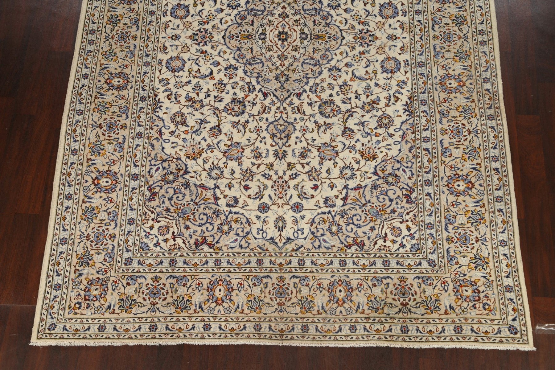 A Beautiful Genuine Persia ( Persia ) Kashan rug is Hand Knotted by skillful weavers in Persia ( Persia ) with 100% Wool Material. This rug is in Very Good ( Low Pile ) condition. dimensions are 11' 7'' X 7' 11'' in foot and 353 X 241 in centimeter. the primary color is Beige & Ivories.
