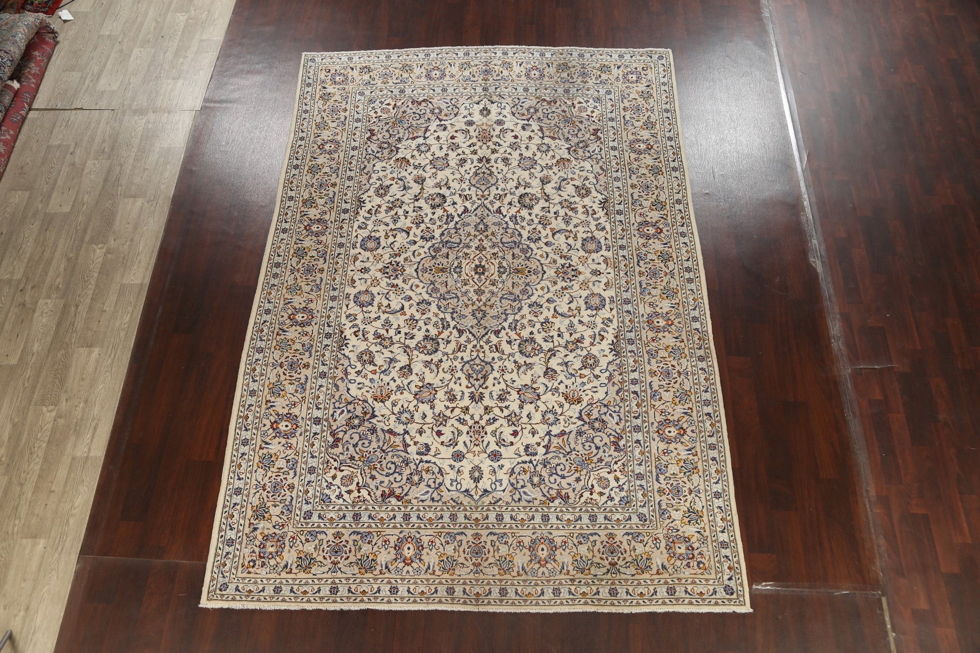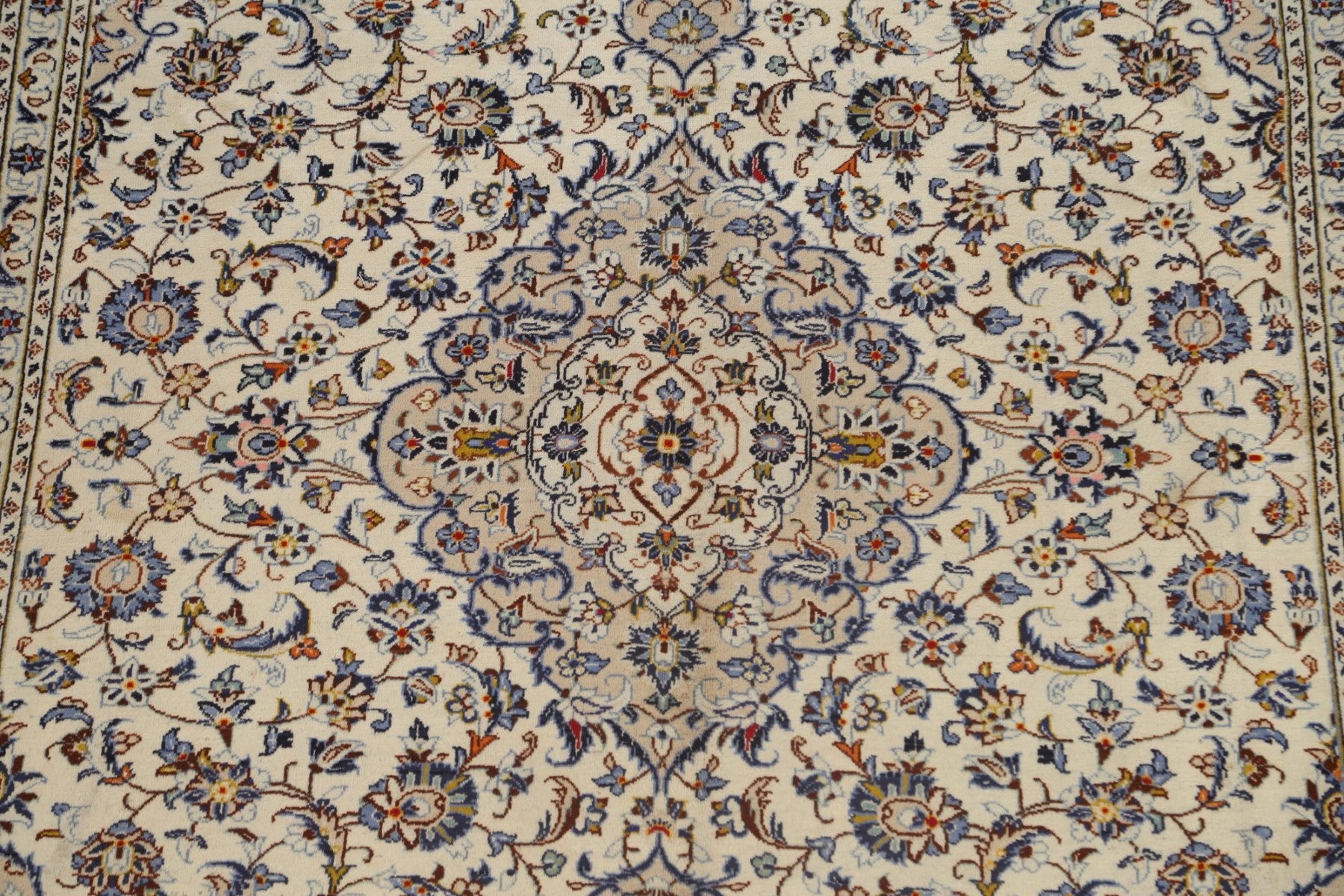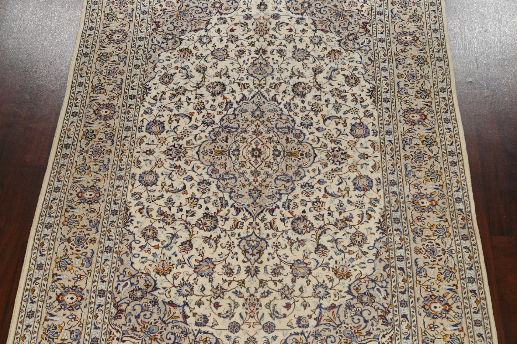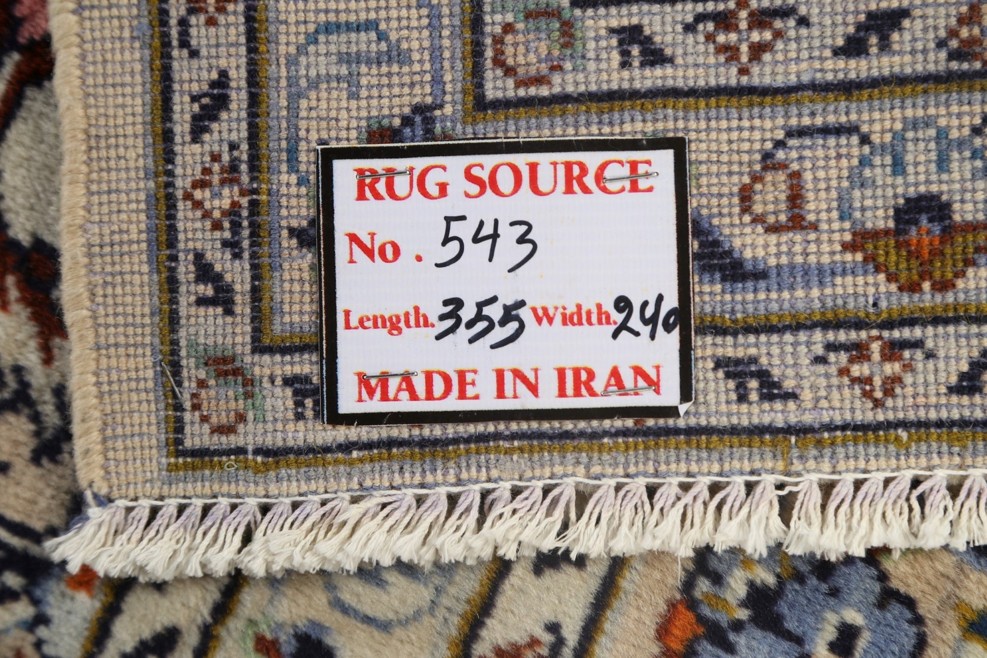 A Beautiful Genuine Persia ( Persia ) Kashan rug is Hand Knotted by skillful weavers in Persia ( Persia ) with 100% Wool Material. This rug is in Very Good ( Low Pile ) condition. dimensions are 11' 7'' X 7' 11'' in foot and 353 X 241 in centimeter. the primary color is Beige & Ivories.