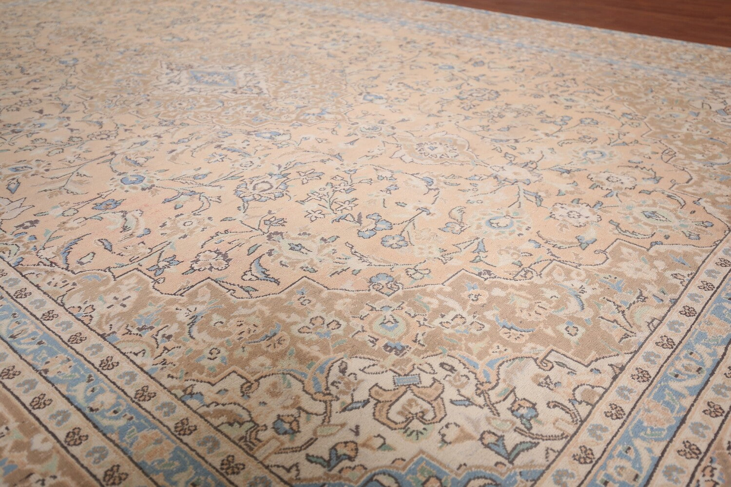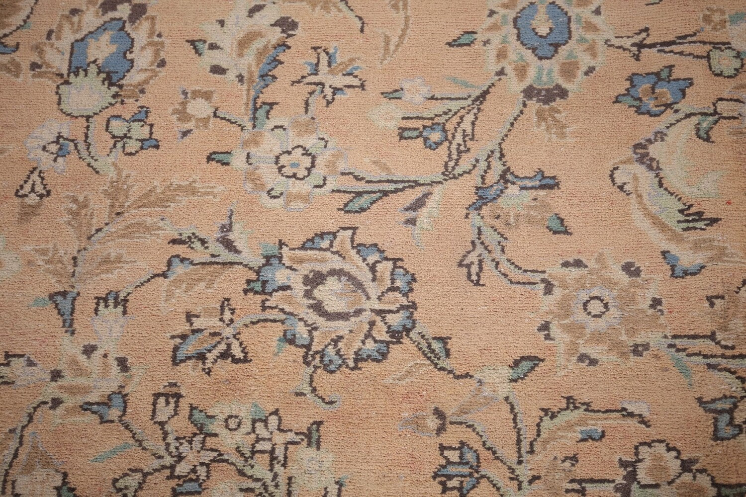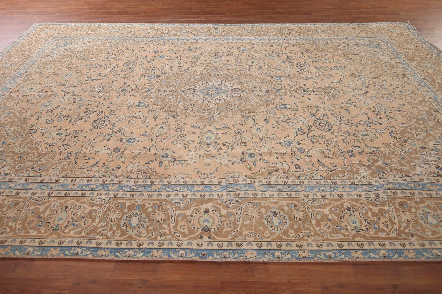 A Beautiful Genuine Persia ( Persia ) Mashad rug is Hand Knotted by skillful weavers in Persia ( Persia ) with 100% Wool Material. This rug is in Very Good (Evenly Low Pile) condition. dimensions are 13' 1'' X 9' 1'' in foot and 399 X 277 in centimeter. the primary color is Peach.