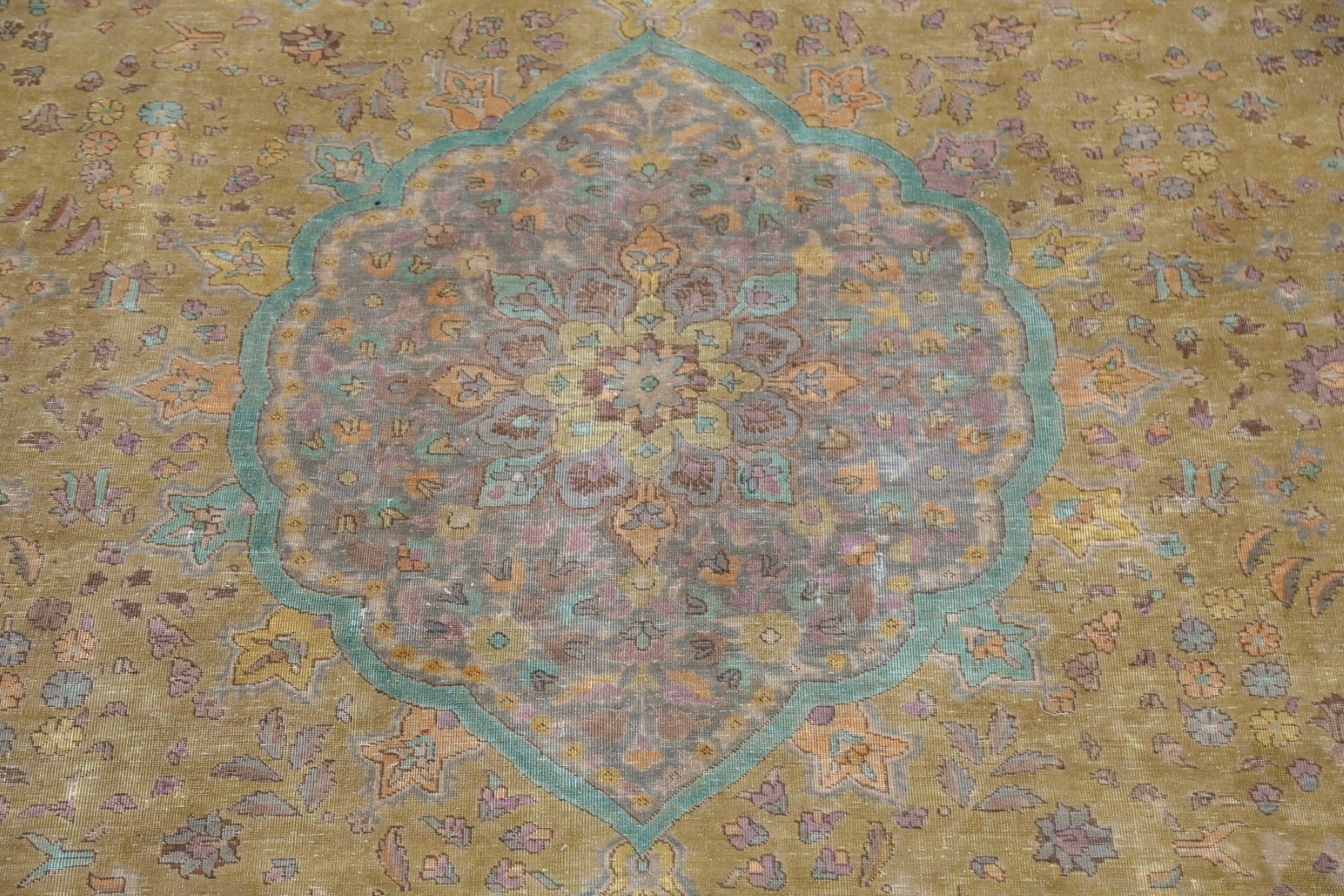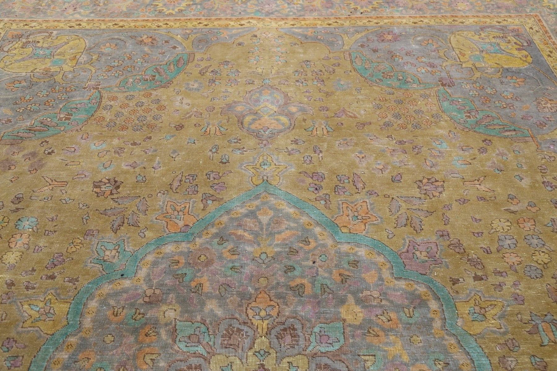 A Beautiful Genuine Persia ( Persia ) Tabriz rug is Hand Knotted by skillful weavers in Persia ( Persia ) with 100% Wool Material. This rug is in Very Good (Evenly Low Pile) condition. dimensions are 12' 6'' X 9' 5'' in foot and 381 X 287 in centimeter. the primary color is Green.