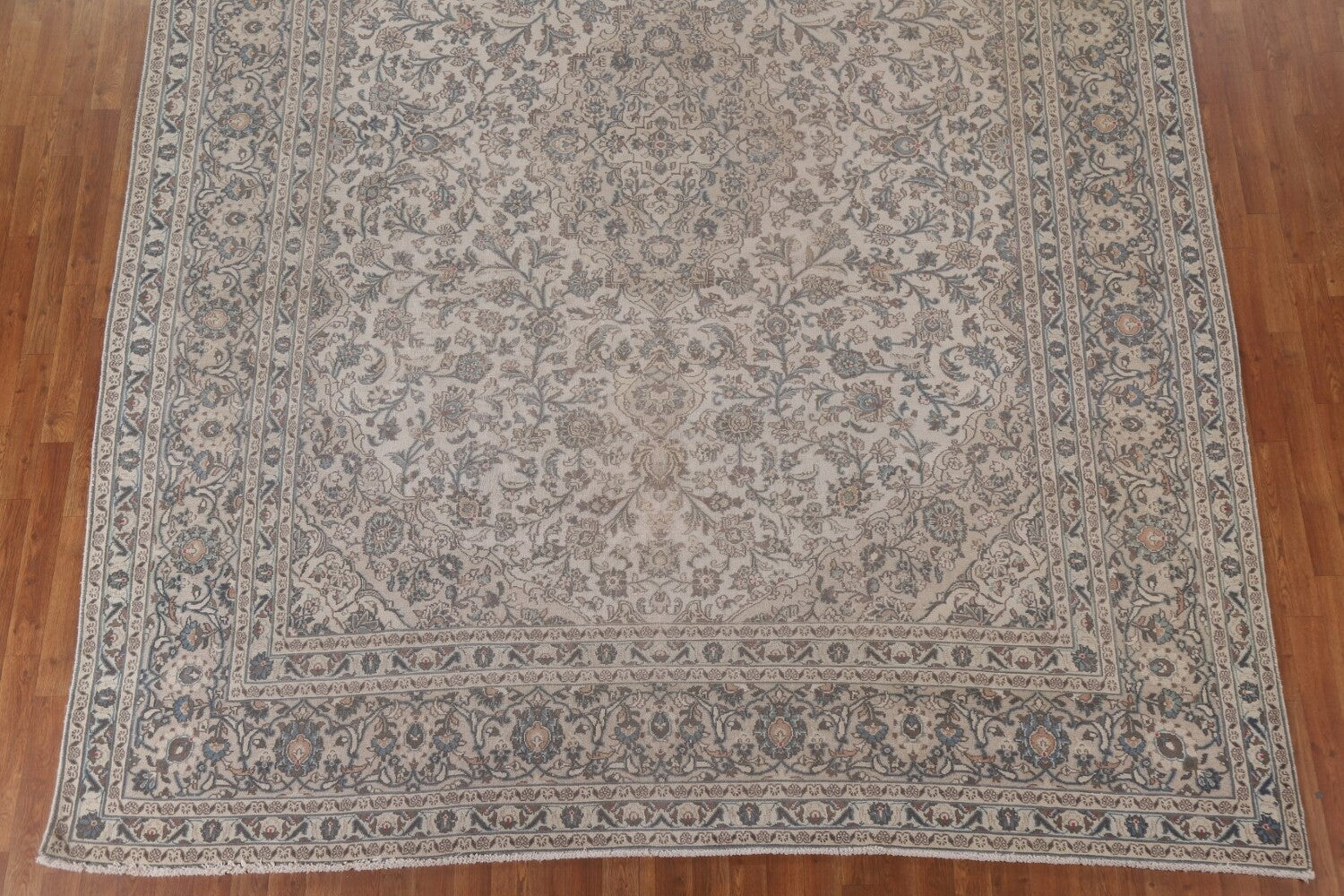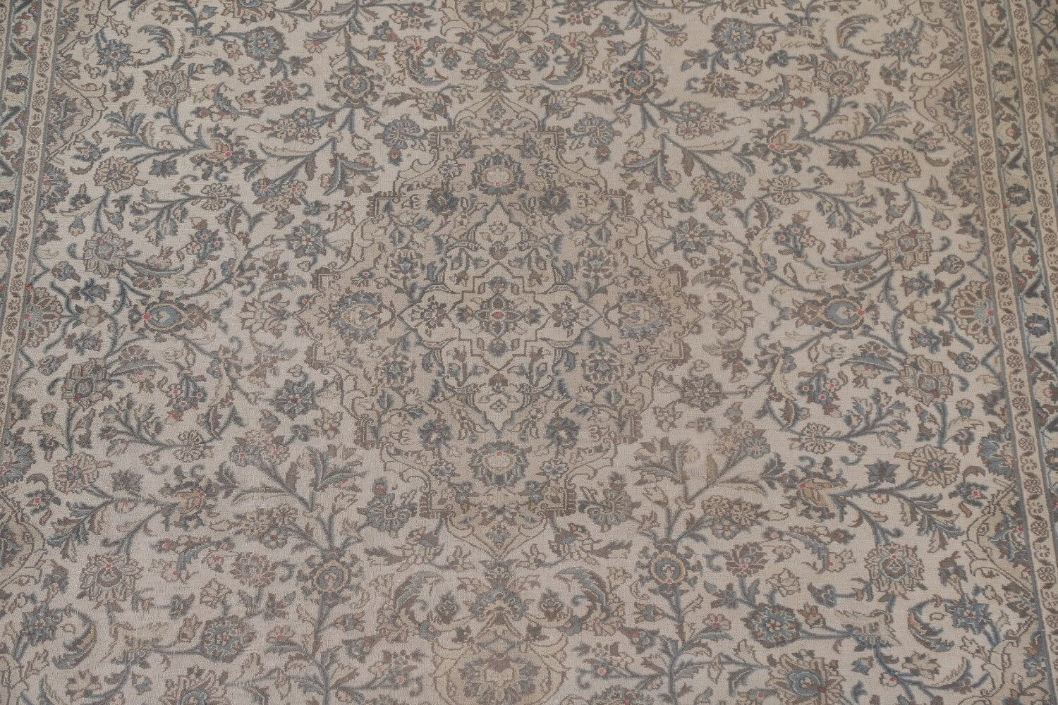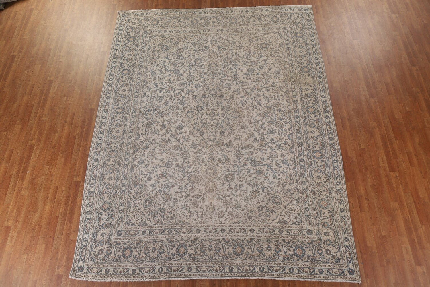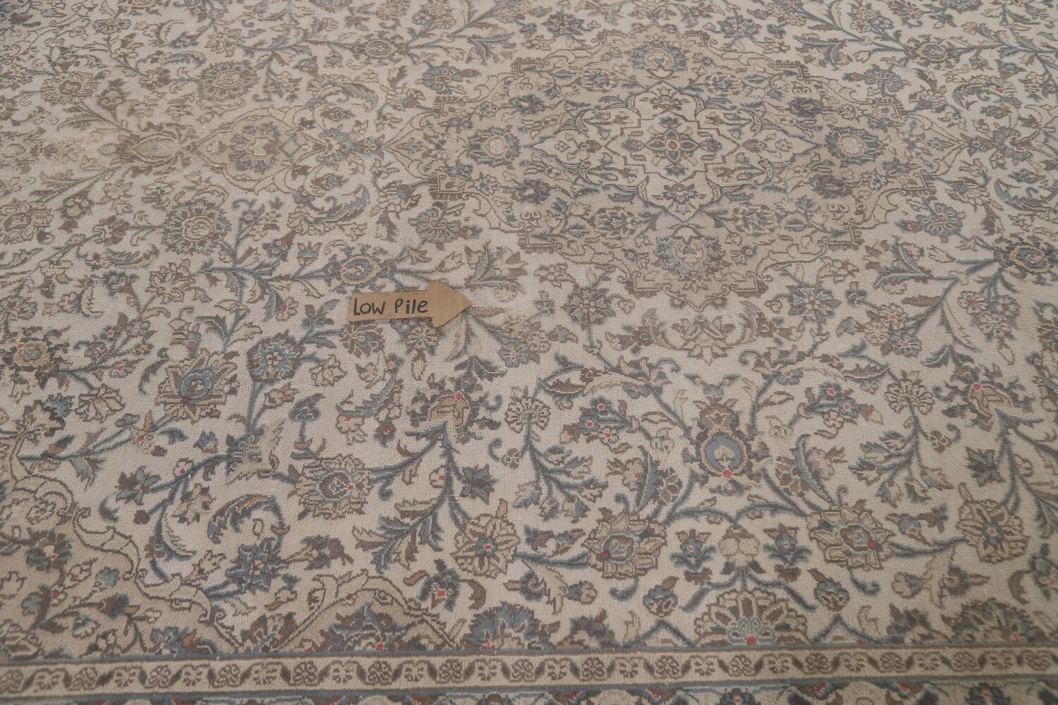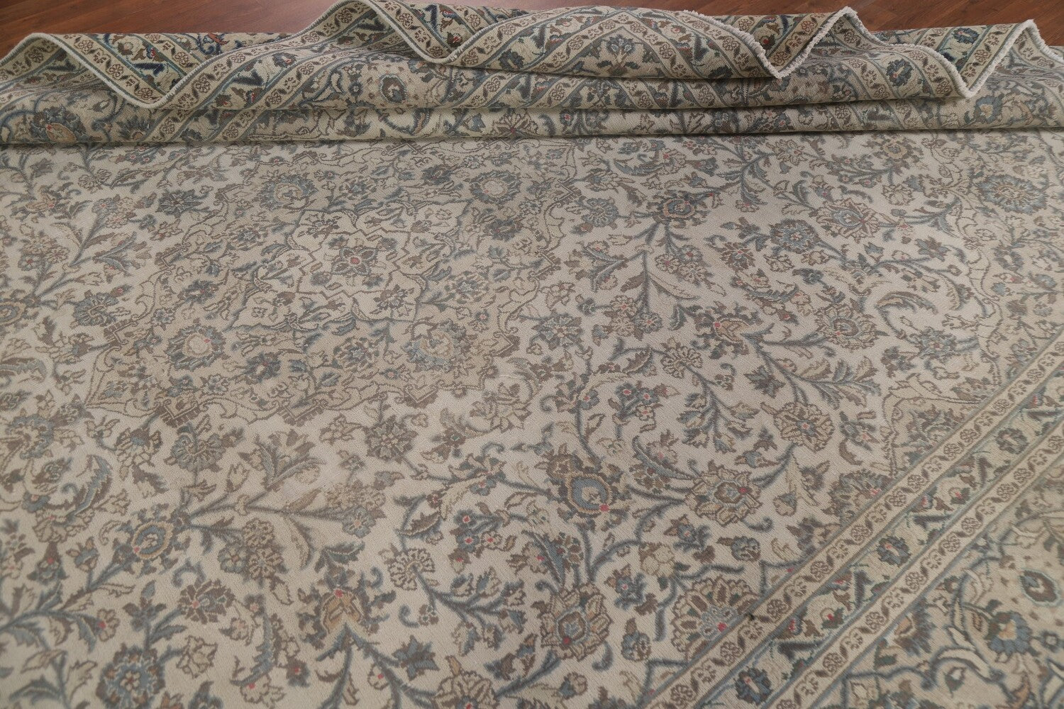 A Beautiful Genuine Persia ( Persia ) Kashan rug is Hand Knotted by skillful weavers in Persia ( Persia ) with 100% Wool Material. This rug is in Very Good (Evenly Low Pile) condition. dimensions are 12' 5'' X 9' 8'' in foot and 378 X 295 in centimeter. the primary color is Beige & Ivories.