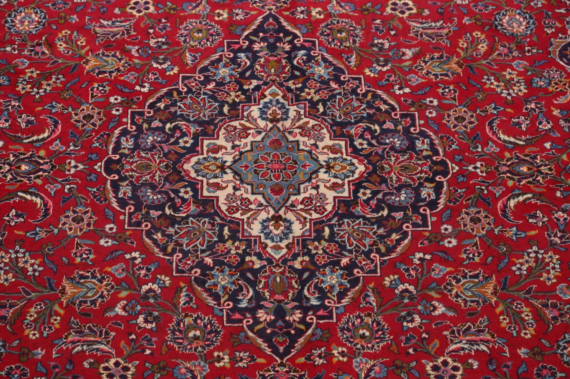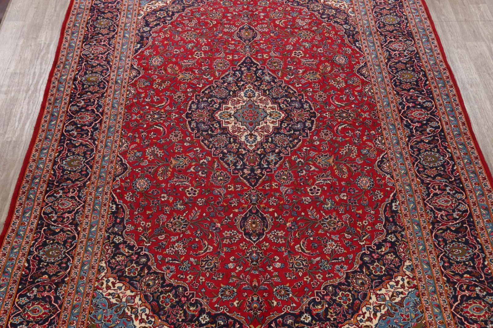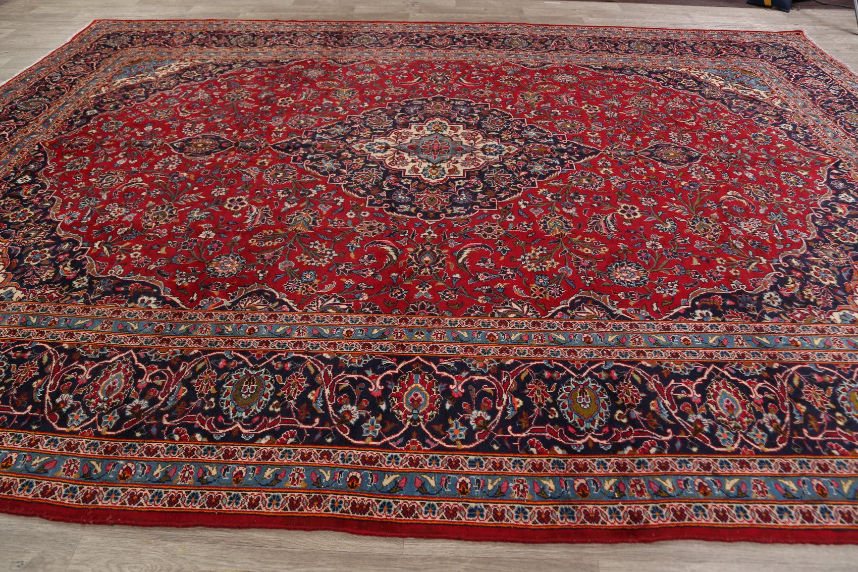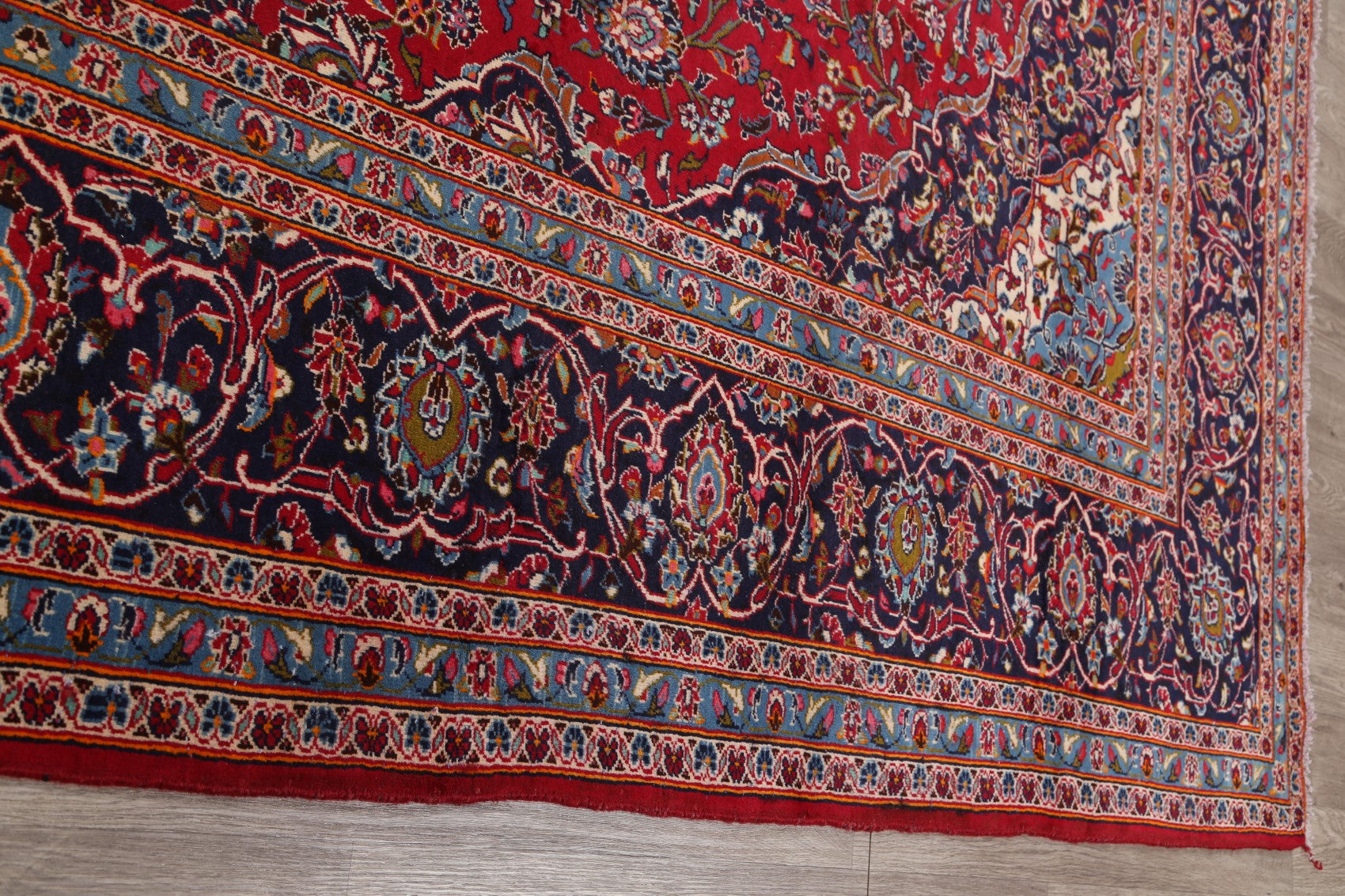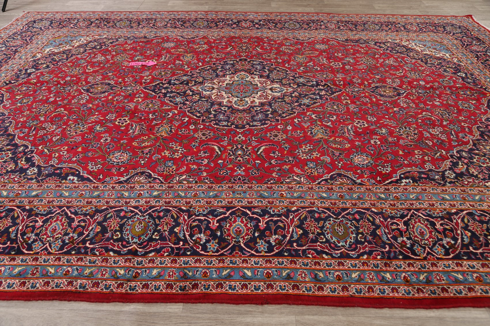 A Beautiful Genuine Persia ( Persia ) Kashan rug is Hand Knotted by skillful weavers in Persia ( Persia ) with 100% Wool Material. This rug is in Very Good ( Low Pile ) condition. dimensions are 13' 5'' X 9' 7'' in foot and 409 X 292 in centimeter. the primary color is Red.