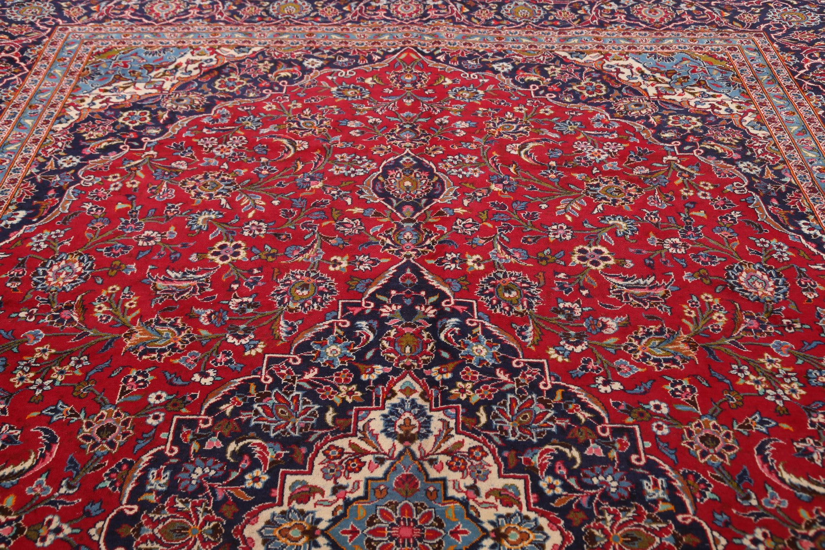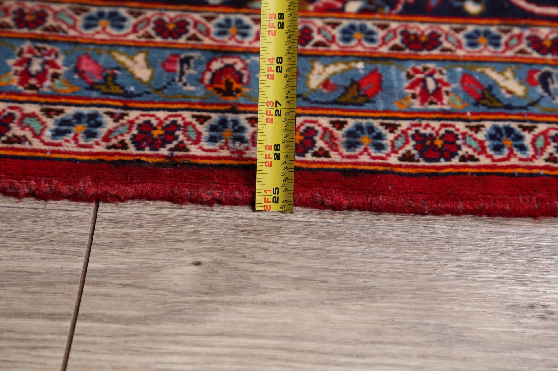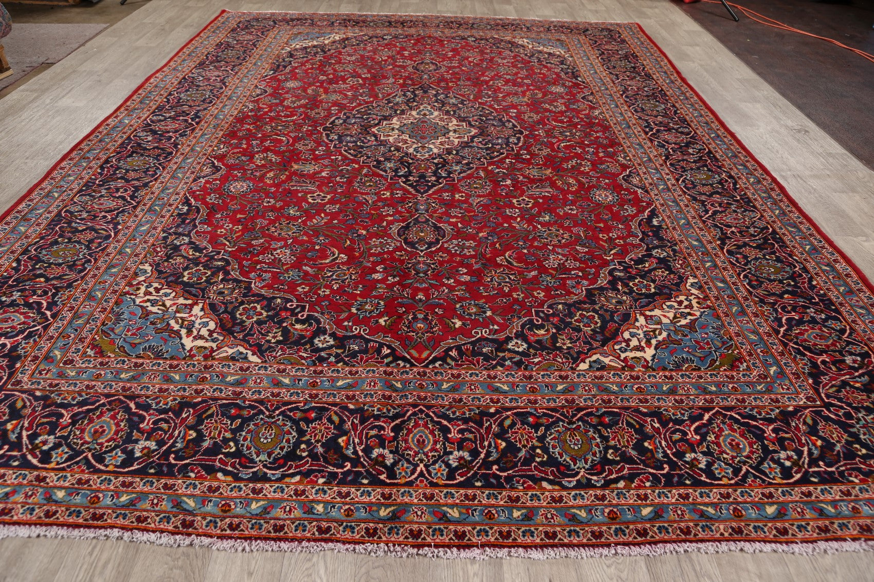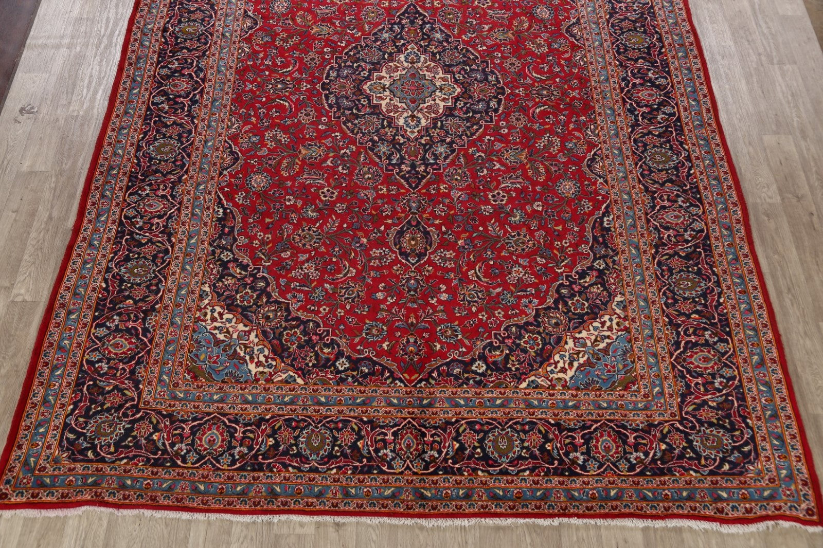 A Beautiful Genuine Persia ( Persia ) Kashan rug is Hand Knotted by skillful weavers in Persia ( Persia ) with 100% Wool Material. This rug is in Very Good ( Low Pile ) condition. dimensions are 13' 5'' X 9' 7'' in foot and 409 X 292 in centimeter. the primary color is Red.