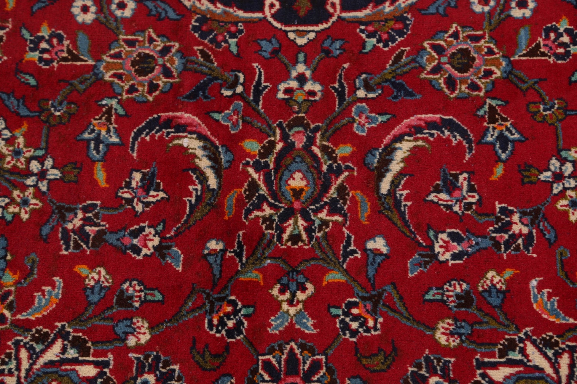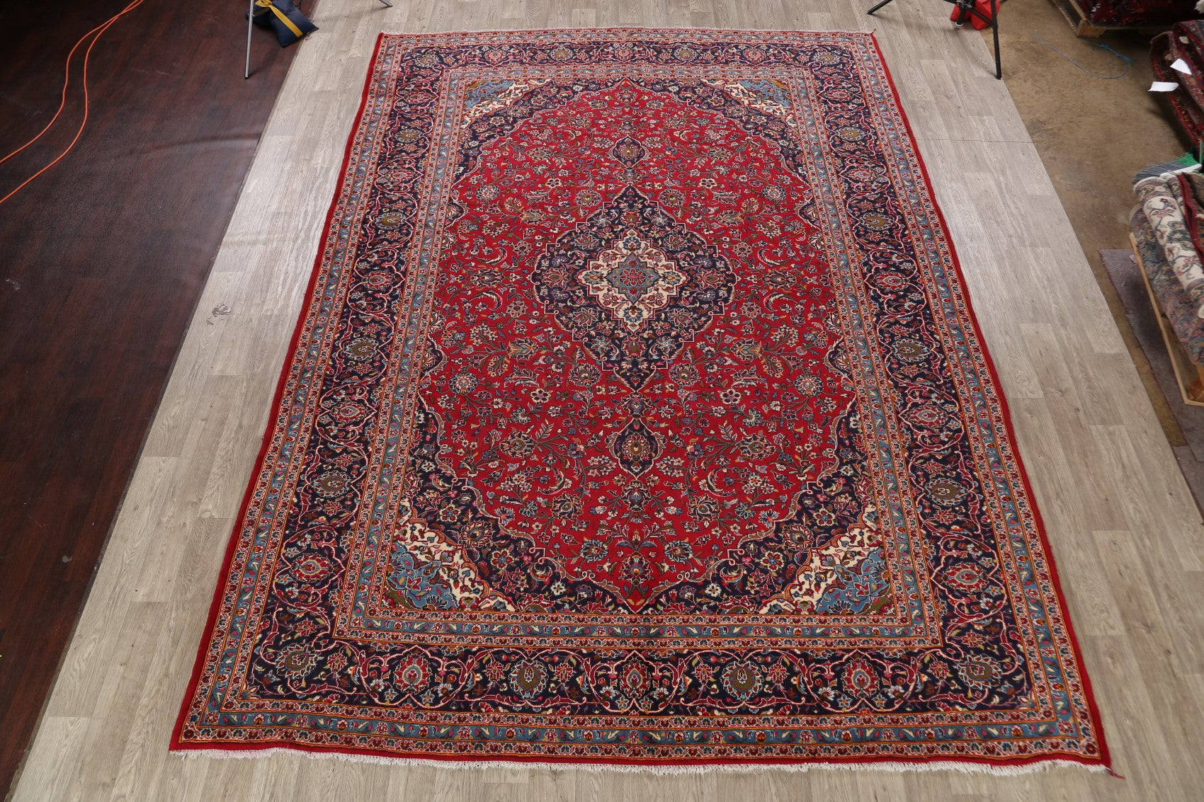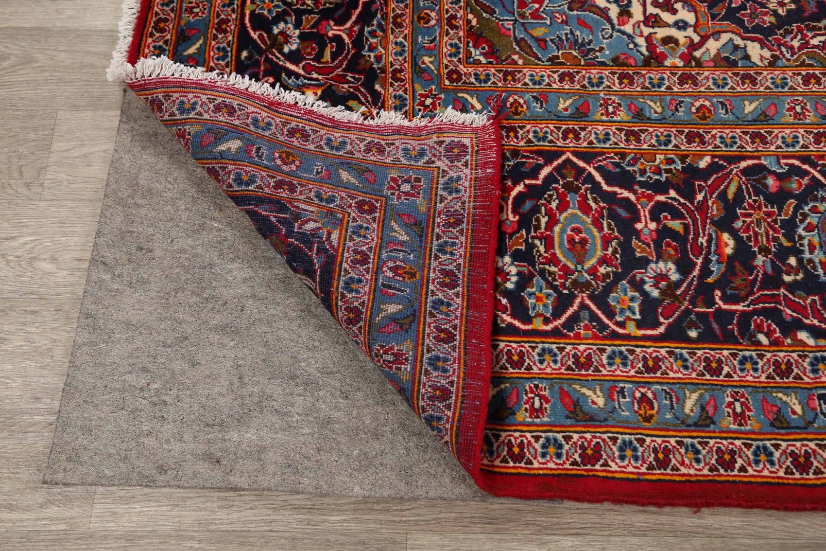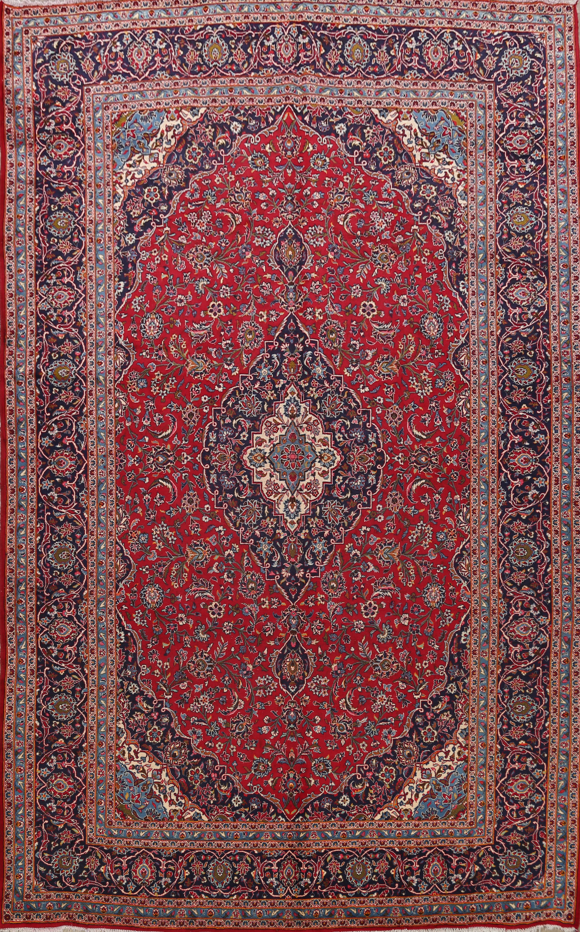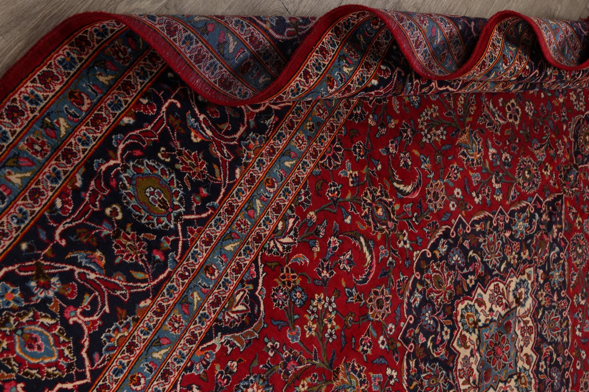 A Beautiful Genuine Persia ( Persia ) Kashan rug is Hand Knotted by skillful weavers in Persia ( Persia ) with 100% Wool Material. This rug is in Very Good ( Low Pile ) condition. dimensions are 13' 5'' X 9' 7'' in foot and 409 X 292 in centimeter. the primary color is Red.