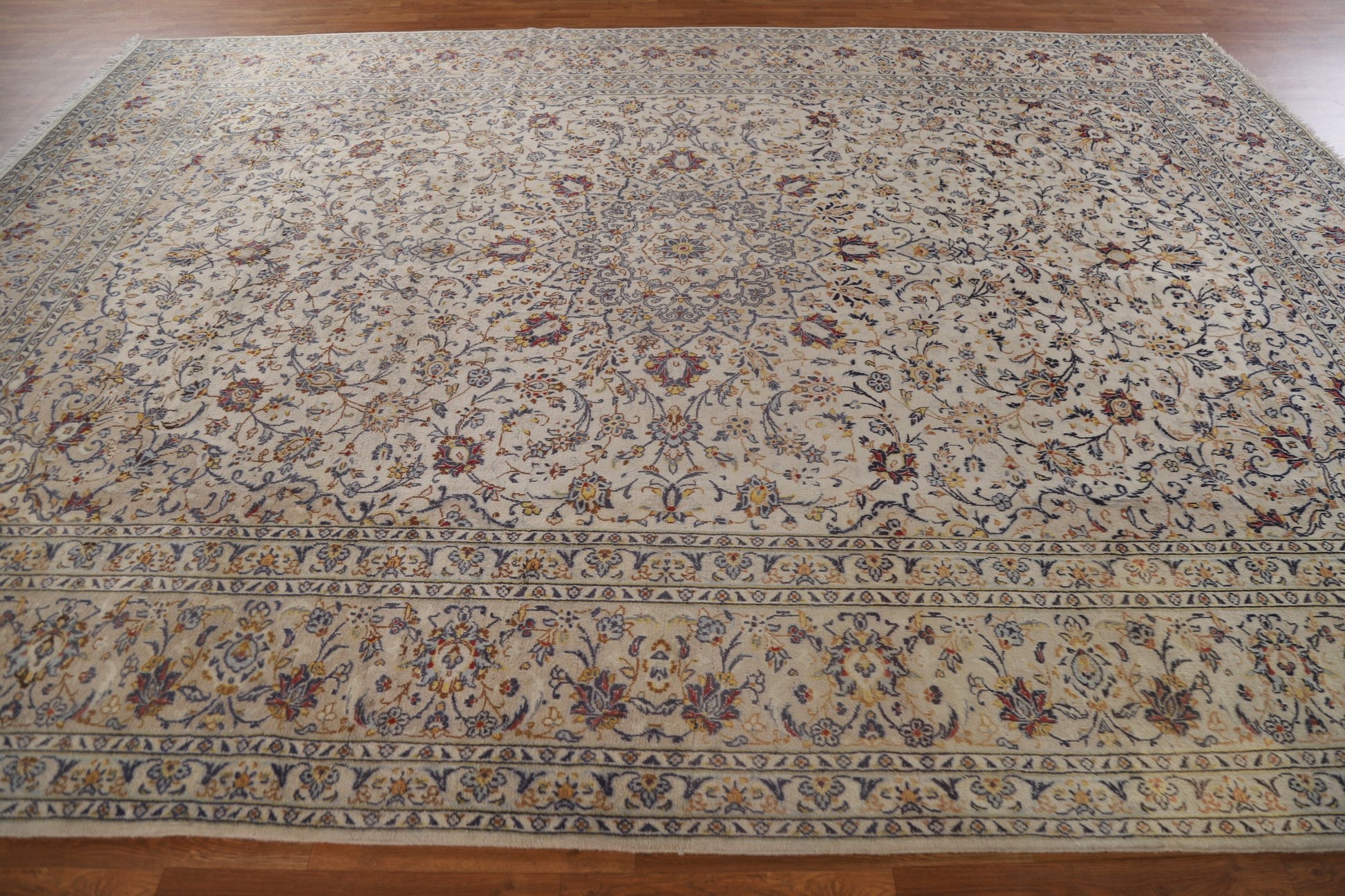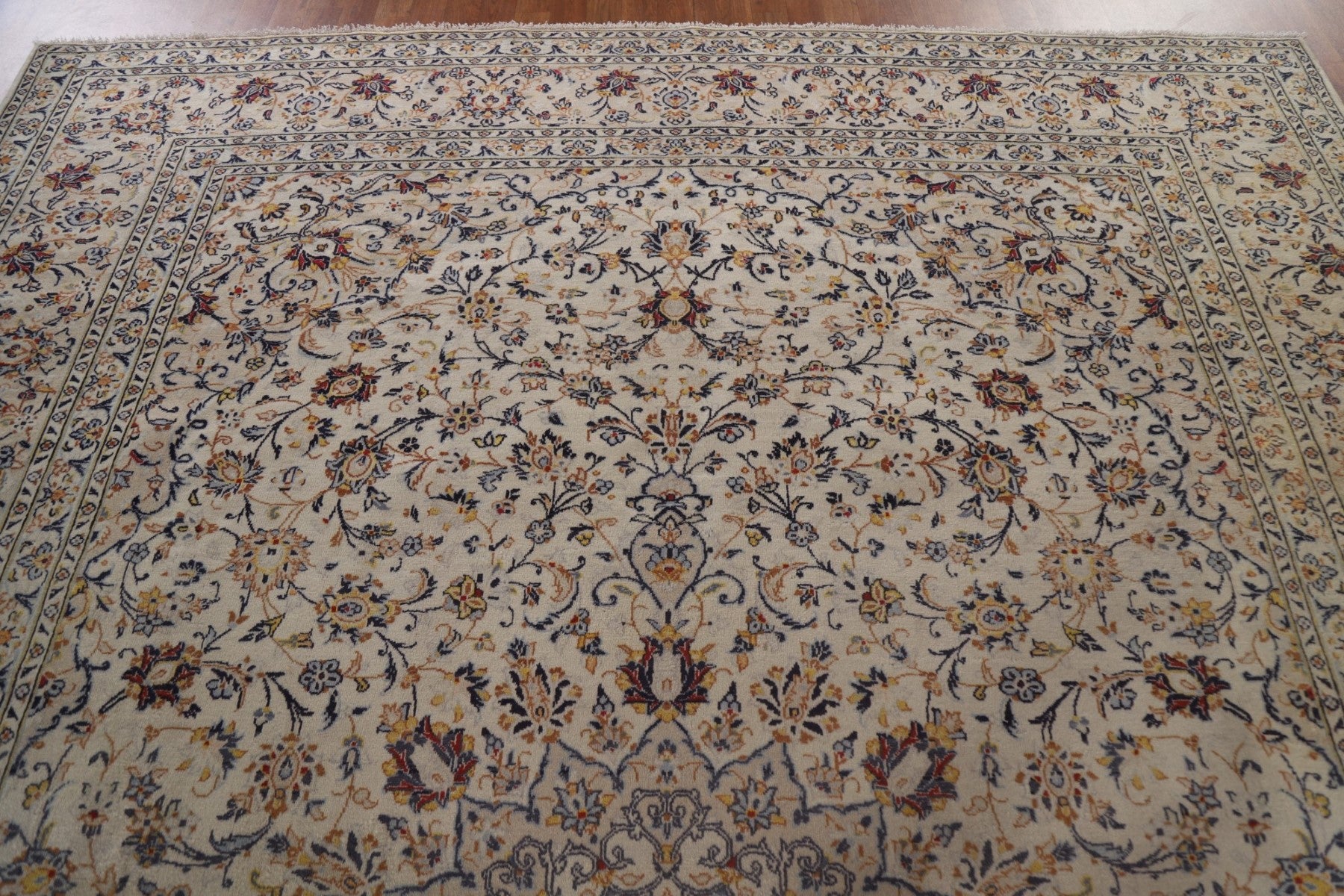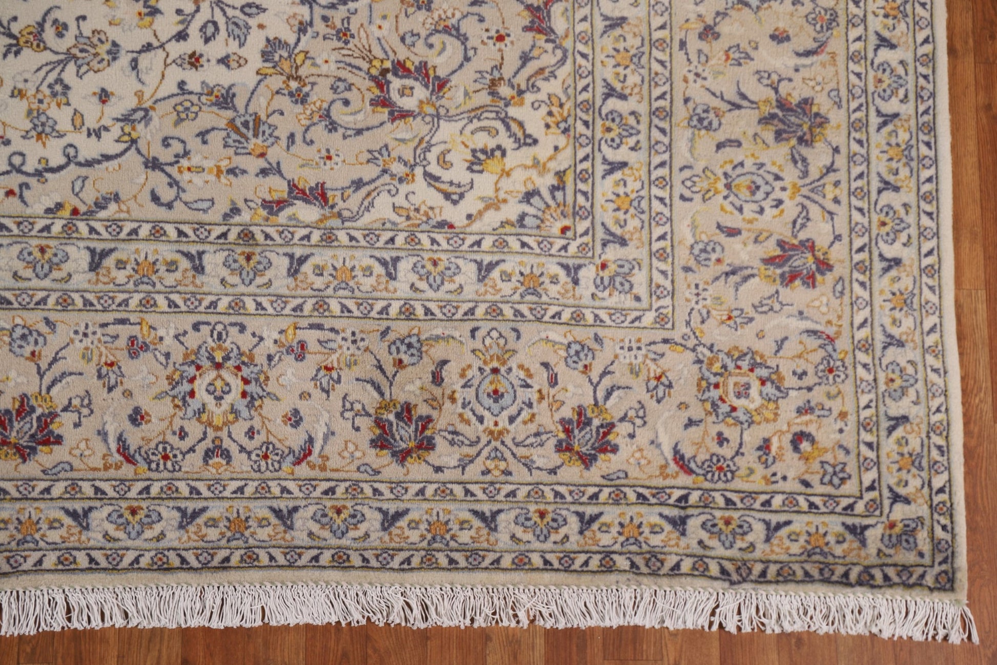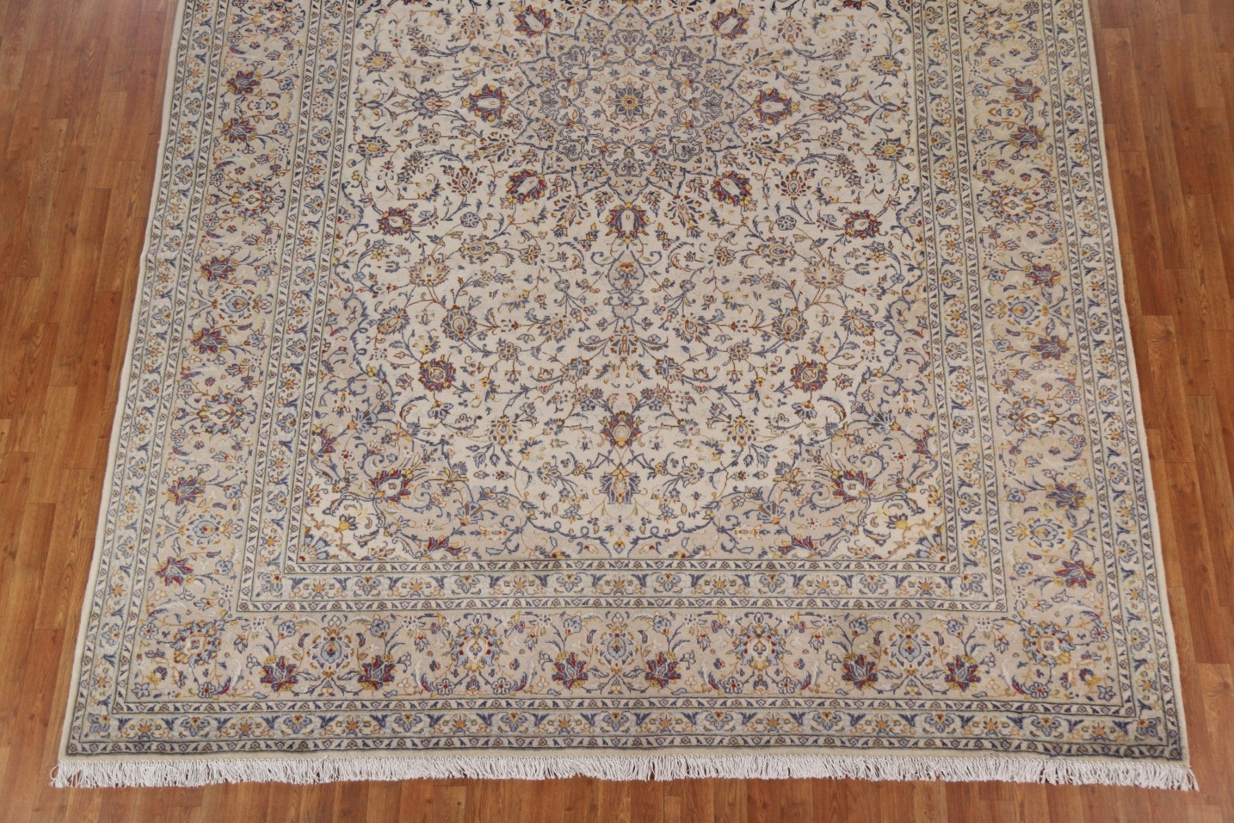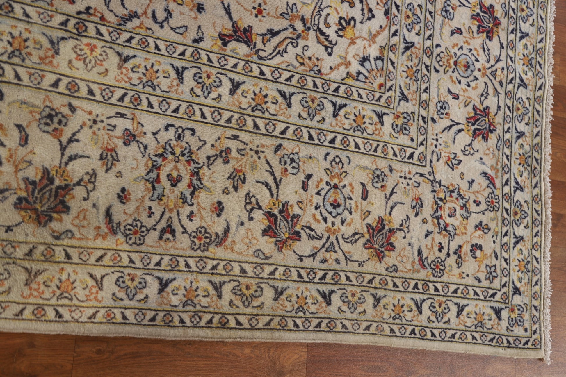 A Beautiful Genuine Persia ( Persia ) Kashan rug is Hand Knotted by skillful weavers in Persia ( Persia ) with 100% Wool Material. This rug is in Very Good (Abrash) condition. dimensions are 12' 11'' X 9' 6'' in foot and 394 X 290 in centimeter. the primary color is Beige & Ivories.