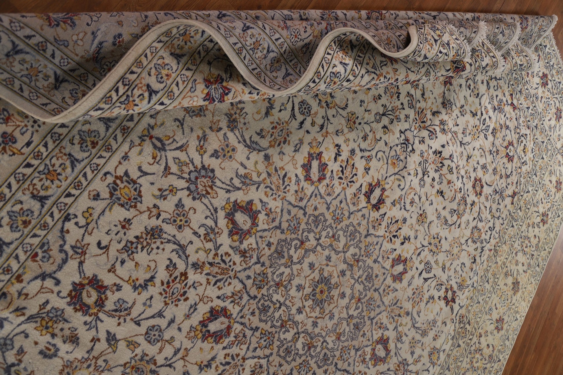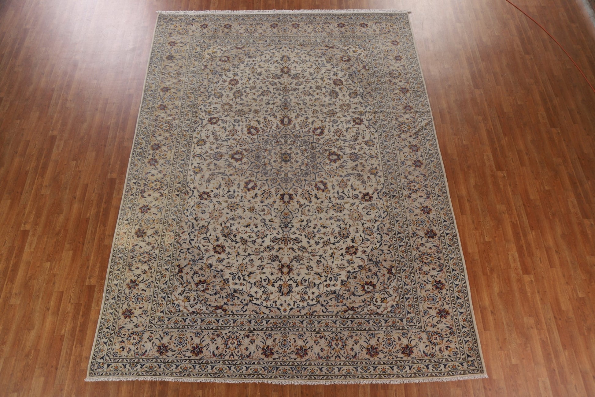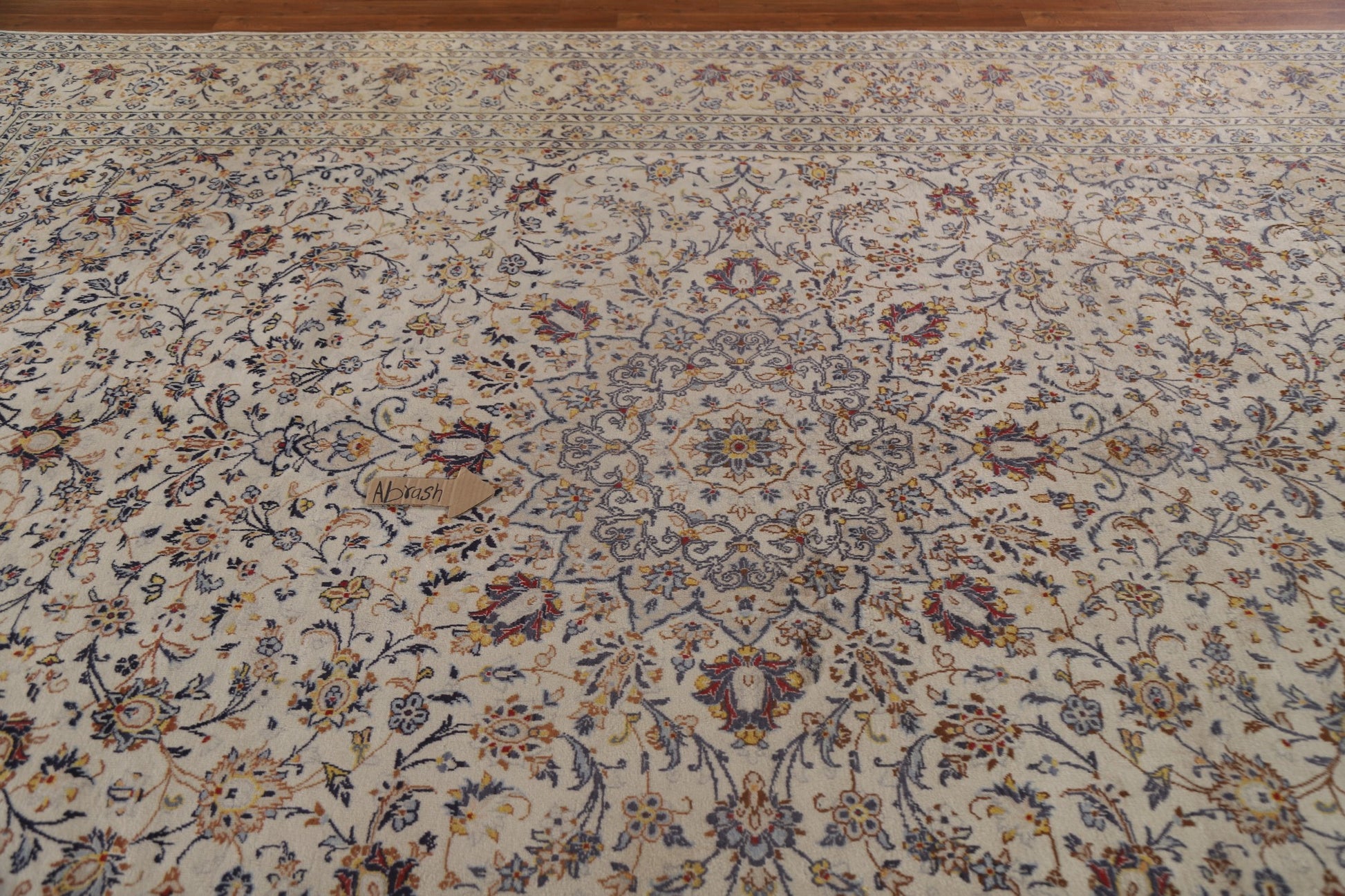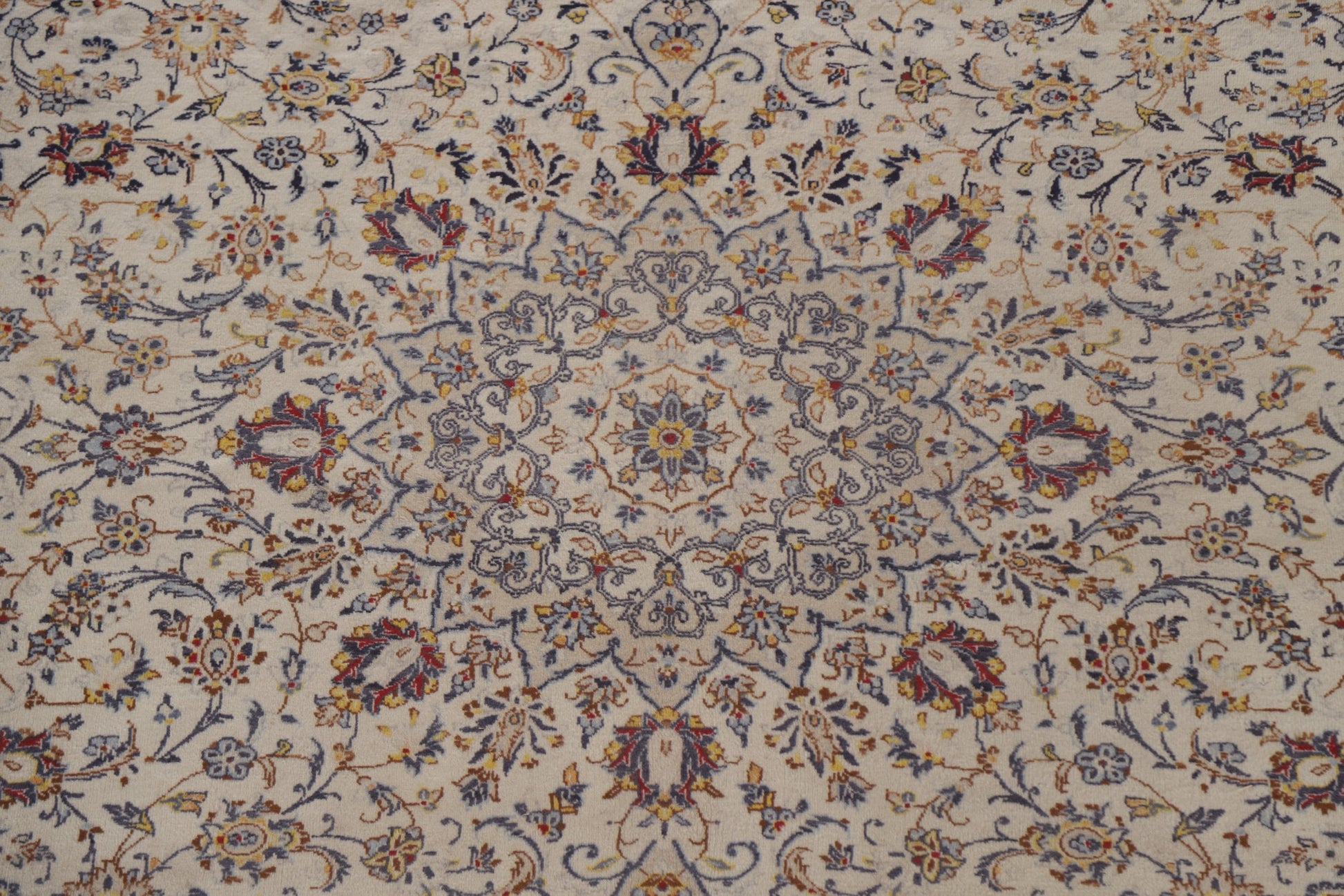 A Beautiful Genuine Persia ( Persia ) Kashan rug is Hand Knotted by skillful weavers in Persia ( Persia ) with 100% Wool Material. This rug is in Very Good (Abrash) condition. dimensions are 12' 11'' X 9' 6'' in foot and 394 X 290 in centimeter. the primary color is Beige & Ivories.