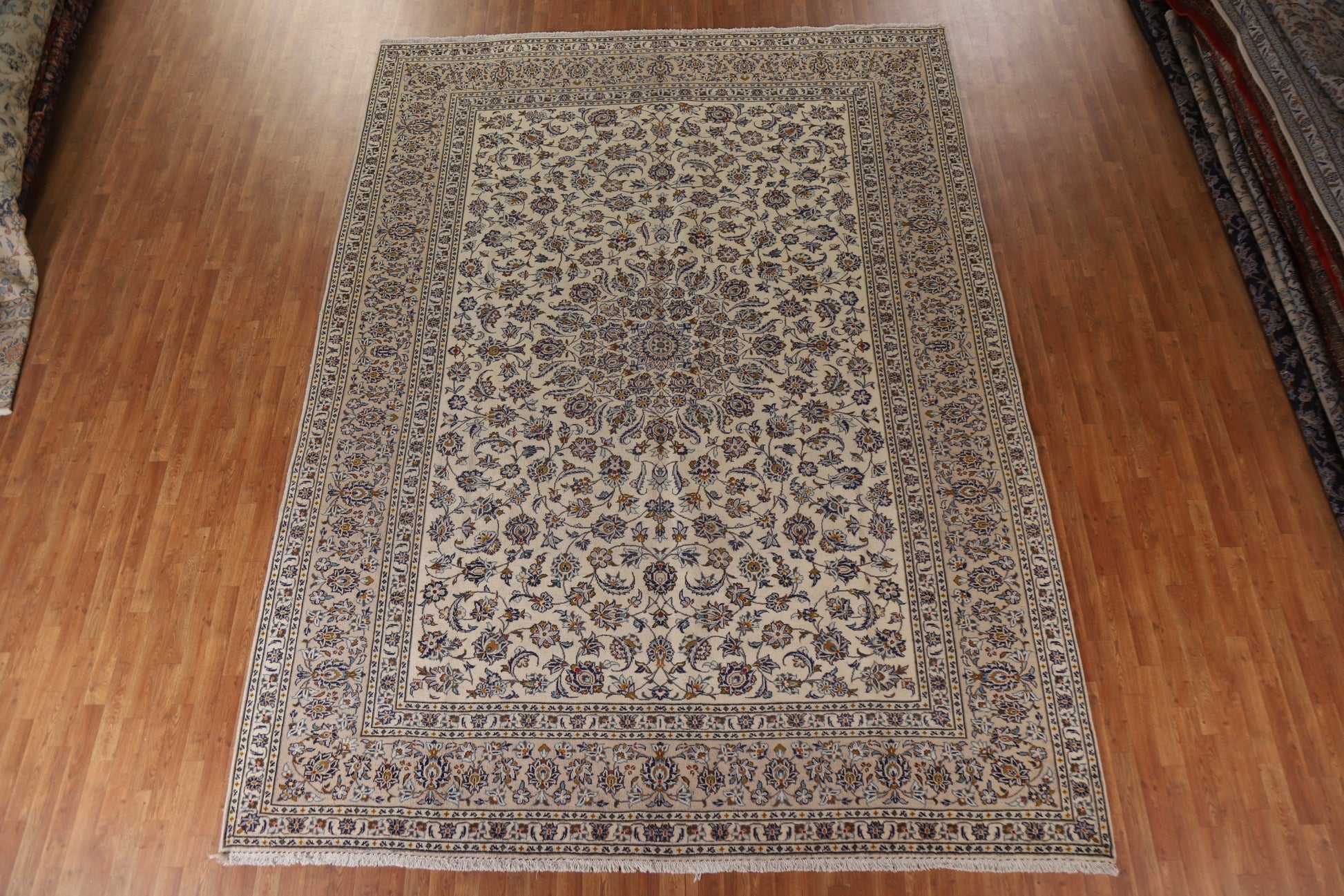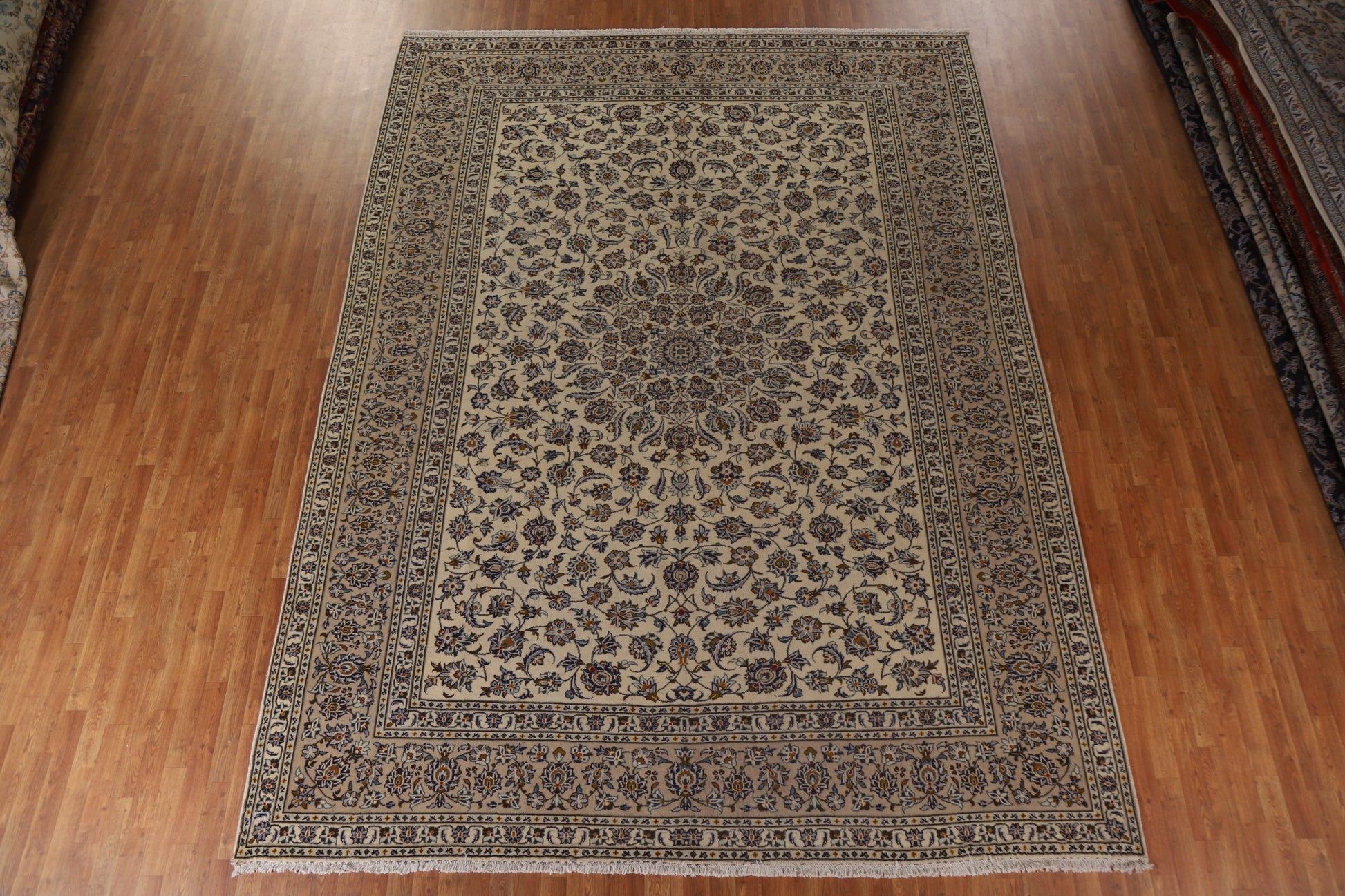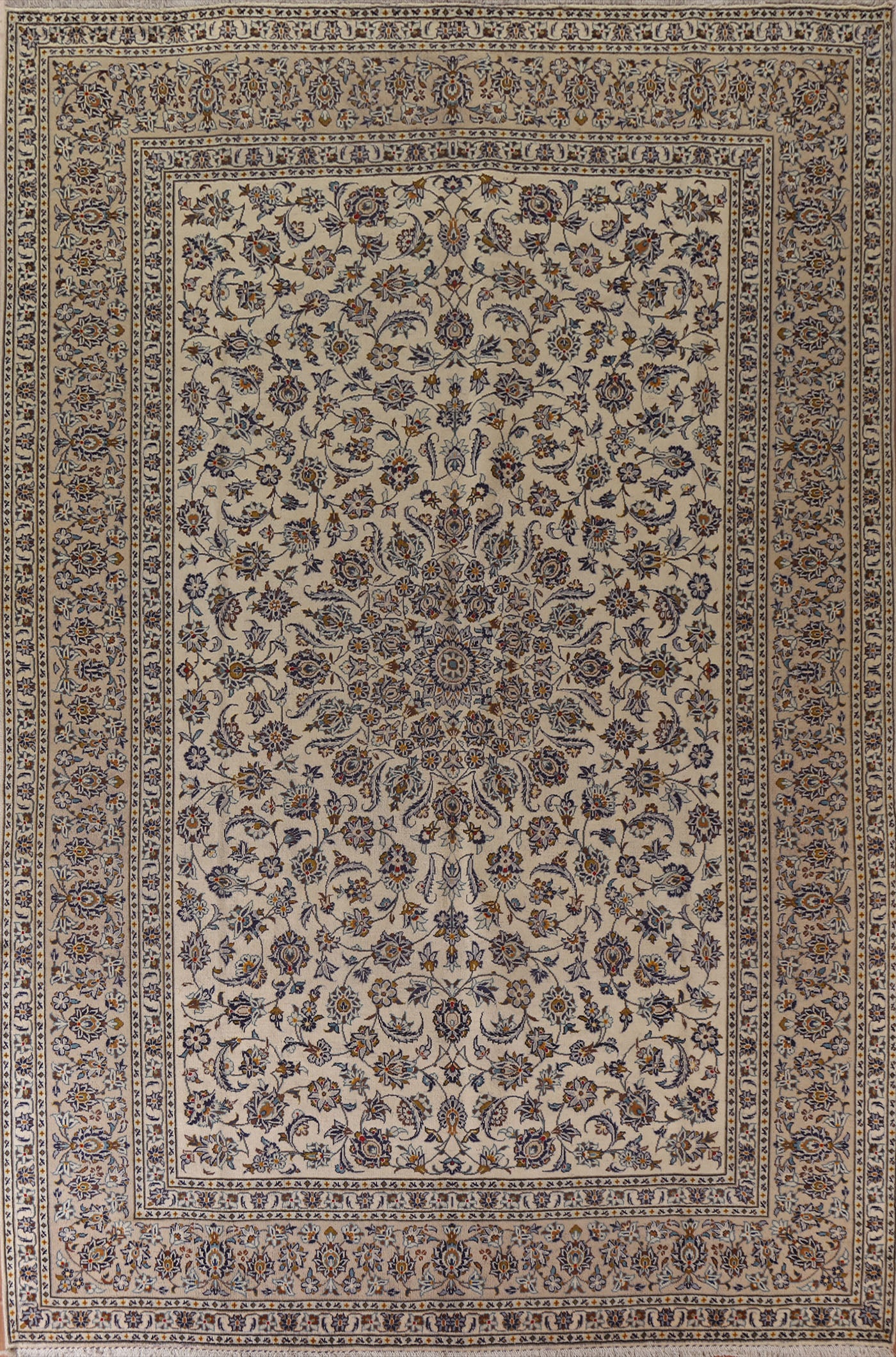 A Beautiful Genuine Persia ( Persia ) Kashan rug is Hand Knotted by skillful weavers in Persia ( Persia ) with 100% Wool Material. This rug is in Very Good condition. dimensions are 13' 3'' X 9' 10'' in foot and 404 X 300 in centimeter. the primary color is Beige & Ivories.