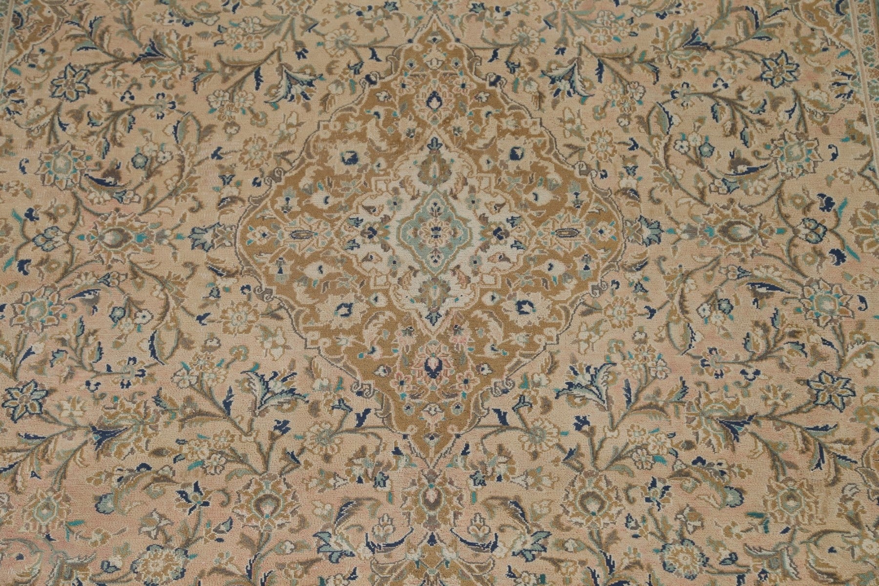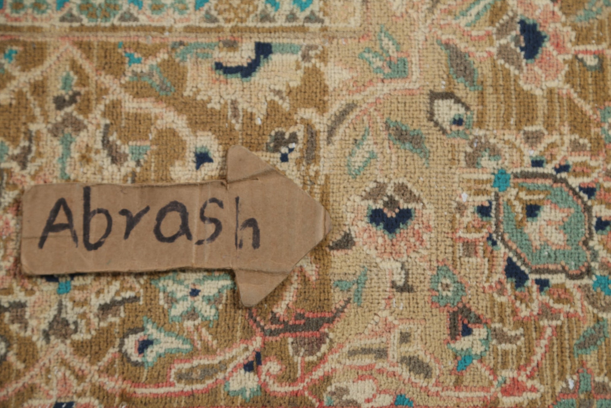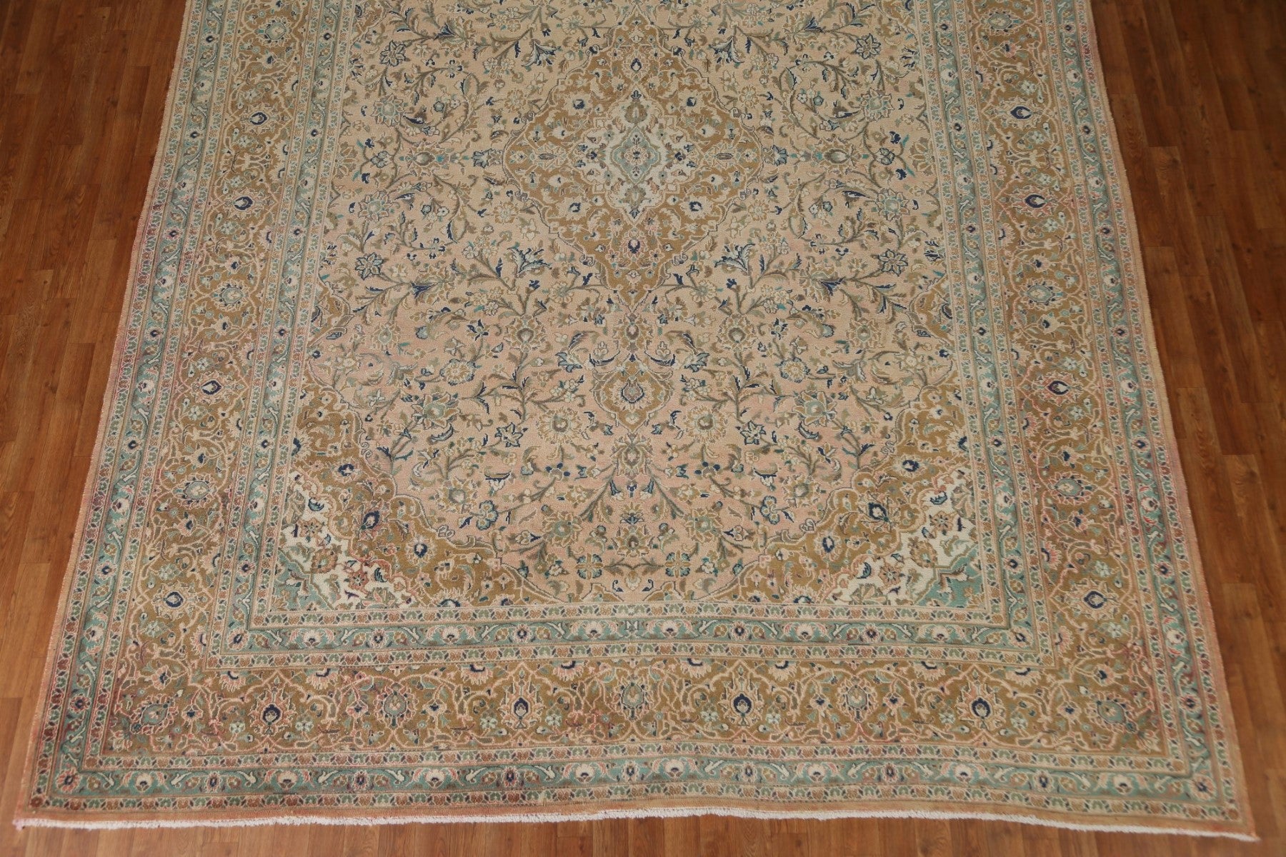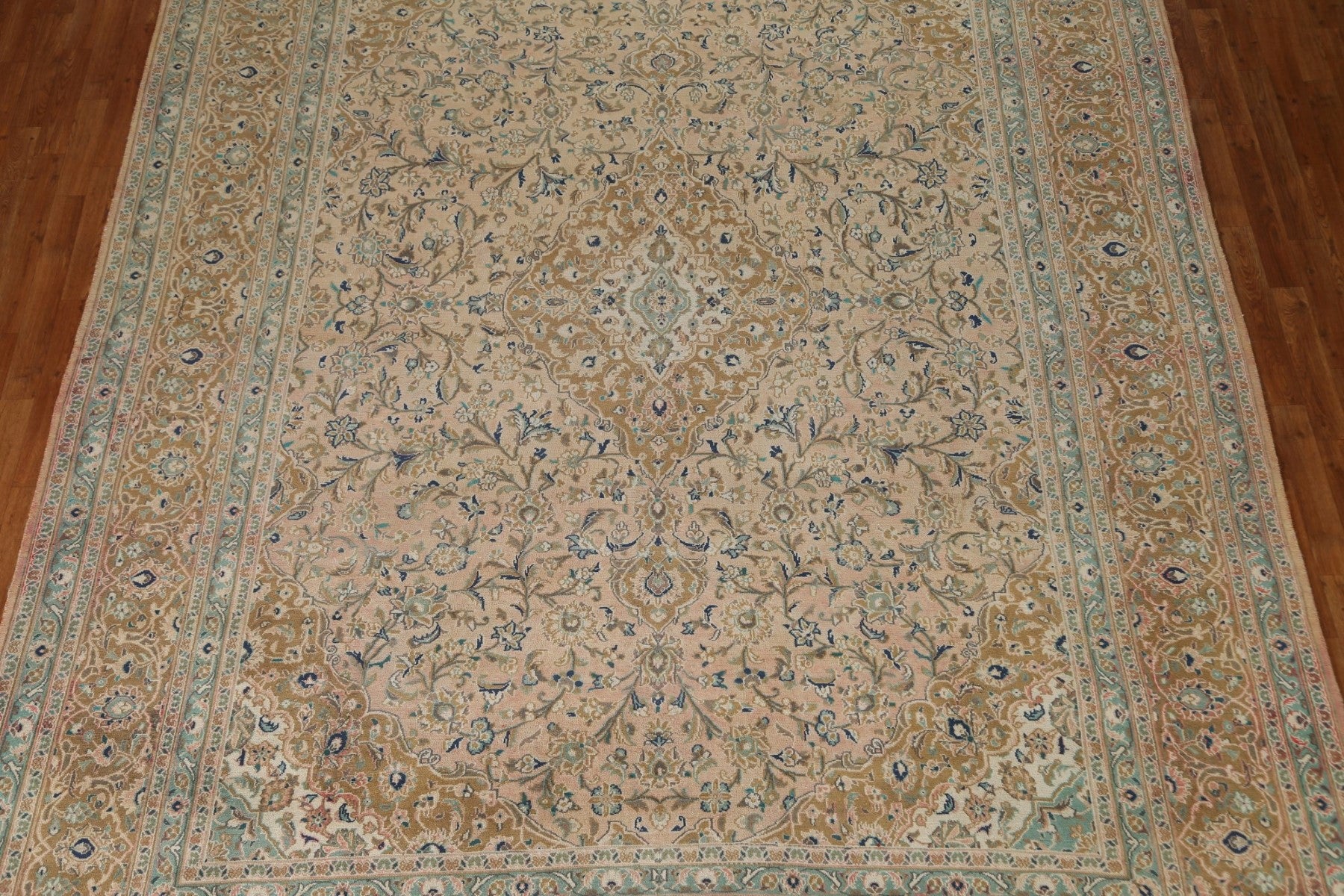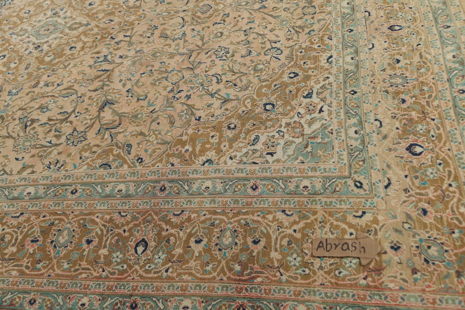 A Beautiful Genuine Persia ( Persia ) Kashan rug is Hand Knotted by skillful weavers in Persia ( Persia ) with 100% Wool Material. This rug is in Very Good (Low Pile-Abrash) condition. dimensions are 12' 6'' X 9' 8'' in foot and 381 X 295 in centimeter. the primary color is Peach.