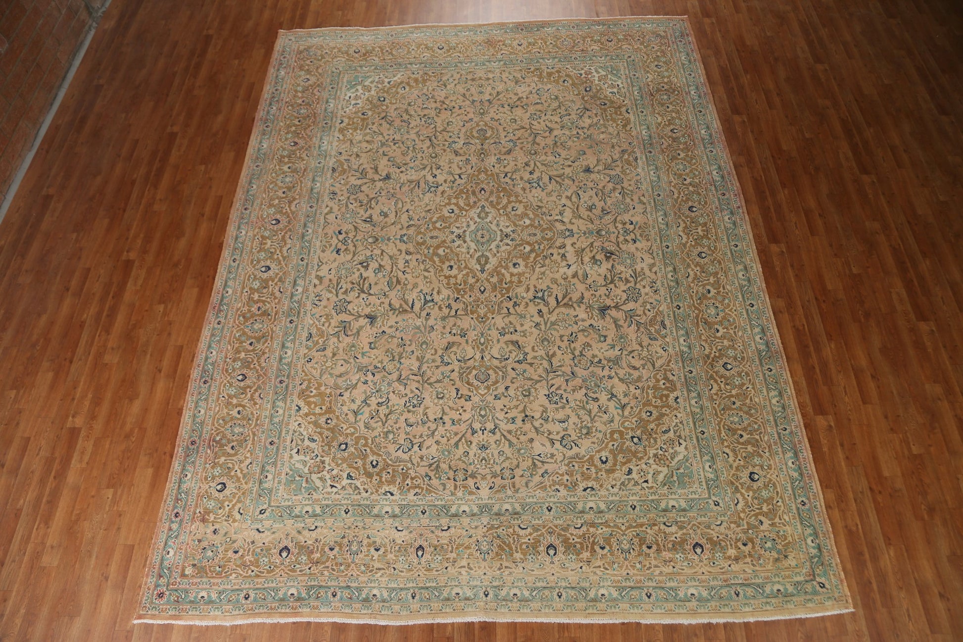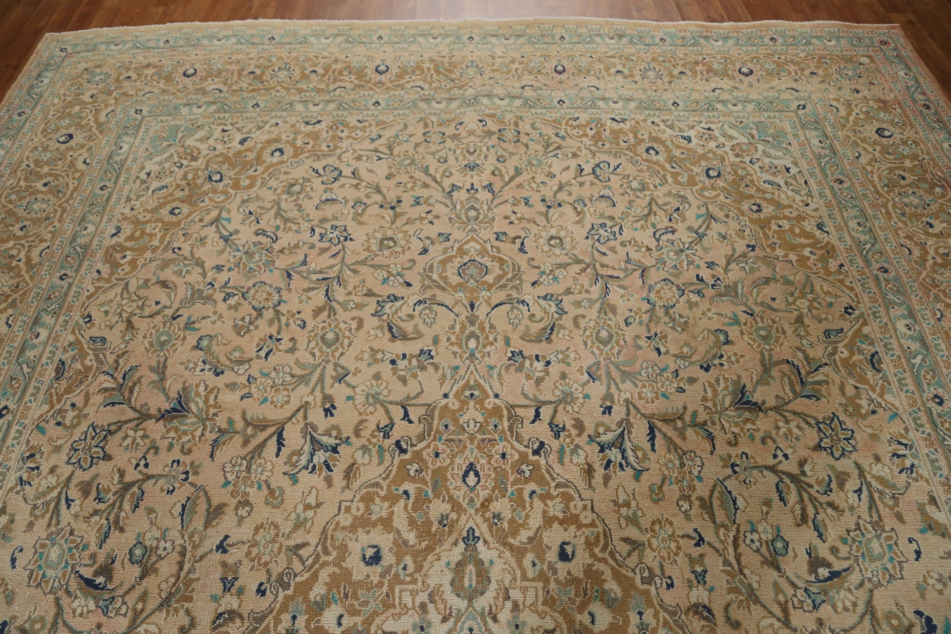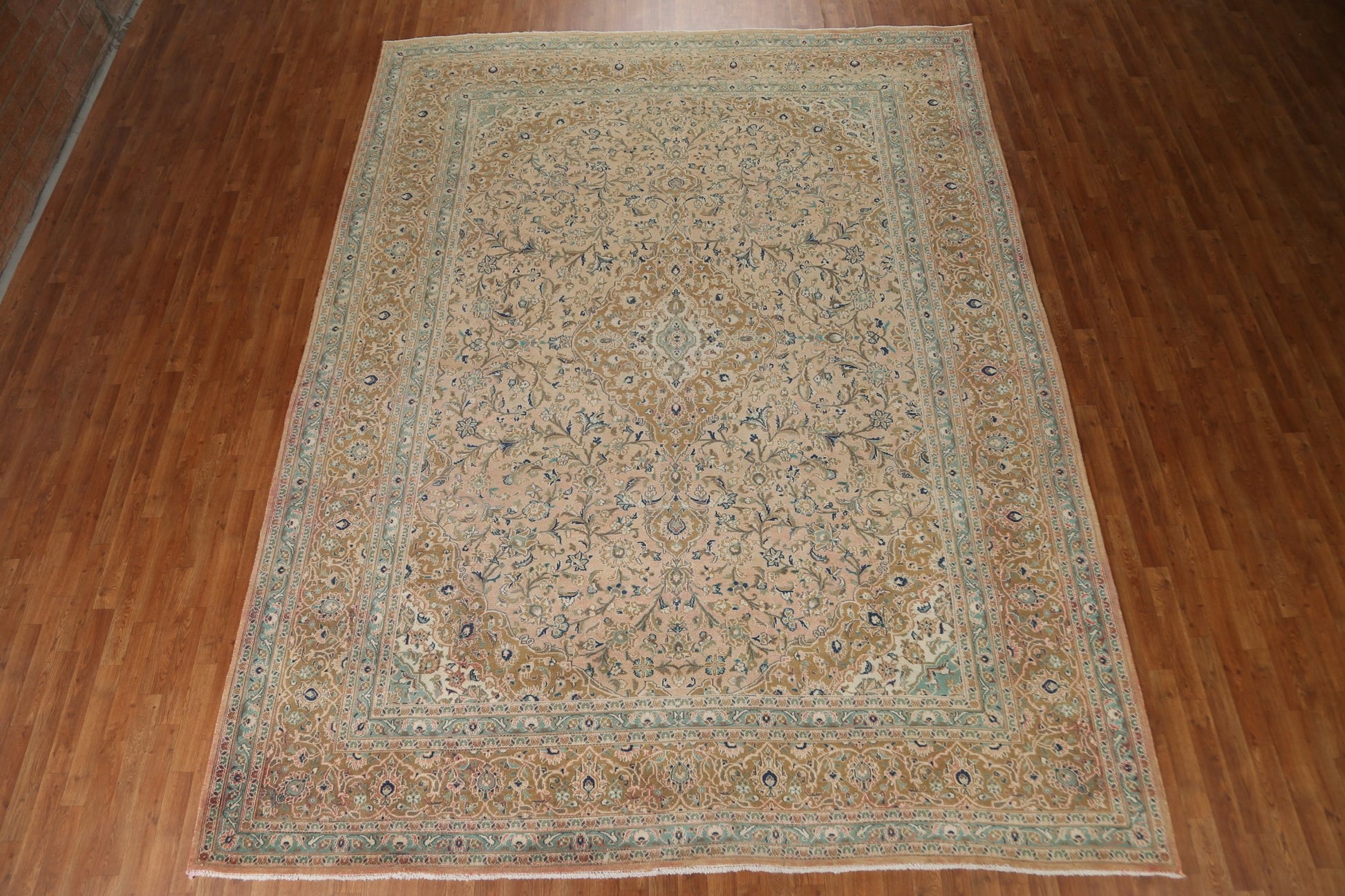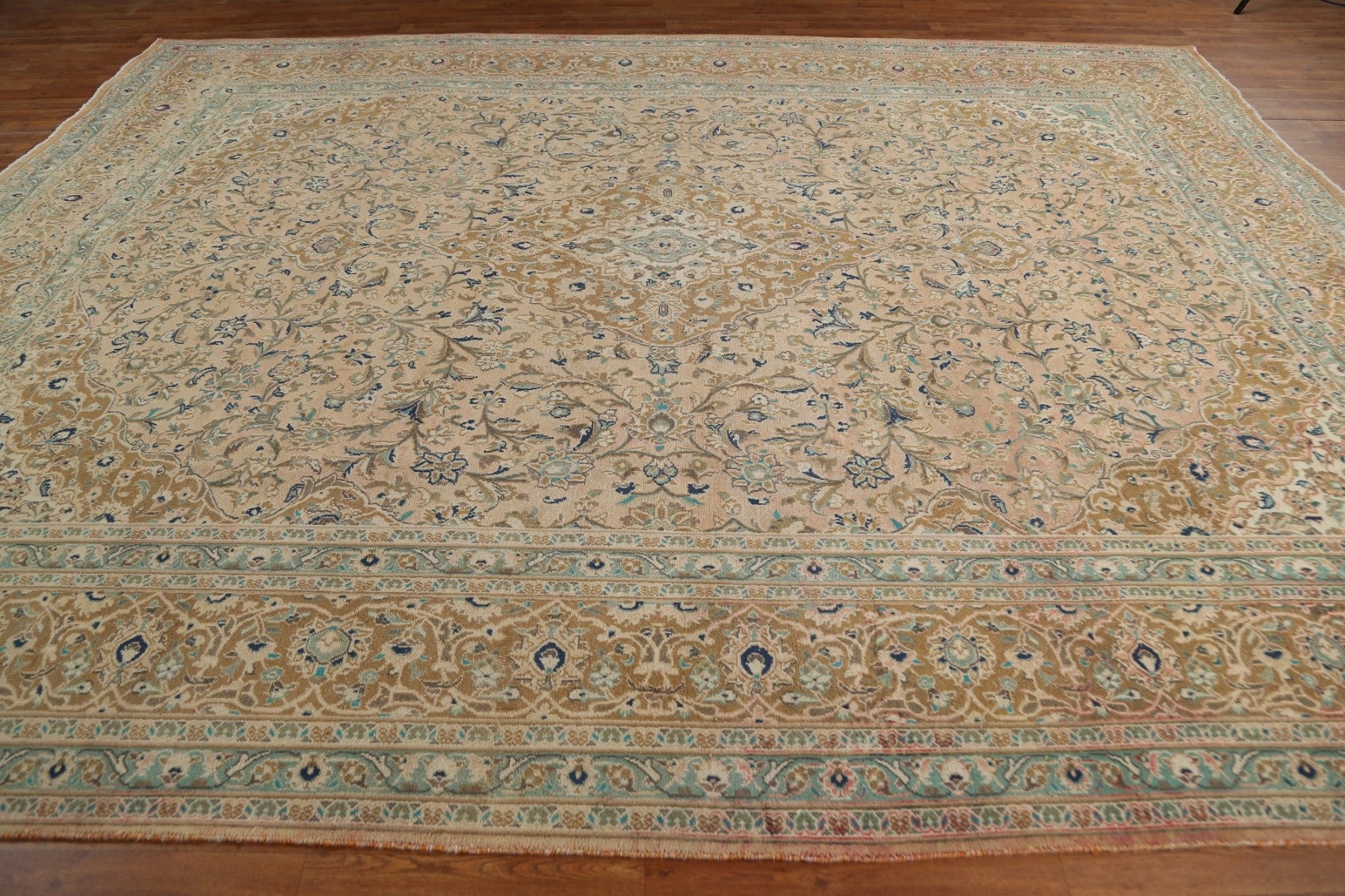 A Beautiful Genuine Persia ( Persia ) Kashan rug is Hand Knotted by skillful weavers in Persia ( Persia ) with 100% Wool Material. This rug is in Very Good (Low Pile-Abrash) condition. dimensions are 12' 6'' X 9' 8'' in foot and 381 X 295 in centimeter. the primary color is Peach.