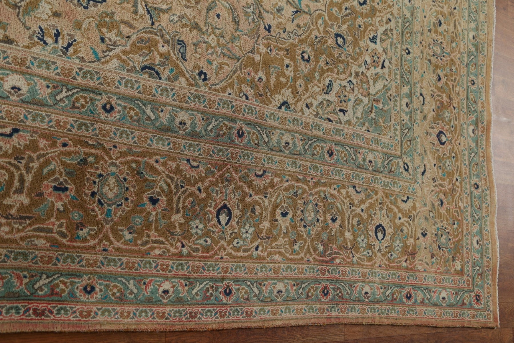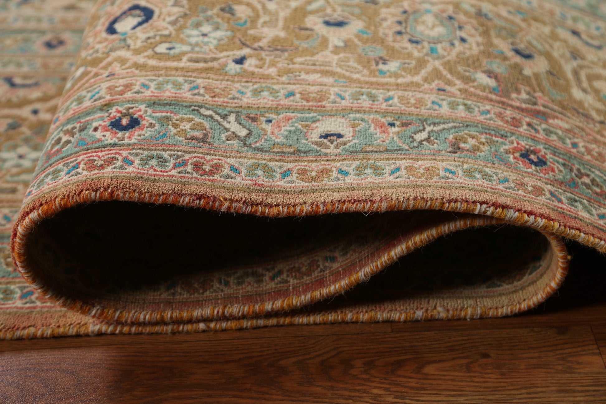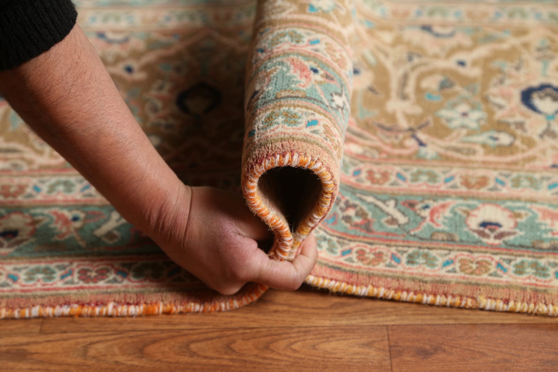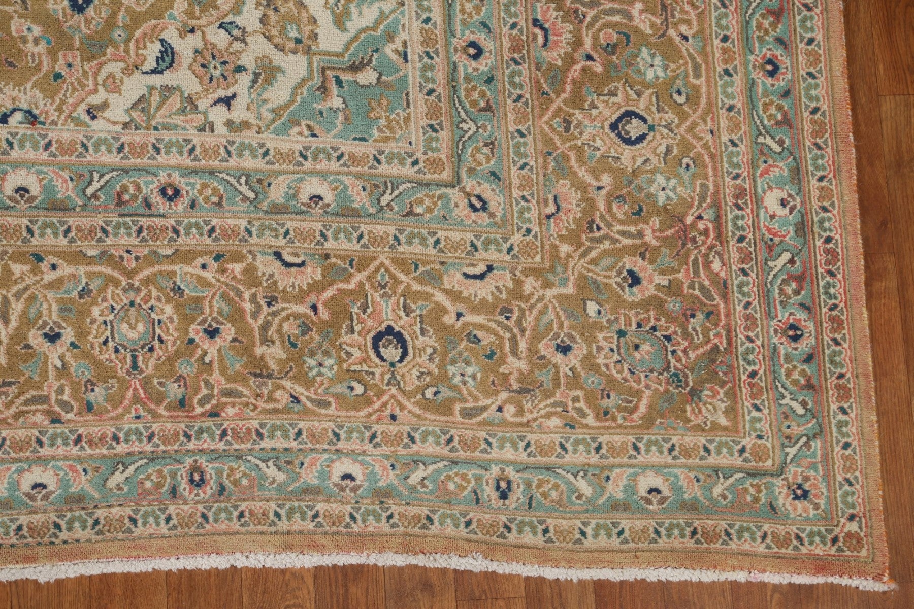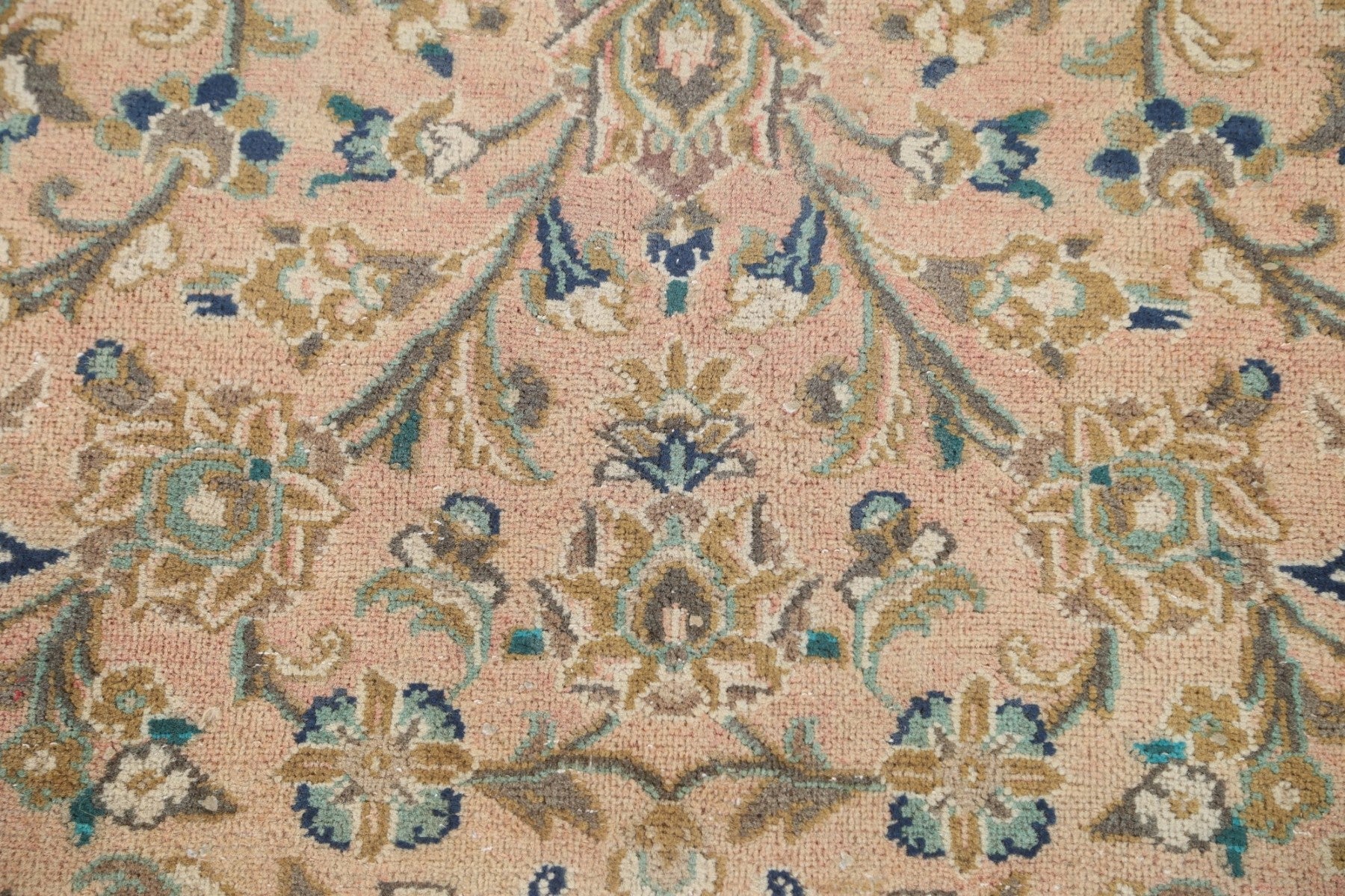 A Beautiful Genuine Persia ( Persia ) Kashan rug is Hand Knotted by skillful weavers in Persia ( Persia ) with 100% Wool Material. This rug is in Very Good (Low Pile-Abrash) condition. dimensions are 12' 6'' X 9' 8'' in foot and 381 X 295 in centimeter. the primary color is Peach.