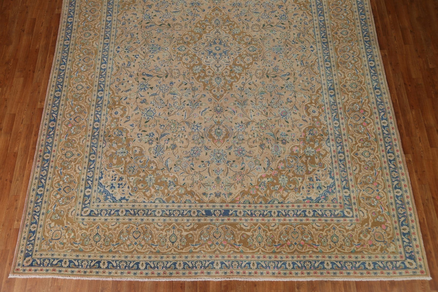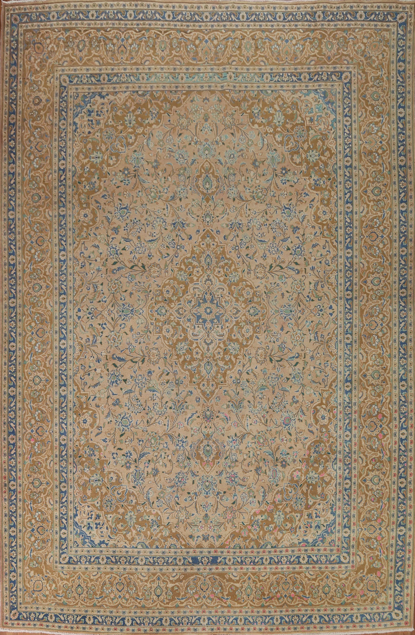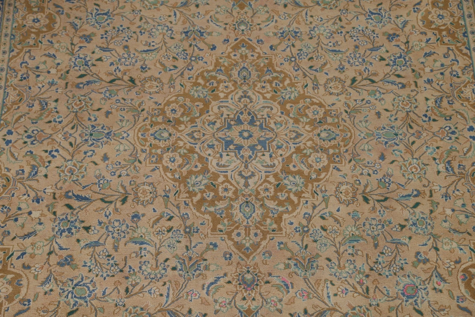 A Beautiful Genuine Persia ( Persia ) Kashan rug is Hand Knotted by skillful weavers in Persia ( Persia ) with 100% Wool Material. This rug is in Very Good (Evenly Low Pile) condition. dimensions are 12' 7'' X 9' 7'' in foot and 384 X 292 in centimeter. the primary color is Peach.