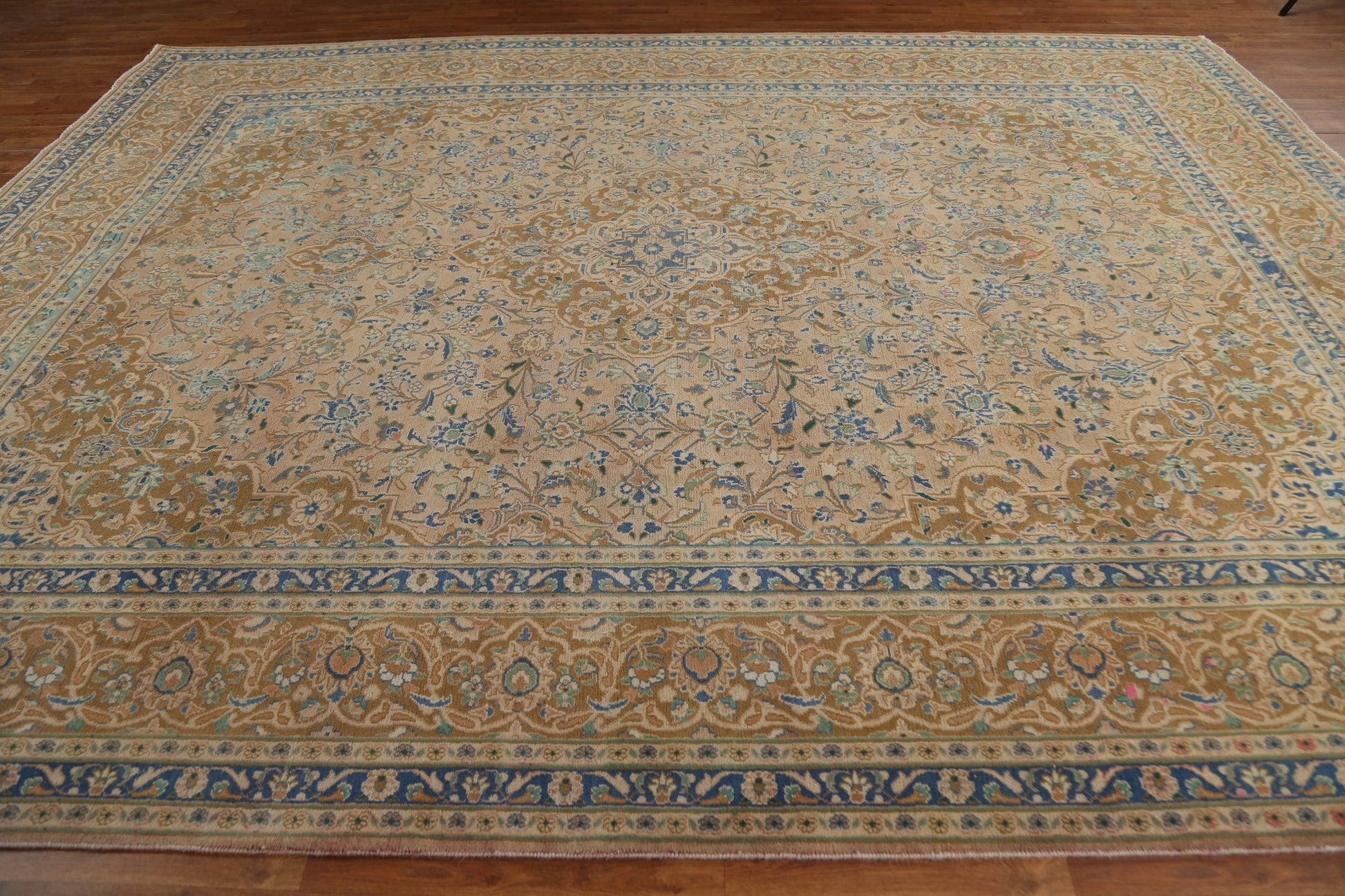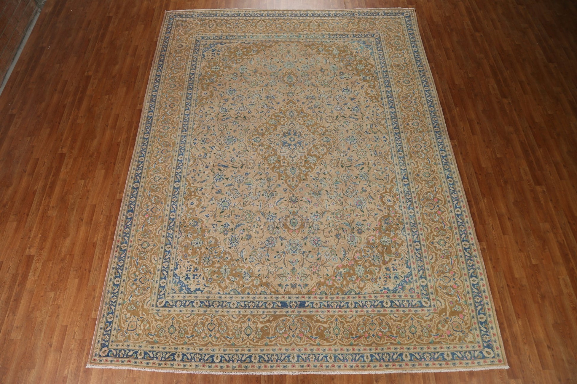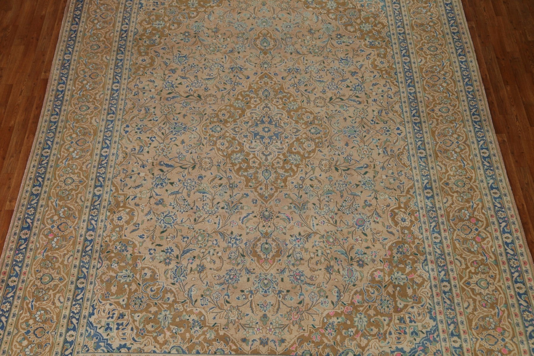 A Beautiful Genuine Persia ( Persia ) Kashan rug is Hand Knotted by skillful weavers in Persia ( Persia ) with 100% Wool Material. This rug is in Very Good (Evenly Low Pile) condition. dimensions are 12' 7'' X 9' 7'' in foot and 384 X 292 in centimeter. the primary color is Peach.