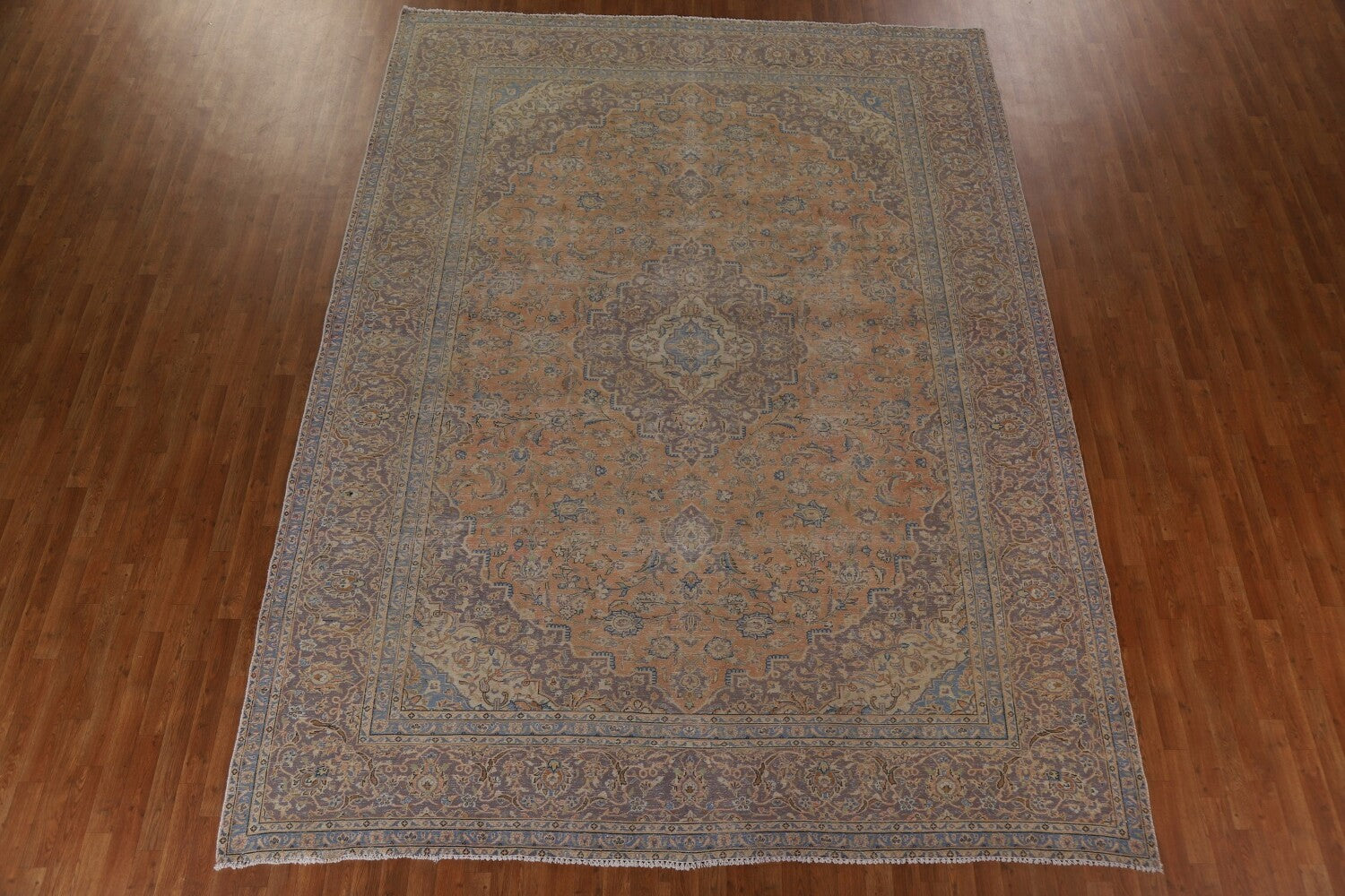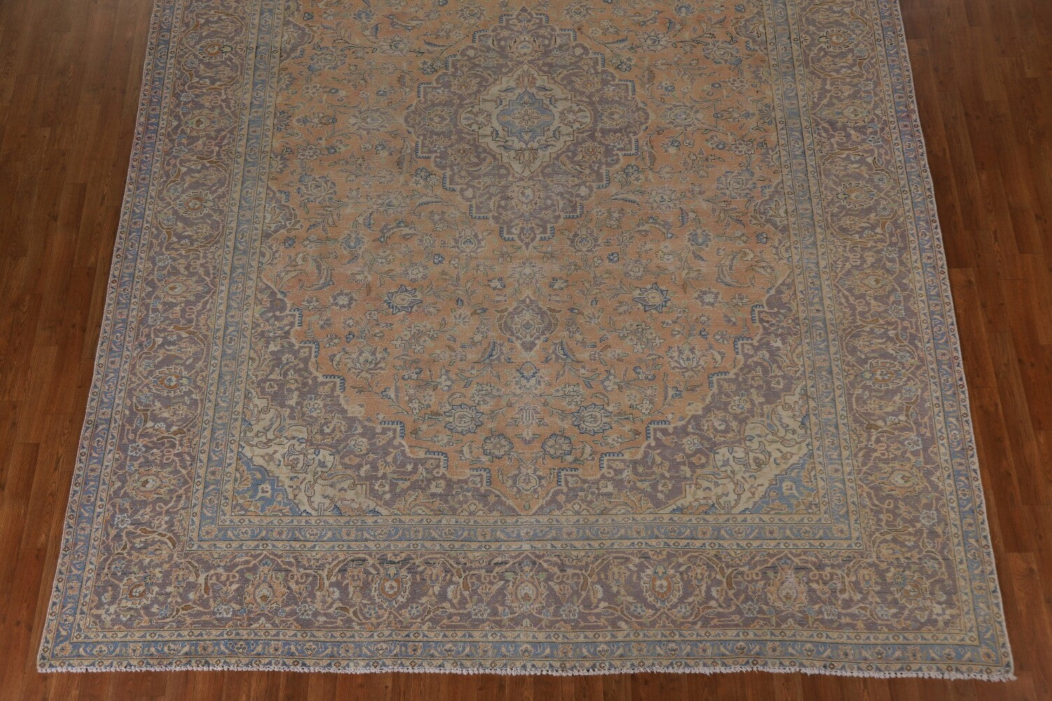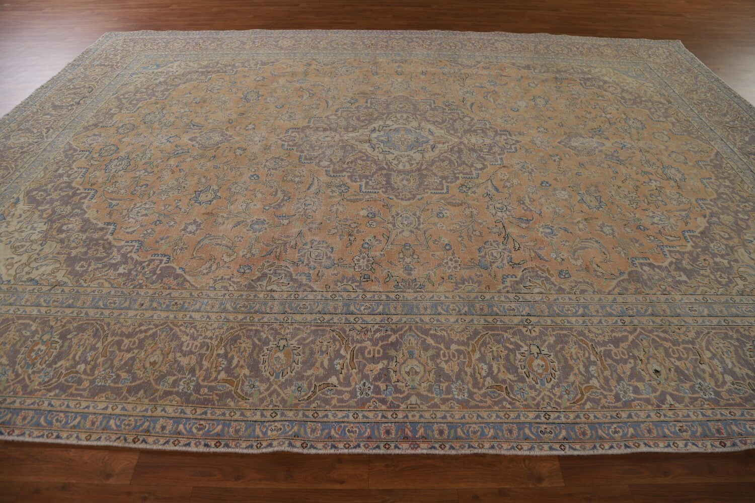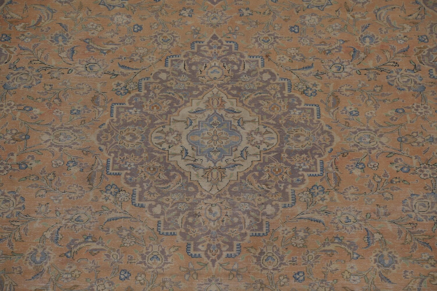 A Beautiful Genuine Persia ( Persia ) Kashan rug is Hand Knotted by skillful weavers in Persia ( Persia ) with 100% Wool Material. This rug is in Very Good (Evenly Low Pile) condition. dimensions are 12' 10'' X 9' 6'' in foot and 391 X 290 in centimeter. the primary color is Coral.