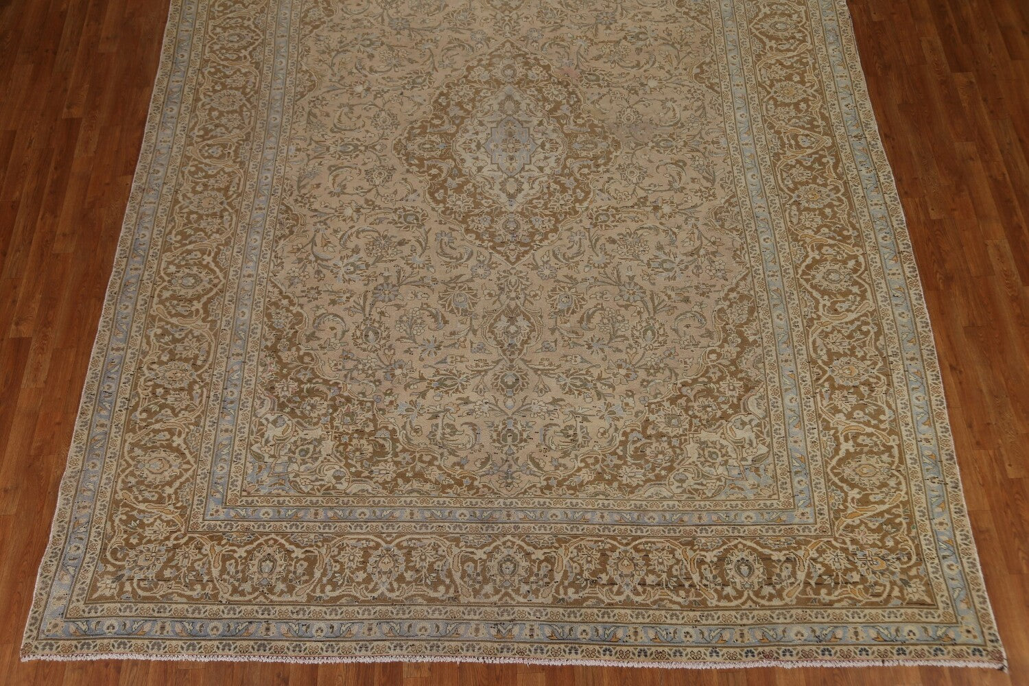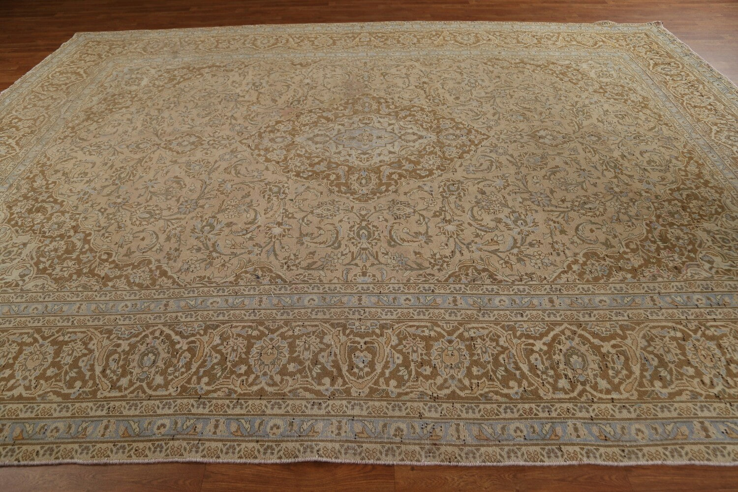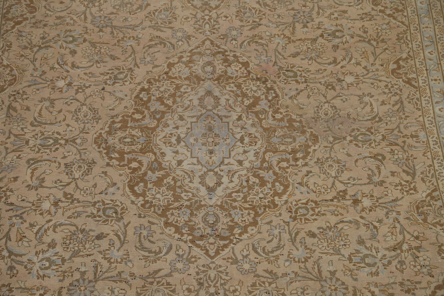 A Beautiful Genuine Persia ( Persia ) Kashan rug is Hand Knotted by skillful weavers in Persia ( Persia ) with 100% Wool Material. This rug is in Very Good (Low Pile-Repair) condition. dimensions are 12' 9'' X 9' 6'' in foot and 389 X 290 in centimeter. the primary color is Peach.