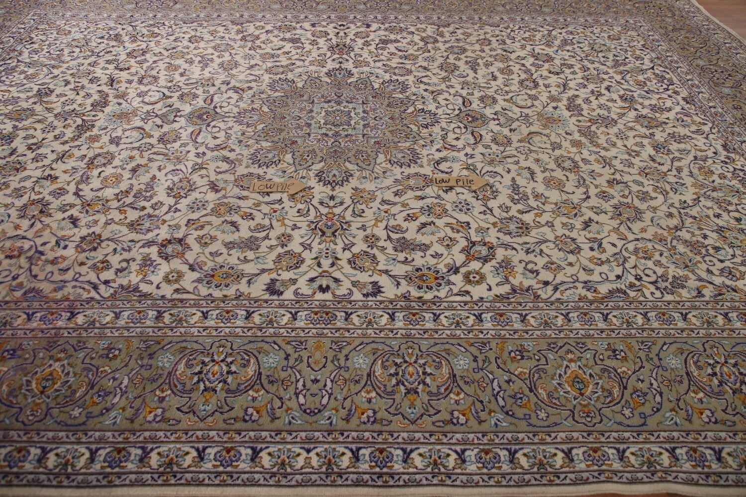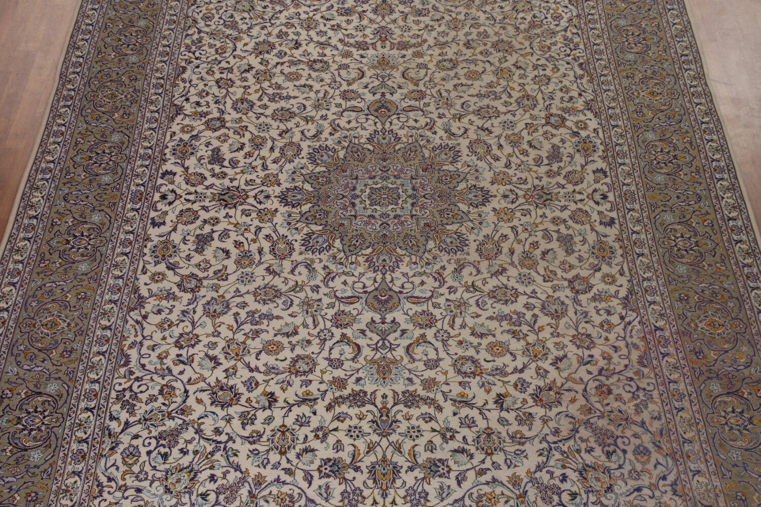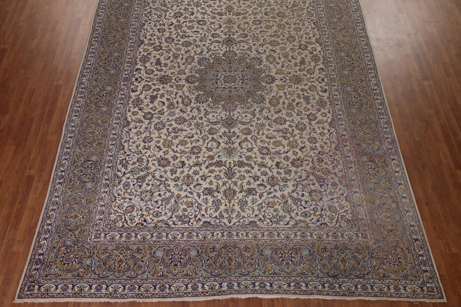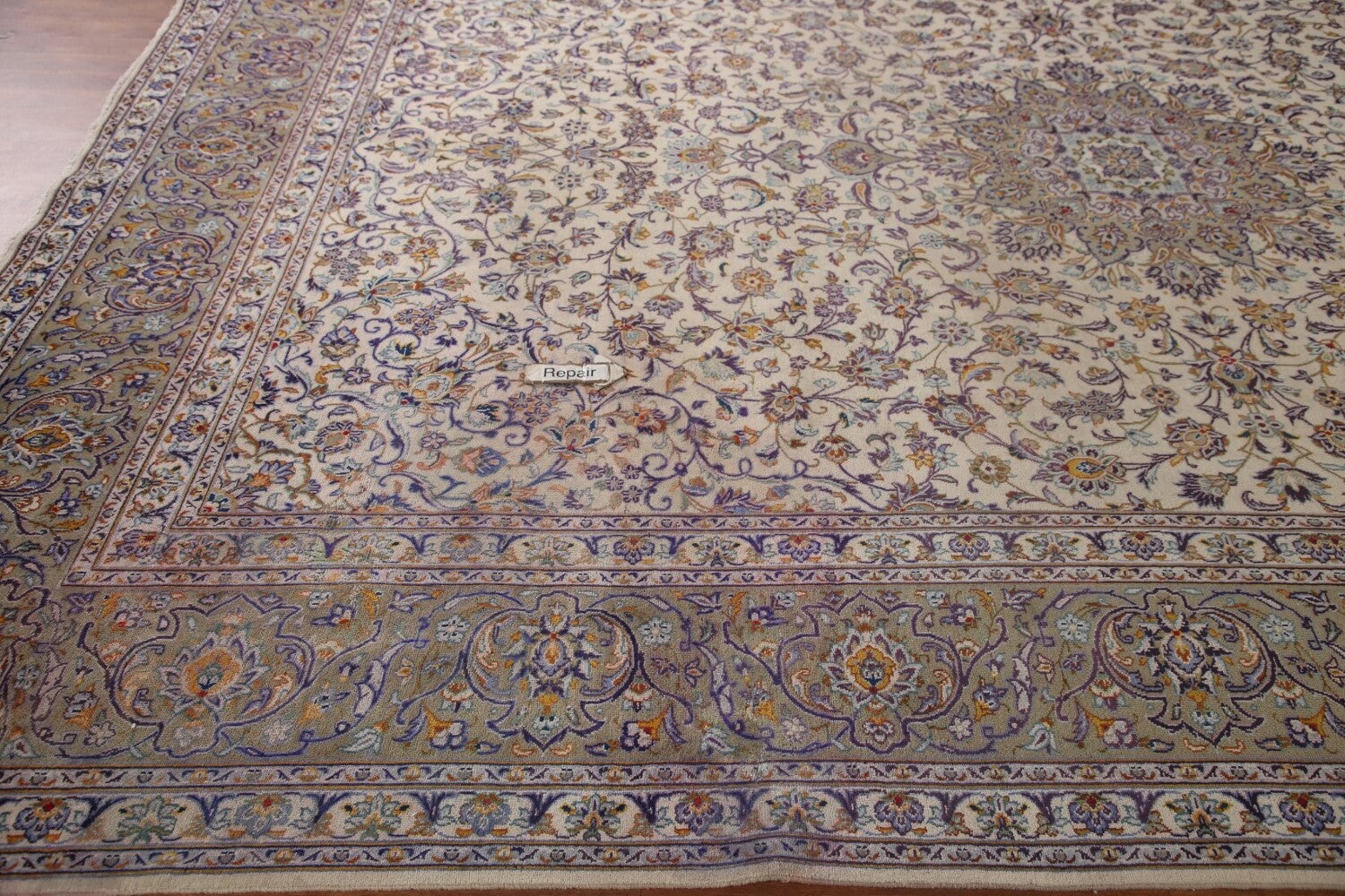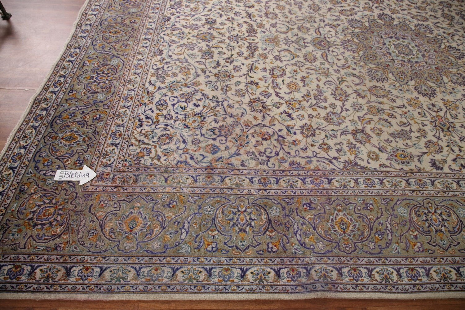 A Beautiful Genuine Persia ( Persia ) Kashan rug is Hand Knotted by skillful weavers in Persia ( Persia ) with 100% Wool Material. This rug is in Very Good (Low Pile-Bleeding) condition. dimensions are 13' 5'' X 9' 9'' in foot and 409 X 297 in centimeter. the primary color is Beige & Ivories.