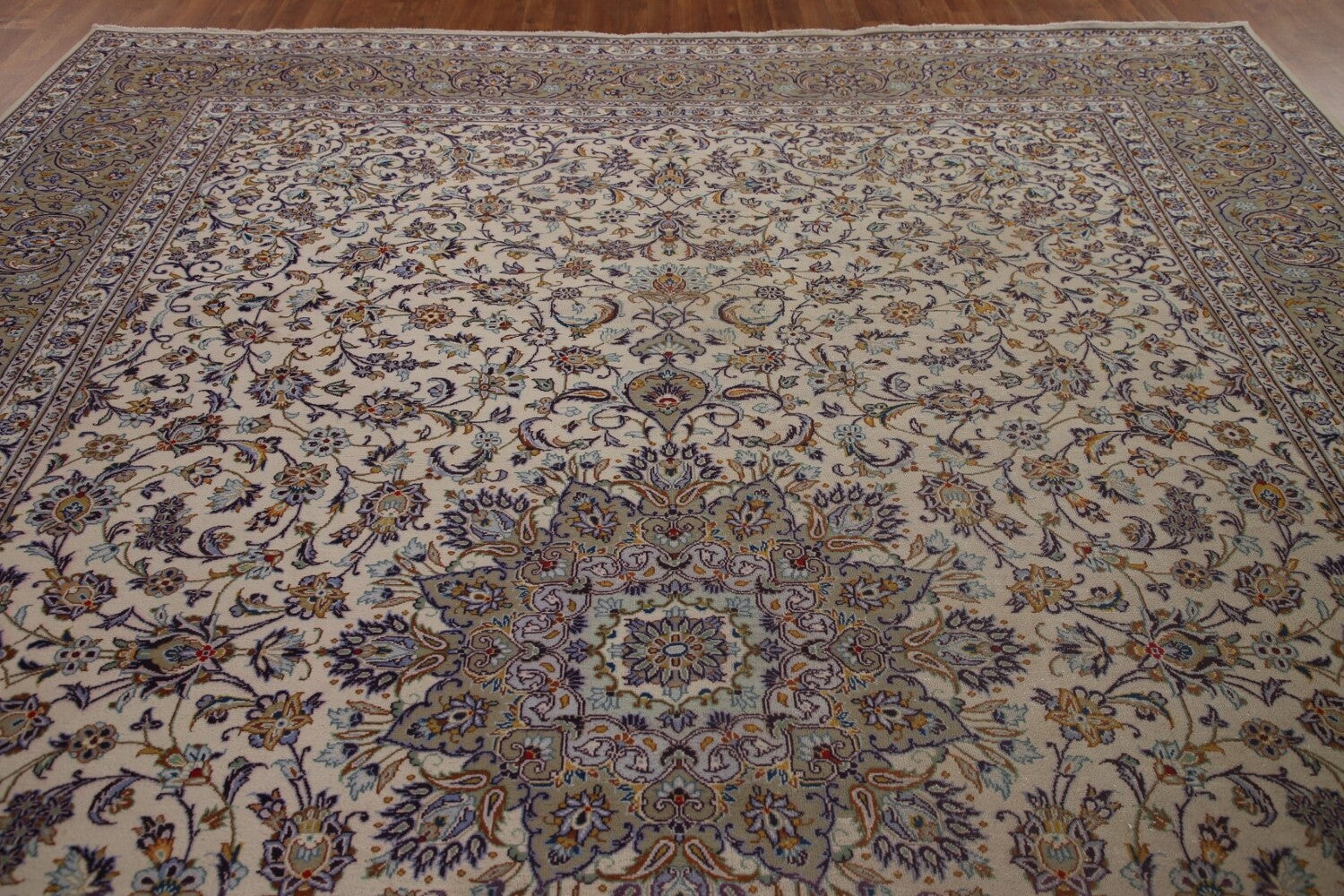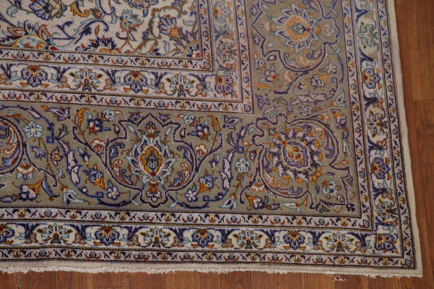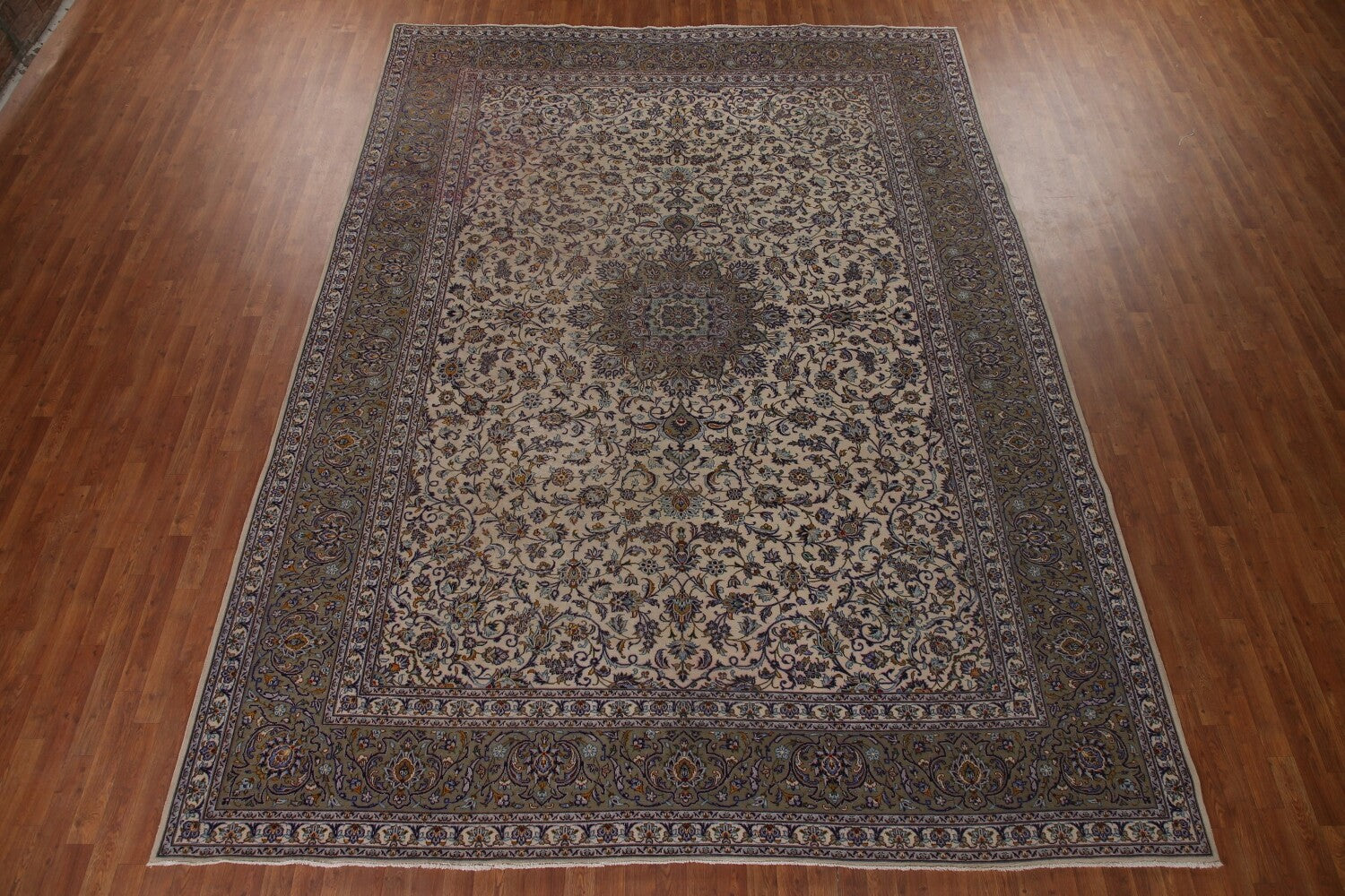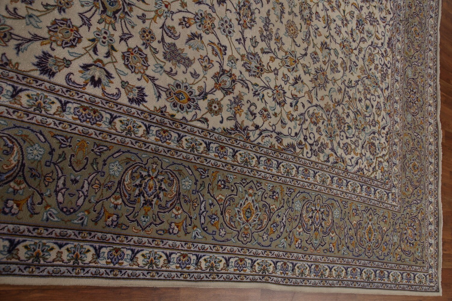 A Beautiful Genuine Persia ( Persia ) Kashan rug is Hand Knotted by skillful weavers in Persia ( Persia ) with 100% Wool Material. This rug is in Very Good (Low Pile-Bleeding) condition. dimensions are 13' 5'' X 9' 9'' in foot and 409 X 297 in centimeter. the primary color is Beige & Ivories.