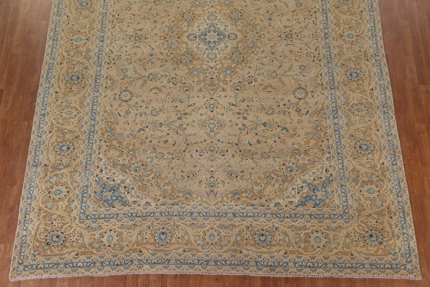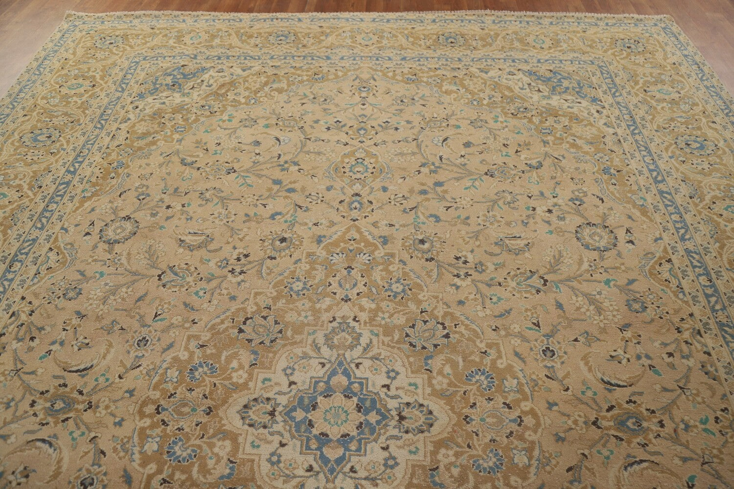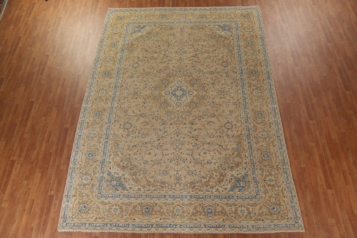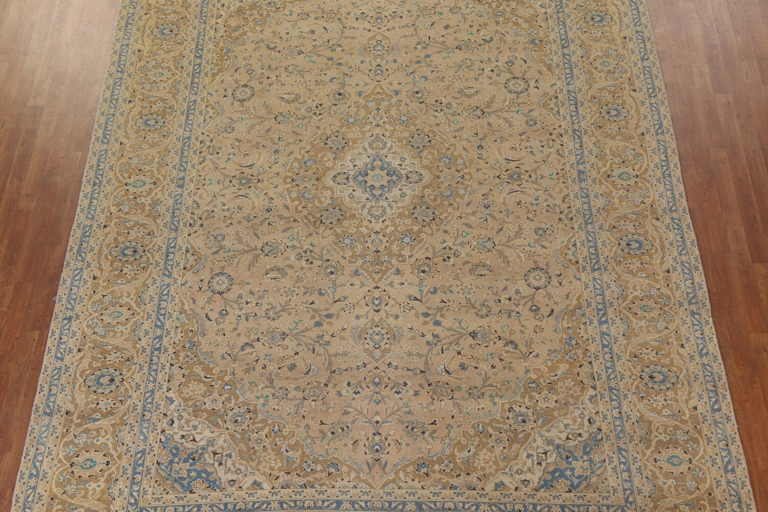 A Beautiful Genuine Persia ( Persia ) Kashan rug is Hand Knotted by skillful weavers in Persia ( Persia ) with 100% Wool Material. This rug is in Very Good (Low Pile) condition. dimensions are 13' 3'' X 9' 8'' in foot and 404 X 295 in centimeter. the primary color is Beige & Ivories.