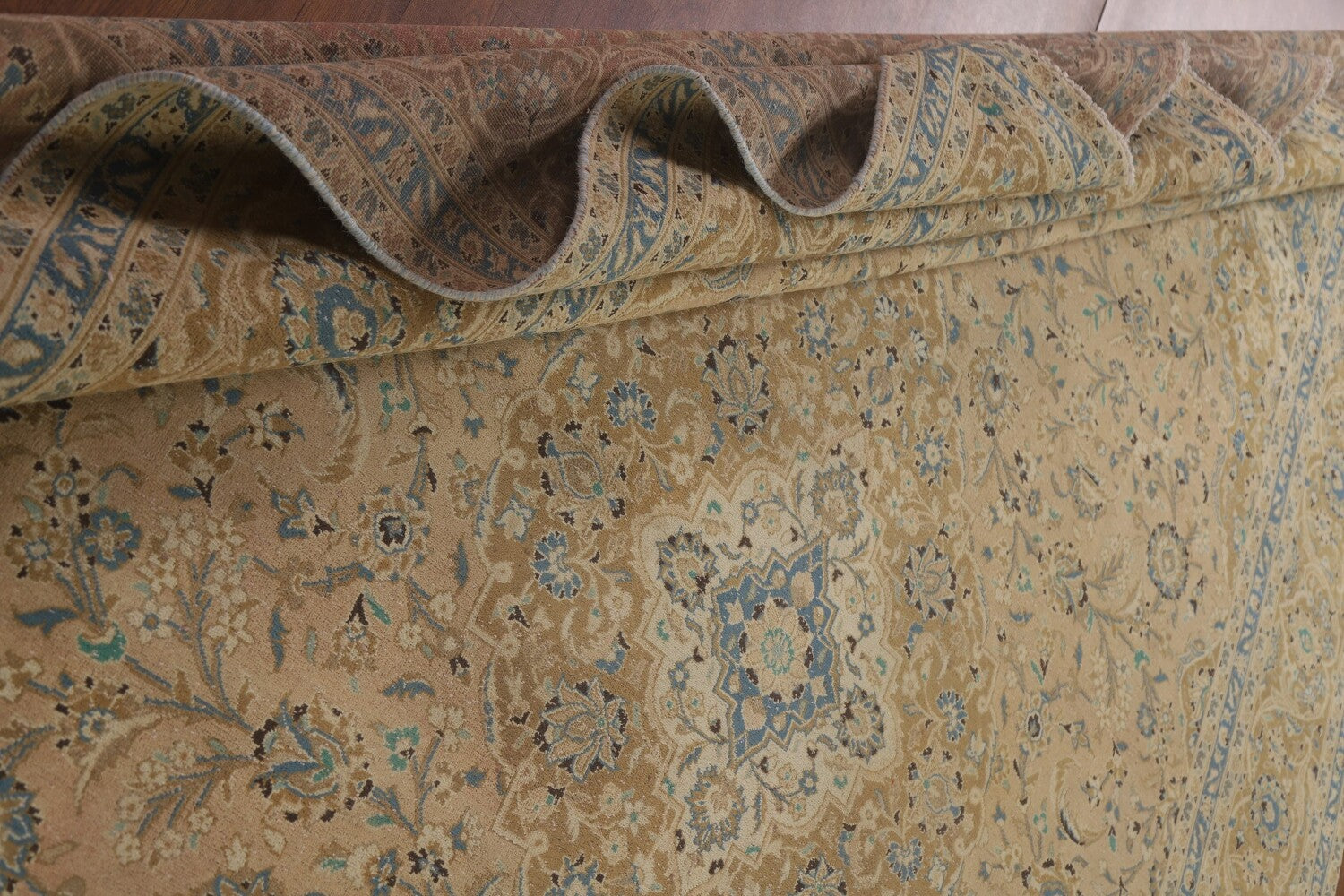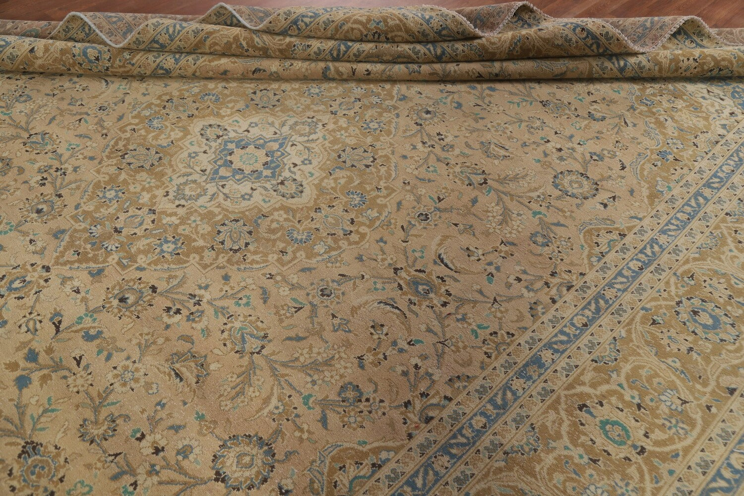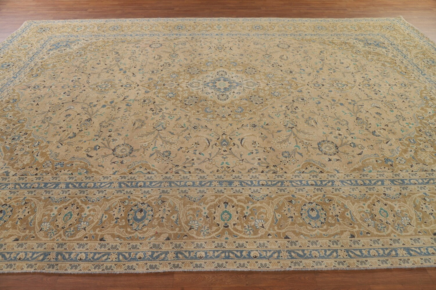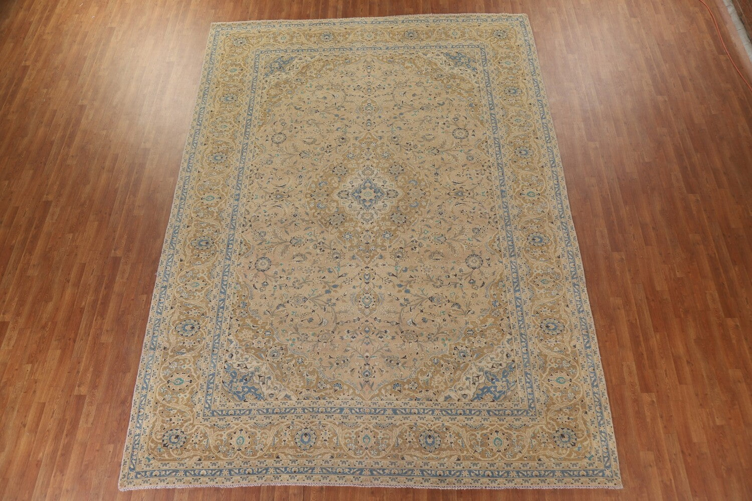 A Beautiful Genuine Persia ( Persia ) Kashan rug is Hand Knotted by skillful weavers in Persia ( Persia ) with 100% Wool Material. This rug is in Very Good (Low Pile) condition. dimensions are 13' 3'' X 9' 8'' in foot and 404 X 295 in centimeter. the primary color is Beige & Ivories.