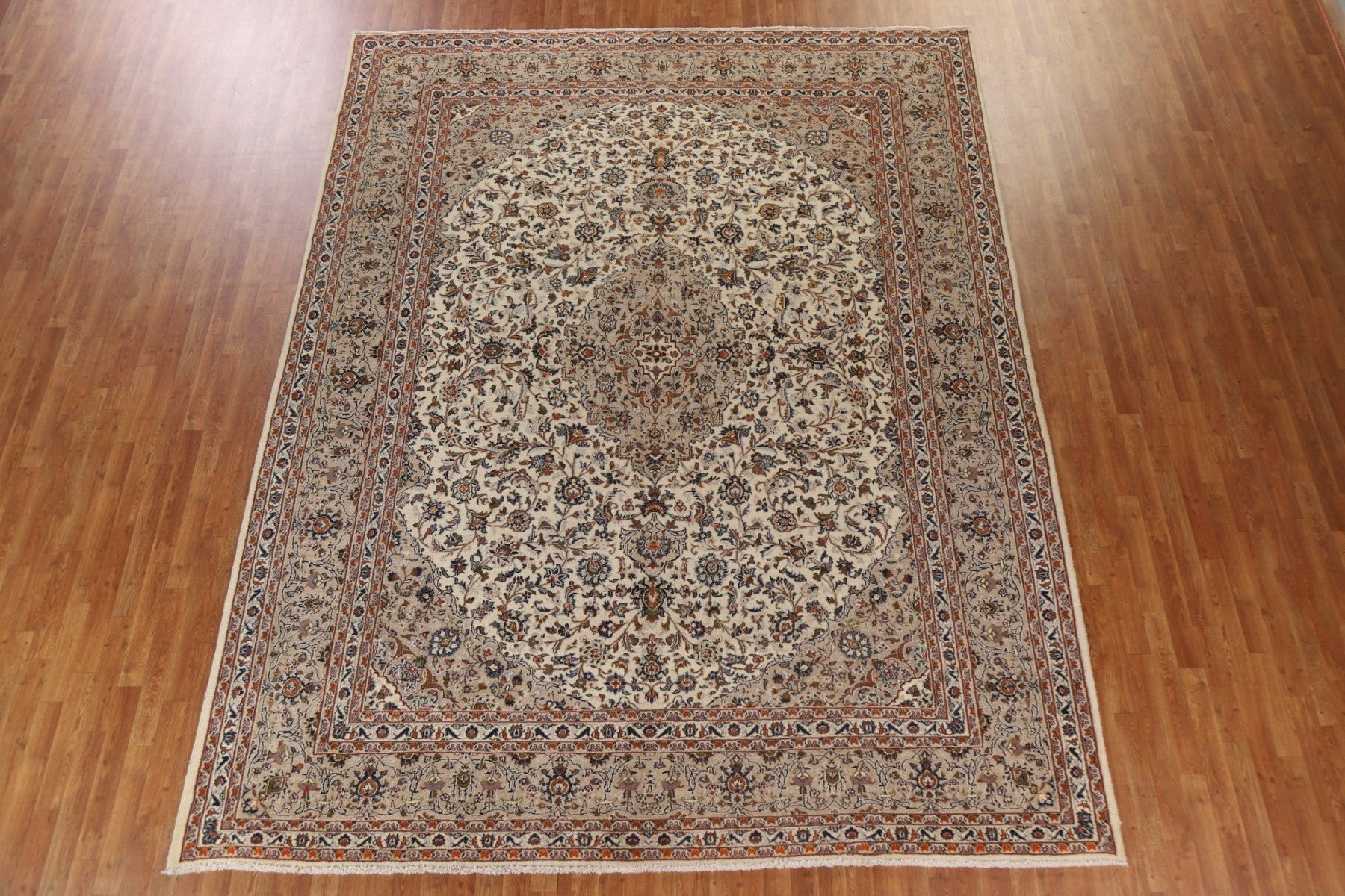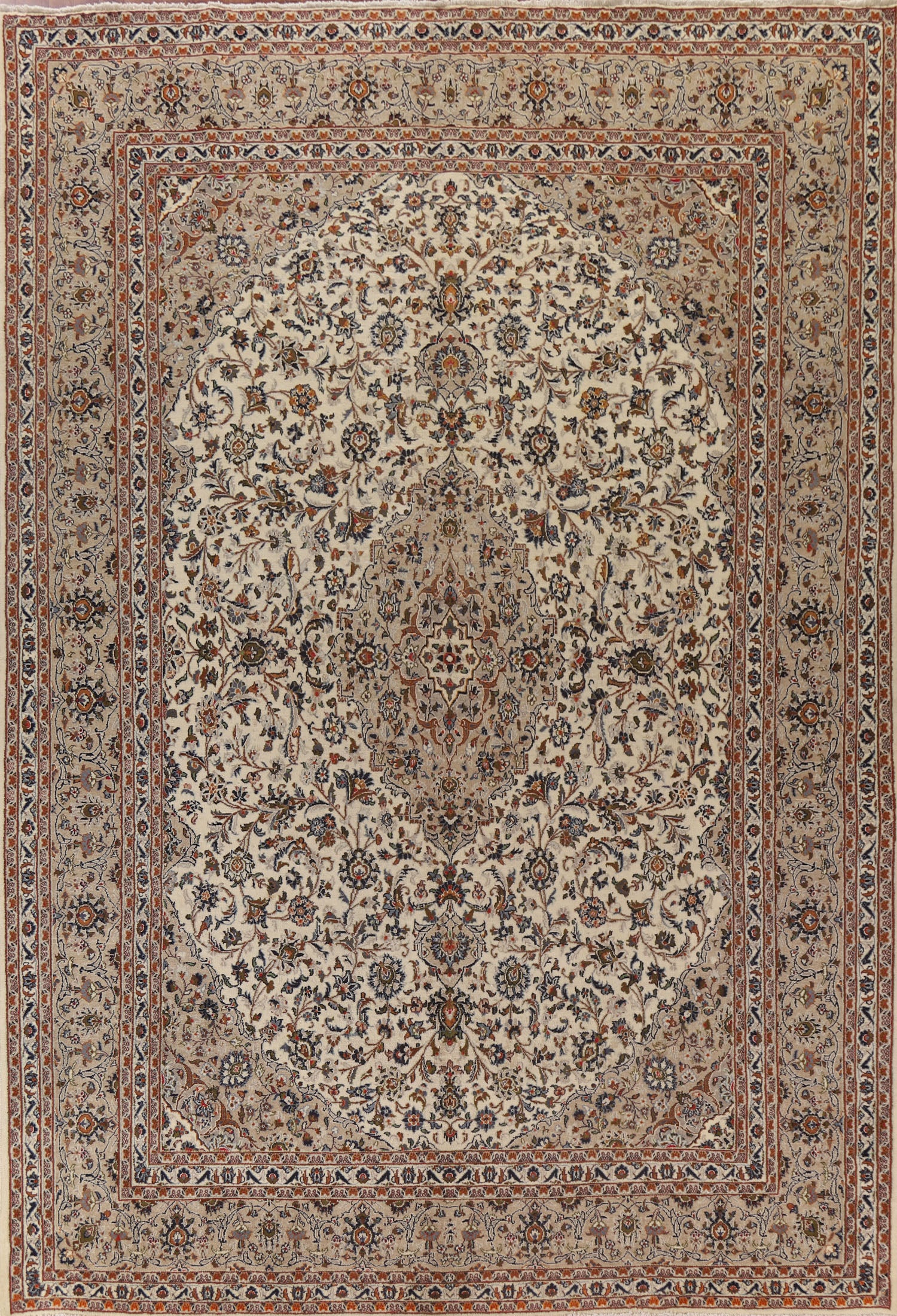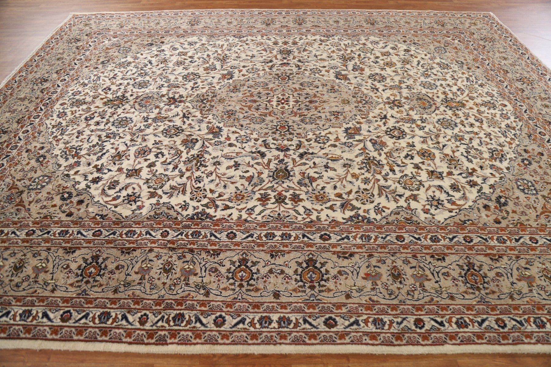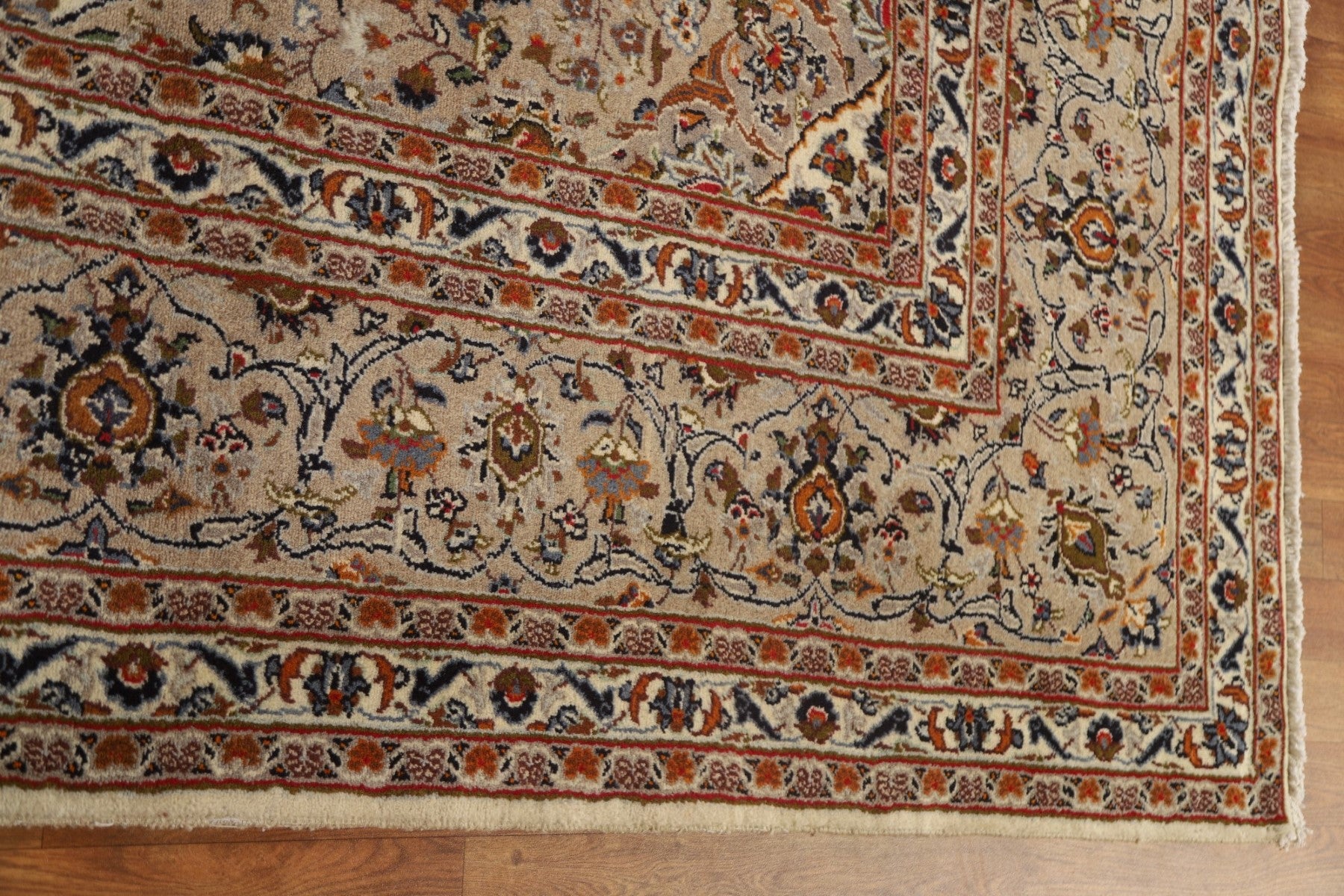 A Beautiful Genuine Persia ( Persia ) Kashan rug is Hand Knotted by skillful weavers in Persia ( Persia ) with 100% Wool Material. This rug is in Good (Low Pile) condition. dimensions are 12' 6'' X 9' 9'' in foot and 381 X 297 in centimeter. the primary color is Beige & Ivories.