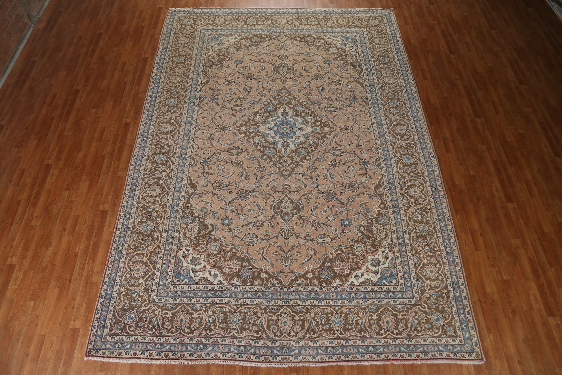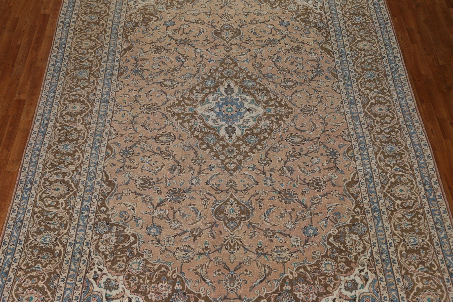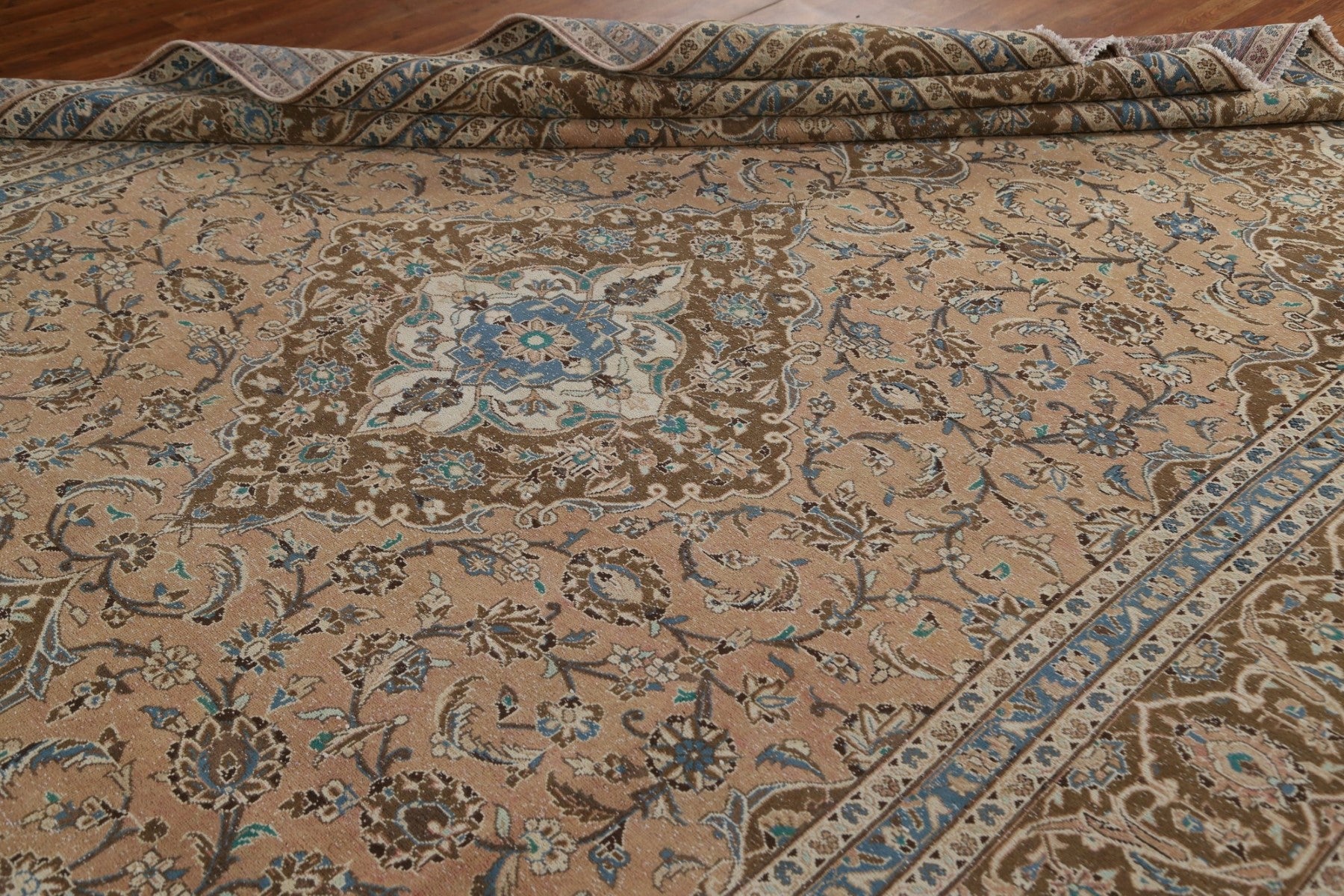 A Beautiful Genuine Persia ( Persia ) Kashan rug is Hand Knotted by skillful weavers in Persia ( Persia ) with 100% Wool Material. This rug is in Very Good (Evenly Low Pile) condition. dimensions are 13' 9'' X 9' 7'' in foot and 419 X 292 in centimeter. the primary color is Peach.