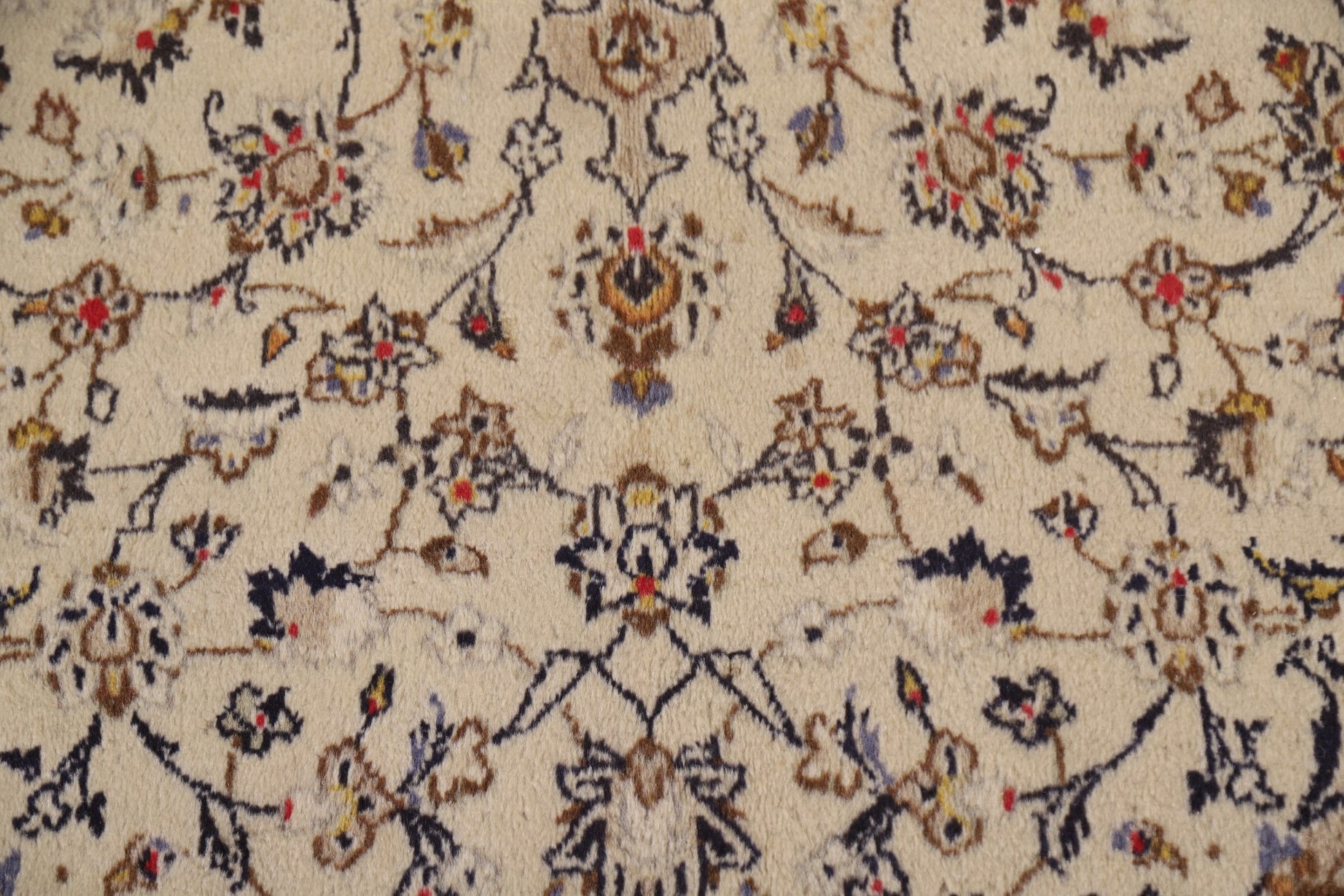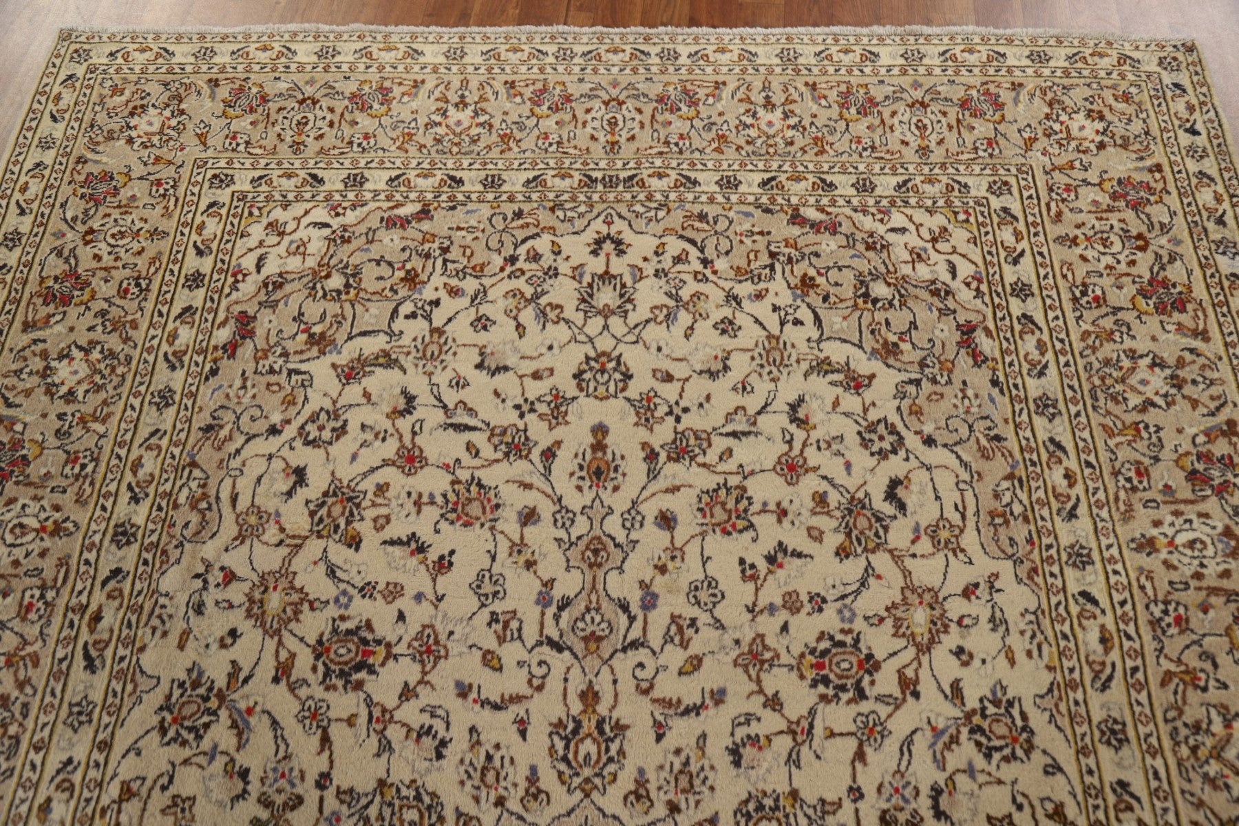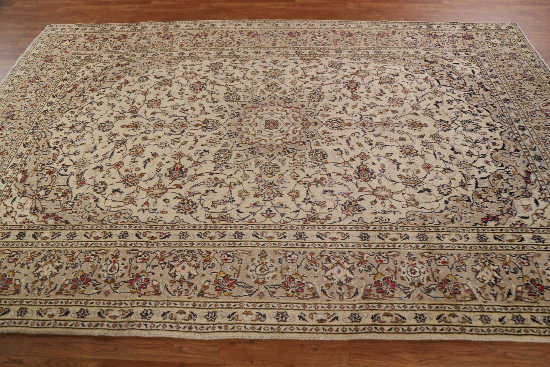 A Beautiful Genuine Persia ( Persia ) Kashan rug is Hand Knotted by skillful weavers in Persia ( Persia ) with 100% Wool Material. This rug is in Very Good condition. dimensions are 10' 0'' X 6' 5'' in foot and 305 X 196 in centimeter. the primary color is Beige & Ivories.