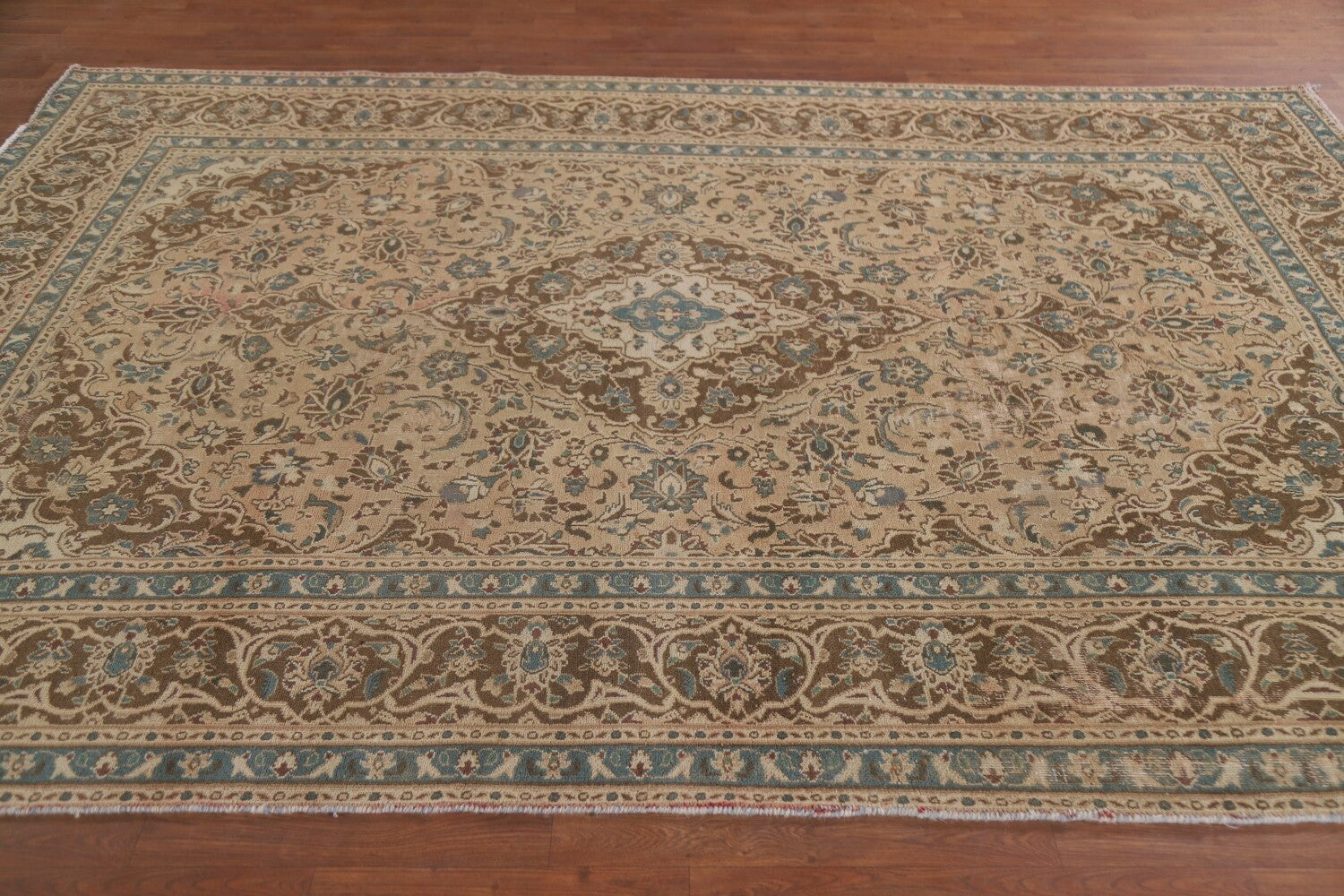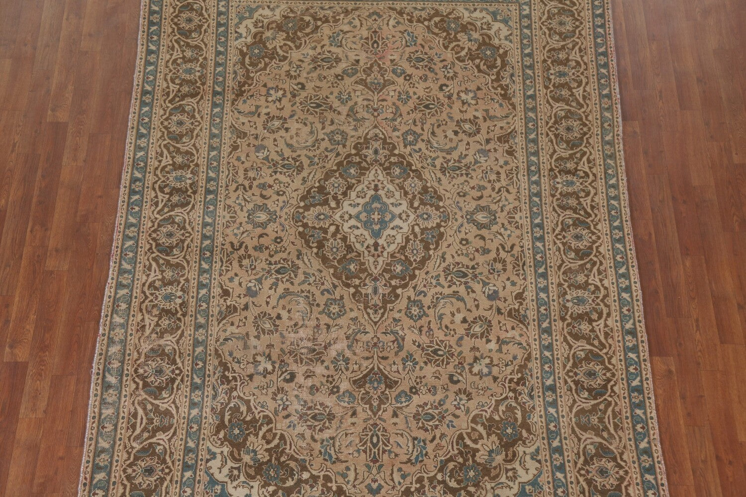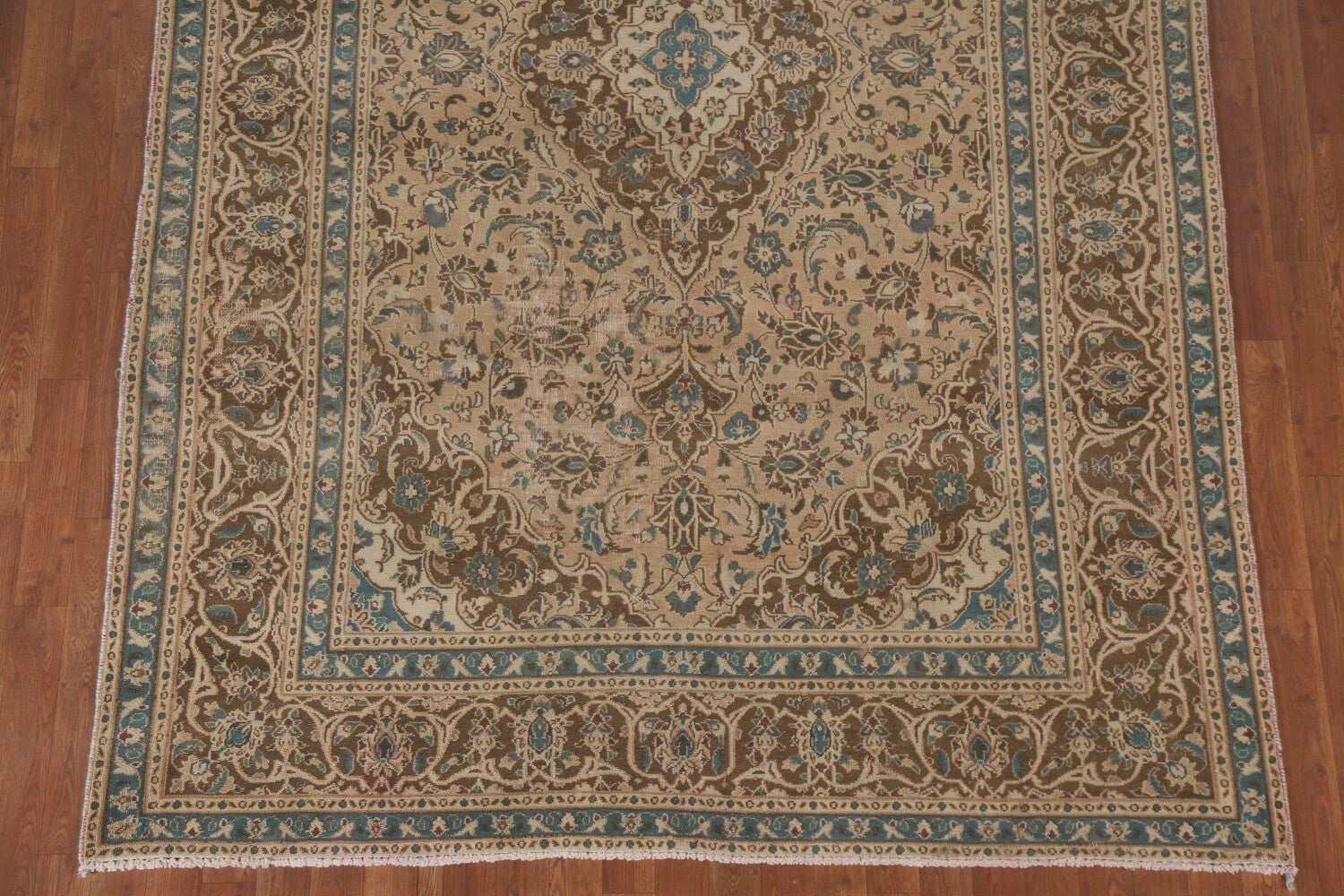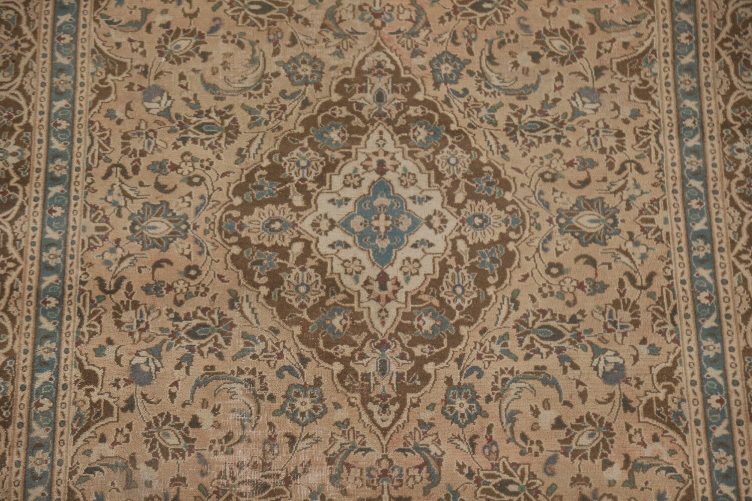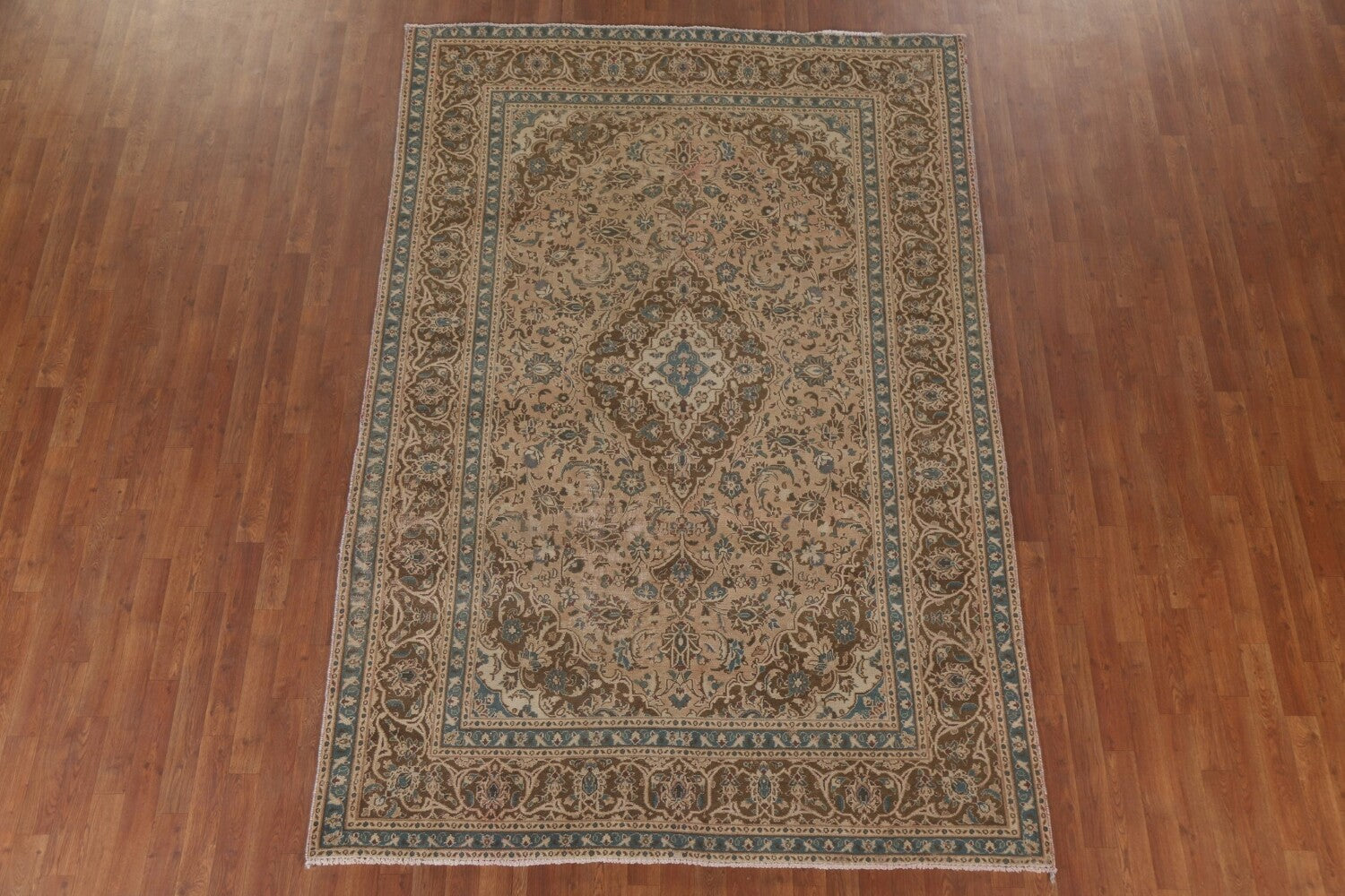 A Beautiful Genuine Persia ( Persia ) Kashan rug is Hand Knotted by skillful weavers in Persia ( Persia ) with 100% Wool Material. This rug is in Very Good (Low Pile-Abrash) condition. dimensions are 9' 4'' X 6' 3'' in foot and 284 X 191 in centimeter. the primary color is Beige & Ivories.