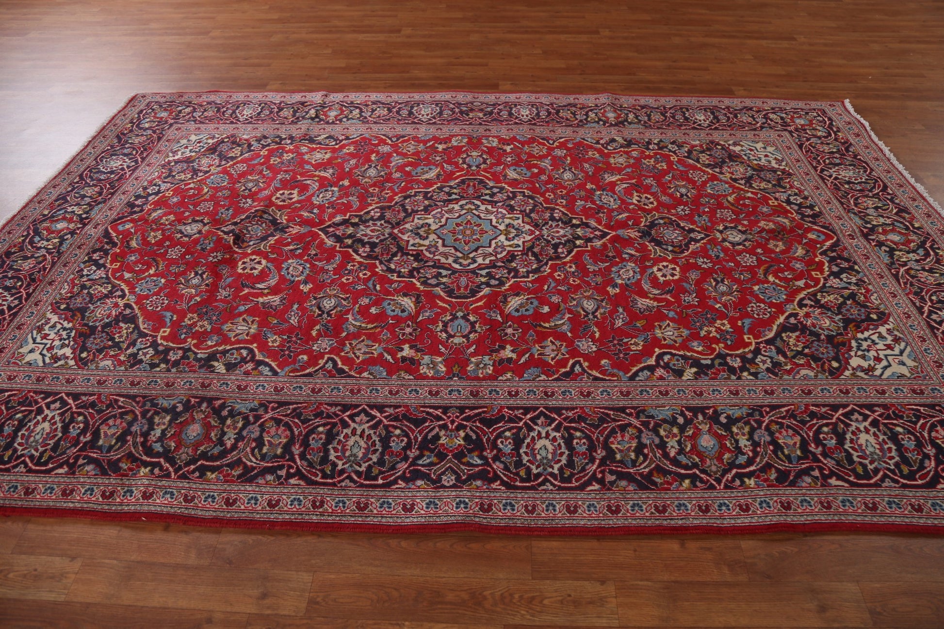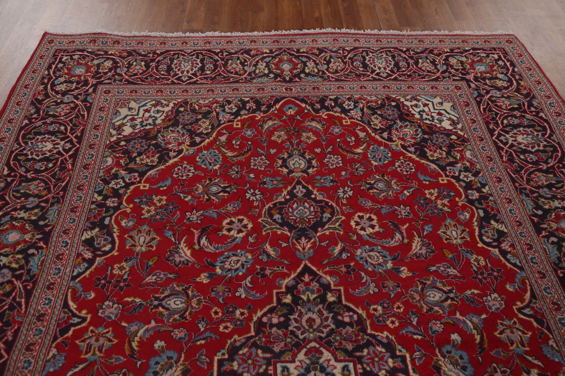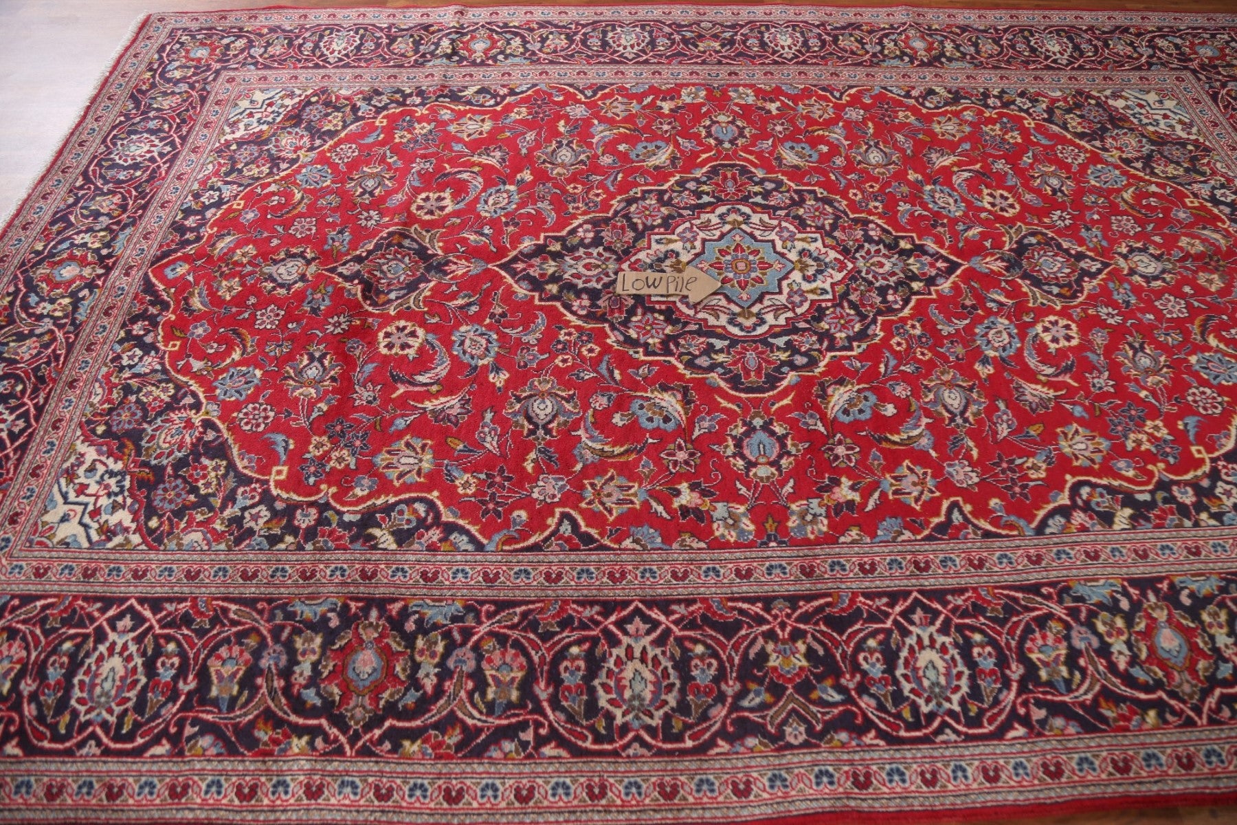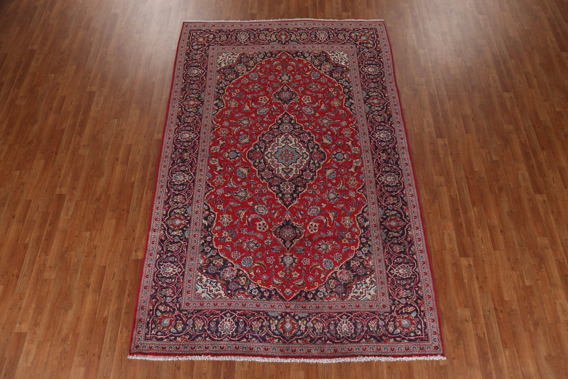 A Beautiful Genuine Persia ( Persia ) Kashan rug is Hand Knotted by skillful weavers in Persia ( Persia ) with 100% Wool Material. This rug is in Very Good ( Low Pile ) condition. dimensions are 9' 11'' X 6' 6'' in foot and 302 X 198 in centimeter. the primary color is Red.