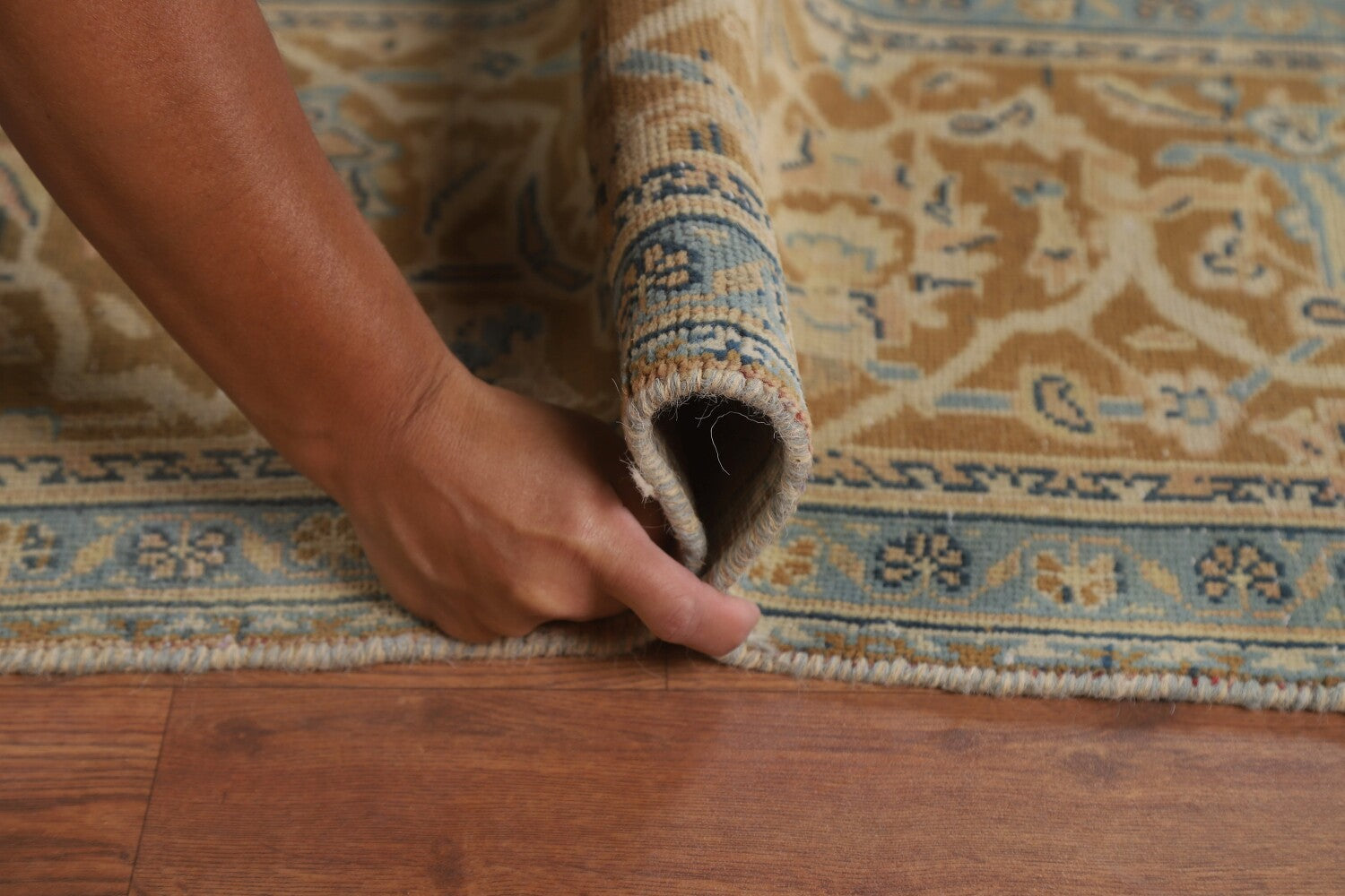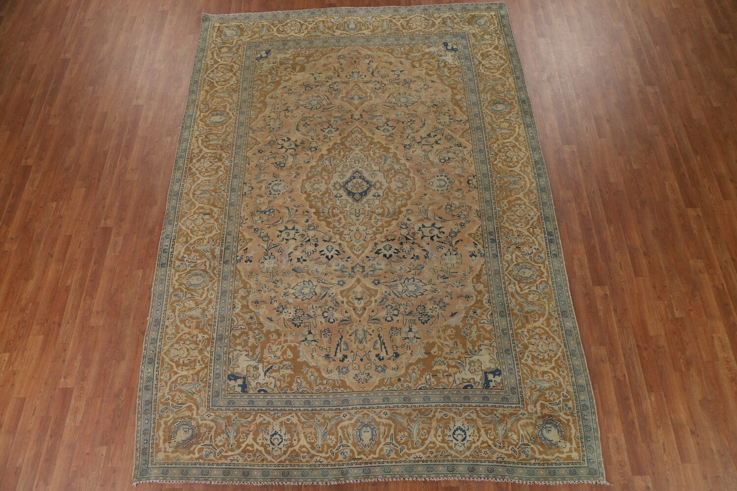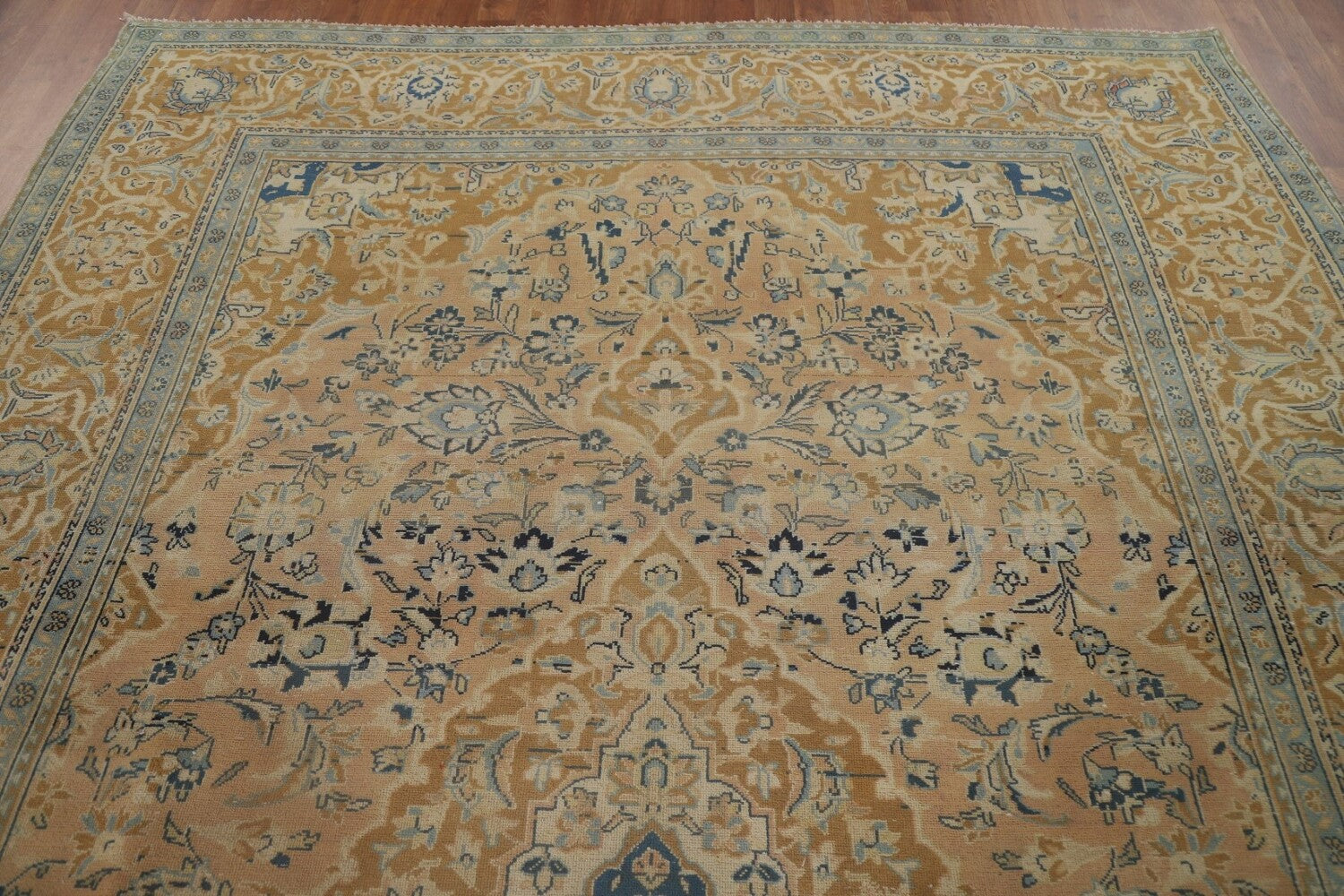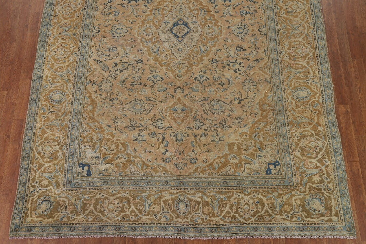 A Beautiful Genuine Persia ( Persia ) Kashan rug is Hand Knotted by skillful weavers in Persia ( Persia ) with 100% Wool Material. This rug is in Very Good (Low Pile-Abrash) condition. dimensions are 11' 2'' X 7' 10'' in foot and 340 X 239 in centimeter. the primary color is Peach.